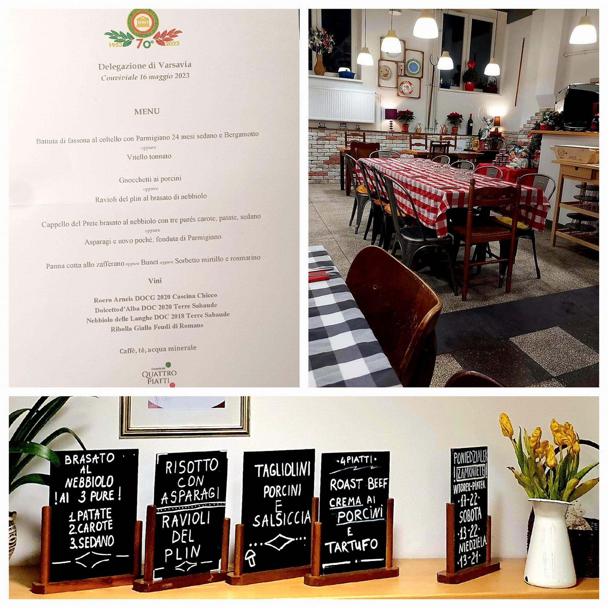 La Delegazione di Varsavia ha vissuto un'esperienza culinaria straordinaria presso il ristorante Quattro Piatti. Con lo chef Enzo Saccomani ai fornelli e alla presenza di S.E. l’Ambasciatore Luca Fraschetti Pardo, è stato degustato un menu eccezionale: dalla battuta di fassona al coltello al cappello del prete brasato, ogni piatto era un'opera d'arte. I dessert, come la panna cotta allo zafferano e il sorbetto mirtillo e rosmarino, hanno concluso magnificamente la serata. L'ospitalità e l'attenzione ai dettagli dello staff hanno reso l'atmosfera fuori dall’ordinario.
