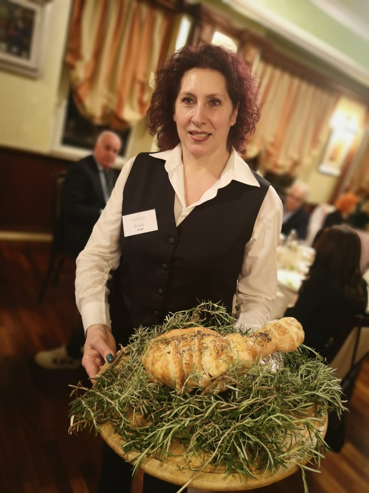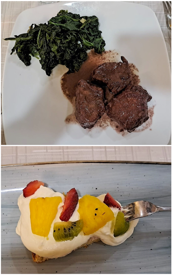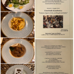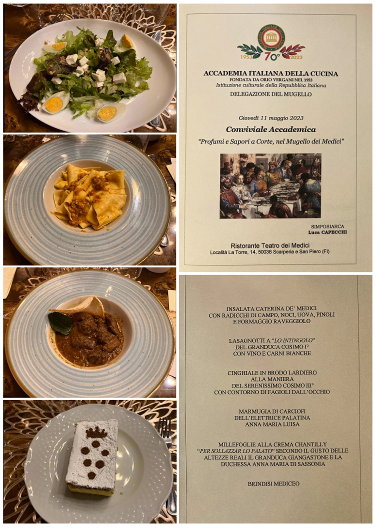 La Delegazione si è riunita presso il ristorante Teatro dei Medici a Scarperia e San Piero (FI), dove è stato festeggiato l’ingresso di cinque nuovi Accademici: Libuse Babakova, Francesca Guerra, Maria Chiara Vitartali (foto 1), Orazio Guerra e Pasquale Petrone (foto 2), che hanno ricevuto il distintivo personalmente dal Segretario Generale Roberto Ariani, gradito ospite della serata. Il tema della Conviviale “Profumi e sapori a Corte, nel Mugello dei Medici” è stato scelto dal Simposiarca Luca Capecchi (in foto 3, da sinistra Violetta Horove, il Segretario Generale Ariani, la Delegata Sforzini, lo chef Paolo, il Simposiarca e il personale di sala) con l’intento di riproporre un banchetto rinascimentale e un menu ispirato alla mensa dei Medici che, originari del Mugello, rappresentano una grande pagina di storia del territorio (foto 4 i piatti). Una serata significativa, che ha catturato i numerosi presenti anche per l’ambientazione e per l’atmosfera che si è creata, durante la quale il cuoco Paolo Horove e la moglie Violetta sono stati particolarmente apprezzati.