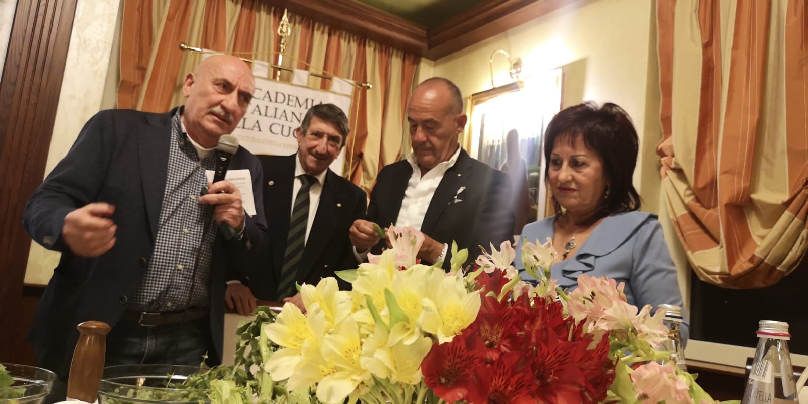 La Delegazione di Sulmona il 6 maggio si è riunita presso l'Hotel Ovidius per una Conviviale di primavera sul tema "I fiori eduli". Organizzatrice e Simposiarca della serata l'Accademica Rosa Giammarco. Il relatore, dott lorenzo Palazzoli, ha sapientemente intrattenuto Accademici ed ospiti. Foto 1. Delegato, Simposiarca, relatore e cuoco Domenico. Foto 2. Menù. Foto 3. Chitarrina all'ortica; gelatina di fragole con panna e menta selvatica. Foto 4. Cosciotto d'agnello in crosta alle erbe del Morrone.