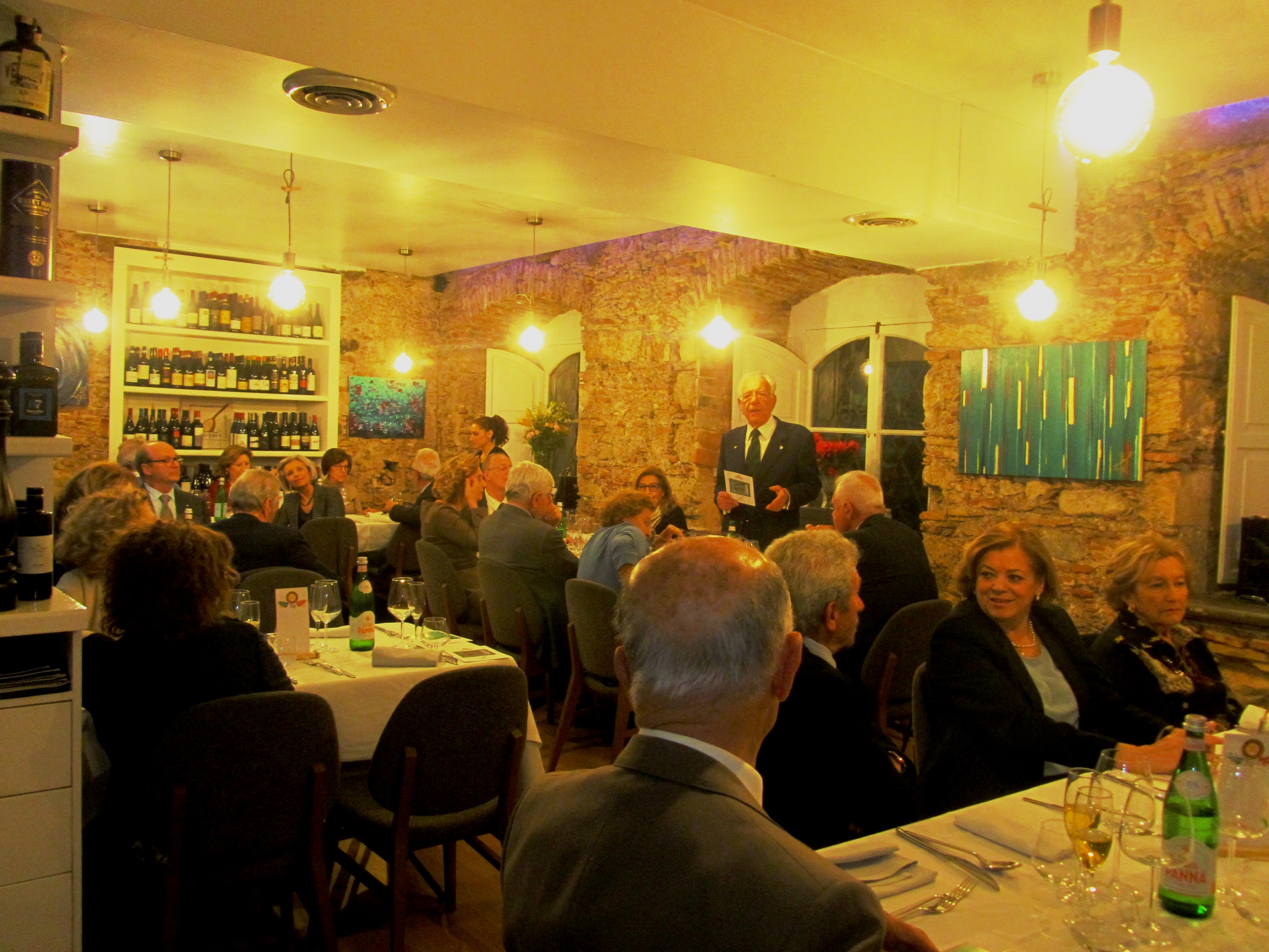 Esito positivo della conviviale organizzata dall’Accademico Carlo Pellegrini (foto 1) che ha condotto la Delegazione all'Enoteca Bonfanti, un questo locale nuovo per gli Accademici, accolti in sala riservata con cortesia ed efficienza. La cena con menù di carne non è stata troppo affollata (foto 2), forse per la ritrosia di alcuni alle novità. La valutazione è stata complessivamente positiva, con qualche riserva sull’antipasto; buoni e apprezzati gli altri piatti; lodati, come previsto, i vini (con cambio di bicchiere per ognuno), ben accostati alle diverse portate (foto 3. Sformatino di funghi e verdure su crema saporita; spaghetti con il germe di grano al ragù di cinta senese; filetto di maiale cotto nel Chianti Classico; trancio di pan di Spagna con crema al mascarpone e frutta fresca). Sollecito e curato il servizio. Al termine, il Simposiarca ha tenuto una breve conversazione sull’accurato positivo esperimento sulla cottura della pasta “a fuoco spento”, e dissipato alcune riserve sulle piastre a induzione ed il forno a microonde. Il Delegato lo ha ringraziato, così come gli altri partecipanti, e dato appuntamento per il 18 maggio, all’Istituto Alberghiero, per festeggiare il 40° anniversario della Delegazione.