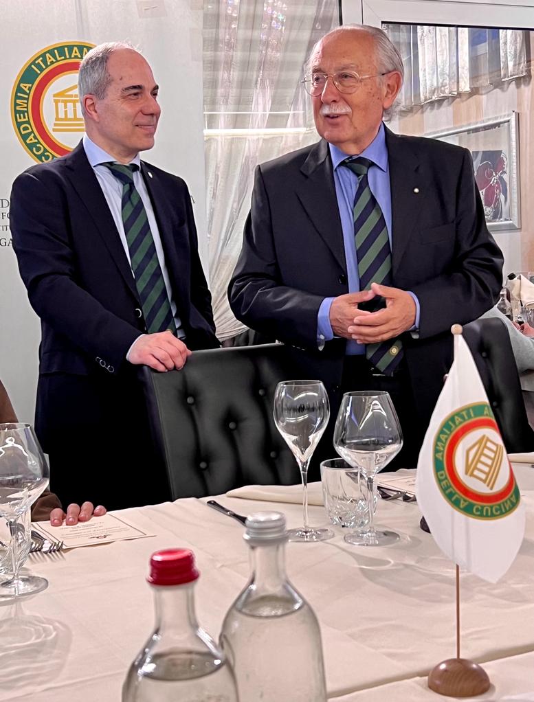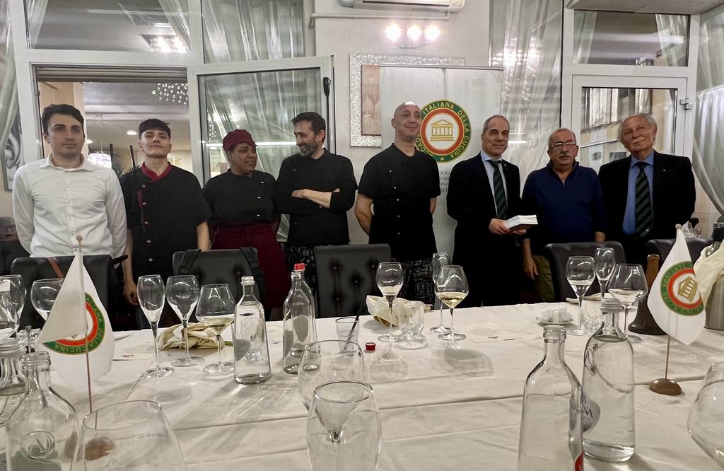 In occasione di una gita a Subiaco per una visita al “Sacro Speco”, le Delegazioni di Roma e Roma Nomentana, guidate rispettivamente dai Delegati Gabriele Gasparro e Alessandro Di Giovanni, si sono riunite in una conviviale presso il “Palazzo Moraschi” organizzata dal Simposiarca Mauro Gaudino con il responsabile della prestigiosa struttura ricettiva Don Mario Pieracci Galante (in foto con i Delegati). Subiaco non è solo una meta di pellegrinaggio e di escursionismo ma è anche la destinazione perfetta per chi ama mangiare bene e sano. La sua cucina è a base per lo più di piatti di terra, preparati solo ed esclusivamente con prodotti e materie prime del territorio. Il menu predisposto per l’occasione ha offerto un’ampia panoramica della gastronomia del posto, servito nella sala principale del palazzo, con una accurata apparecchiatura e un servizio impeccabile. Dopo il brindisi di benvenuto è stato servito un antipasto con numerosissime specialità locali di montagna, dai formaggi ai salumi con contorni vari. Non poteva mancare come primo la specialità del luogo, “strozzapreti alla subiaciana”, seguiti da crepés alla ricotta. Il piatto forte, arrosto misto, e poi ancora trippa con fagioli all’uccelletto. Infine dolci locali, il tutto servito con ottimi vini della regione. Giornata da ricordare. Cordialità e amicizia accademica fra i partecipanti hanno decretato il successo dell’evento.