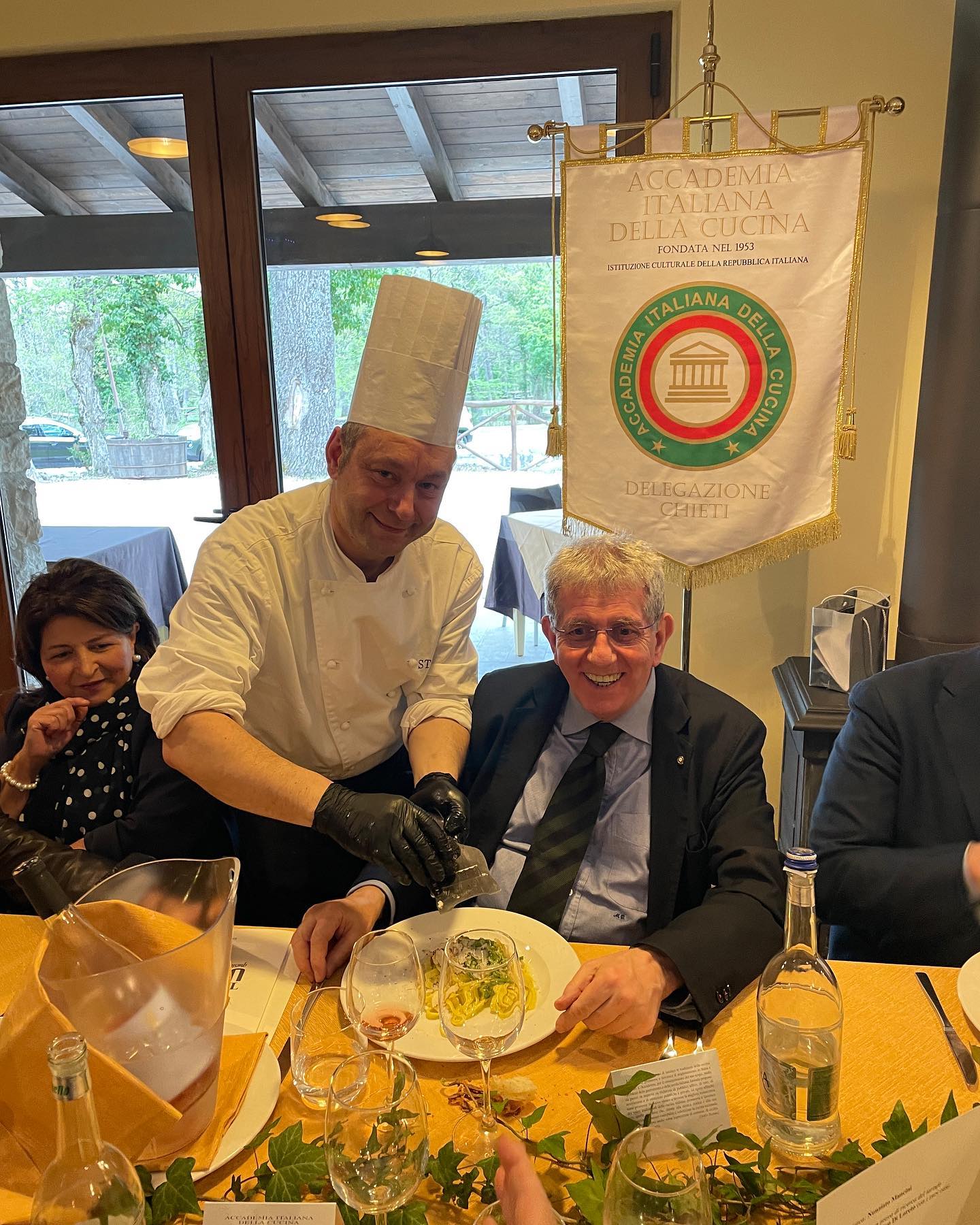 Nella parte più interna del territorio della Delegazione, la conviviale “TartUFO questo sconosciuto” organizzata presso la trattoria "Casa del Pastore Rosello", ha portato gli Accademici di Chieti alla scoperta di uno dei prodotti più importanti ma parimenti misconosciuti del Medio Sangro, che rivaleggia con le produzioni piemontesi e toscane sia per quantità sia per qualità. Il Simposiarca Nunziato Mancini, prima della conviviale, ha organizzato insieme al tartufaio Evo Di Loreto una dimostrazione di ricerca di tartufi con i cani appositamente addestrati all’interno della splendida Abetina di Rosello (foto 1). A tavola, lo chef “figlio d’arte” Elio Stanzìani (in foto 2 con il vice Presidente Vicario Mimmo D'Alessio) ha deliziato Accademici e ospiti tra profumi unici e sapori antichi, con un occhio alla modernità delle tecniche di cottura, come il braciere ofyr (foto 3). Foto 4. La brigata di cucina con il Delegato Nicola D'Auria e il vice Presidente Vicario Mimmo D'Alessio.
