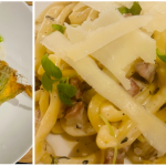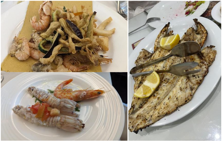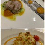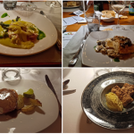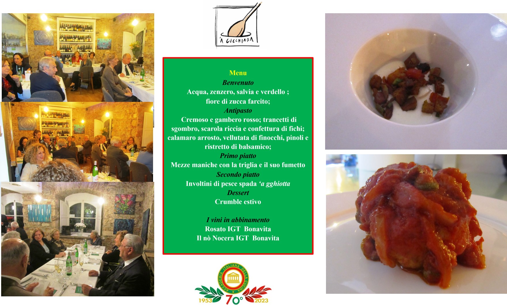 Per la conviviale di maggio, la Delegazione si è ritrovata al ristorante L’Undicesimo, in località Prulli di Sopra nel comune di Reggello. Il ristorante è gestito da Luigi Giusti, undicesimo dei figli della famiglia Giusti, da più generazioni gestori di ottimi ristoranti. Il Simposiarca Francesco Corsico (foto 1) e il cuoco Rocco De Mario, coadiuvato dal figlio di Luigi, Fabrizio Giusti, hanno scelto un menù di pesce particolarmente apprezzato sia nella qualità sia nella presentazione. Alla Delegazione è stata riservata la veranda del ristorante e la grande tavola rettangolare che ha visto i commensali tutti insieme ha favorito la partecipazione e la convivialità (foto 2). Dopo le bollicine di benvenuto, accompagnate da polenta al ragù di polpo e bignoline con gamberi, polpo fritto su pesto di zucchine e tartare di tonno con granita al limone, si sono susseguiti: agnolotti al nero di seppia ripieni di baccalà mantecato con datterino e stracciatella, coda di rospo con porri, olive taggiasche, datterini e capperi, gambero al lardo di Colonnata e verdure in agrodolce (foto 3 i piatti). La cena si è conclusa con il bis di dolci di Nadia, accompagnati da vino dolce. Tutto il menù ha ottenuto una valutazione molto alta. Al termine della serata il Delegato Sandro Fusari, insieme al Simposiarca, ha voluto ringraziare Luigi Giusti, i cuochi e tutta la brigata con parole di apprezzamento per il menù e il servizio, donando alcuni volumi dell’Accademia (foto 4).