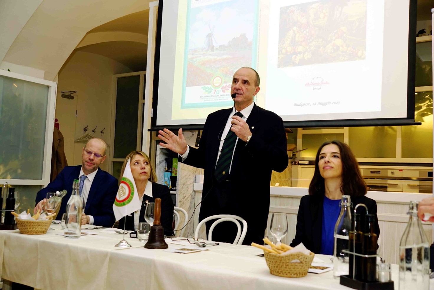 Affacciato con la sua ampia ed ombreggiata terrazza sulla centralissima Szent Istvan ter, il ristorante Akademia Italia soddisfa sia le esigenze gastronomiche della consolidata clientela locale sia quelle dei numerosi turisti di passaggio, con una ristorazione facile e veloce ma attenta alla qualità e tradizione del cibo italiano nel pieno rispetto della stagionalità dei prodotti. Il menù, sapientemente concordato tra il Simposiarca Chiara Narder e lo chef, ha pienamente risposto alle attese dei commensali per qualità dell’offerta e perfetto equilibrio di gusti. L’Accademico Carlo Volpe ha relazionato sul tema: Nutrirsi con gusto nel rispetto della stagionalità. Servizio ottimo. Eccellenti i vini serviti.