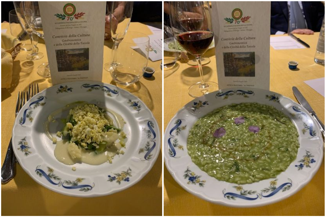 Il Convivio della Cultura è stato dedicato alle erbe e ai prodotti della primavera del territorio e per questo è stato invitato un agronomo, il prof. Fabrizio Barbieri di Adria, che ha scritto un libro sull’ argomento presentato in occasione di questa cena. La serata si è svolta all'Antica Trattoria “Al Portico” (Cona -VE) sorta negli anni 50 e gestita da sempre dalla famiglia Vegro giunta ormai alla terza generazione, con gli Accademici Giorgio Vianelli e Sergio Schiavon in qualità di Simposiarchi. Il menù, composto dai piatti tipici del locale con le erbe primaverili in evidenza, ha riscosso un ottimo apprezzamento e, oltre alla saporitissima guancia brasata al vino rosso, i piatti più graditi sono stati proprio quelli sul tema della primavera, ossia gli asparagi con uovo mimosa e crema di parmigiano e, soprattutto, il risotto di bruscandoli (luppolo selvatico) e carletti (erba silene) arricchito da una riduzione alla birra. Alla fine il Delegato Giorgio Golfetti ha consegnato tra gli applausi dei presenti un libro dell’Accademia al prof. Fabrizio Barbieri, ringraziandolo per la sua interessante relazione, e alla comproprietaria del locale Francesca Vegro, evidenziando il livello raggiunto nel corso degli anni dal ristorante e la sua fedeltà alle tradizioni del territorio.
