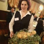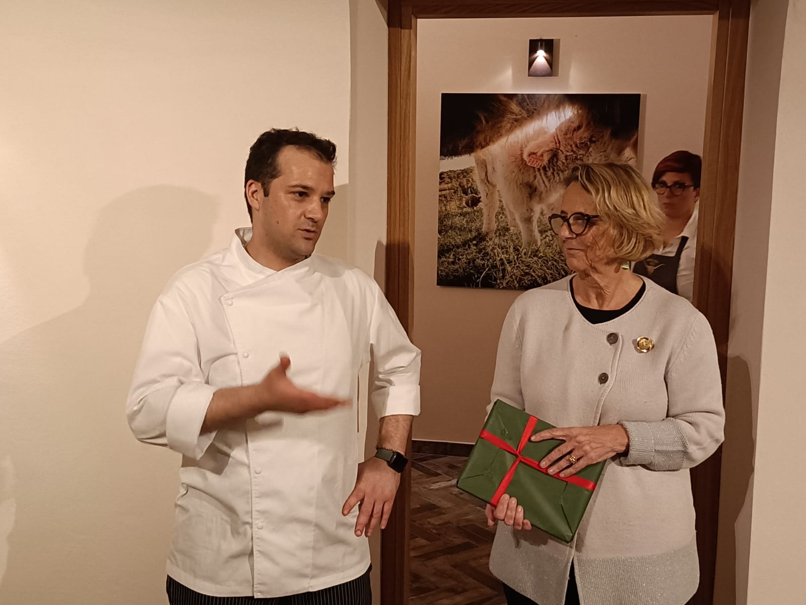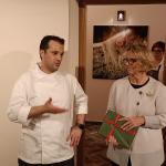 Serata dedicata alla conoscenza della razza di bovini Scottish Highland allevati nell'Azienda Agricola Montana di Giovanni Reggiani nella Baraggia Biellese. I Simposiarchi Giovanni Bonino e Gianni Maffeo (in foto 1 con la Delegata Maria Luisa Bertotto) hanno invitato il titolare Reggiani ad illustrare la storia della tenuta che lavora in modo biologico allevando non solo bovini, ma anche producendo riso Carnaroli DOP della Baraggia Biellese e Vercellese e vino Nebbiolo. Prima della cena nell'agriturismo Tenuta La Valletta (foto 2), gli Accademici hanno visitato la cantina della Cascina Piana dove si produce il Nebbiolo dell'azienda. La cena si è basata sulla carne Highland, declinata in diversi modi di cottura e di presentazione (foto 3: risotto; mini hamburger e tartare di Highland Beef Bio). Foto 4. Delegata e chef Fabio Cova.