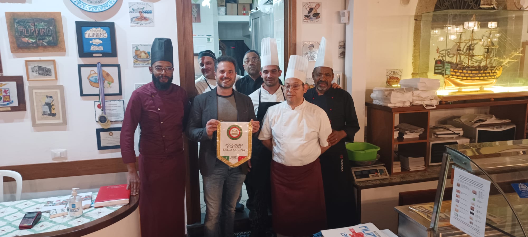 Gli Accademici si sono ritrovati in gran numero (foto 1) per lo scambio degli auguri di Pasqua, a Santa Teresa Riva, presso il ristorante Aloha Mare, da un quarto di secolo affermato nelle preparazioni di alta qualità del pescato dei mari di Sicilia, nel rispetto della stagionalità e della sostenibilità, come sottolineato dal Delegato (Foto 2). La riunione conviviale è stata introdotta da una concisa ma densa presentazione di Francesca Biondo, Direttore di Federpesca, sezione di Confindustria, che oltre ad illustrare con eleganza e chiarezza gli aspetti politici, culturali ed economici delle intraprese della pesca, ha commentato il menu proposto ai numerosi intervenuti (Foto 3). La Consulta, al completo, dato l’unanime entusiastico apprezzamento della proposta dello chef, ha voluto consegnare a Giovanni Tono la vetrofania e il piatto d’argento dell’Accademia (Foto 4).
