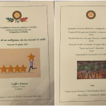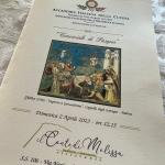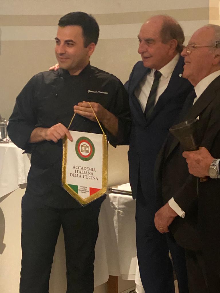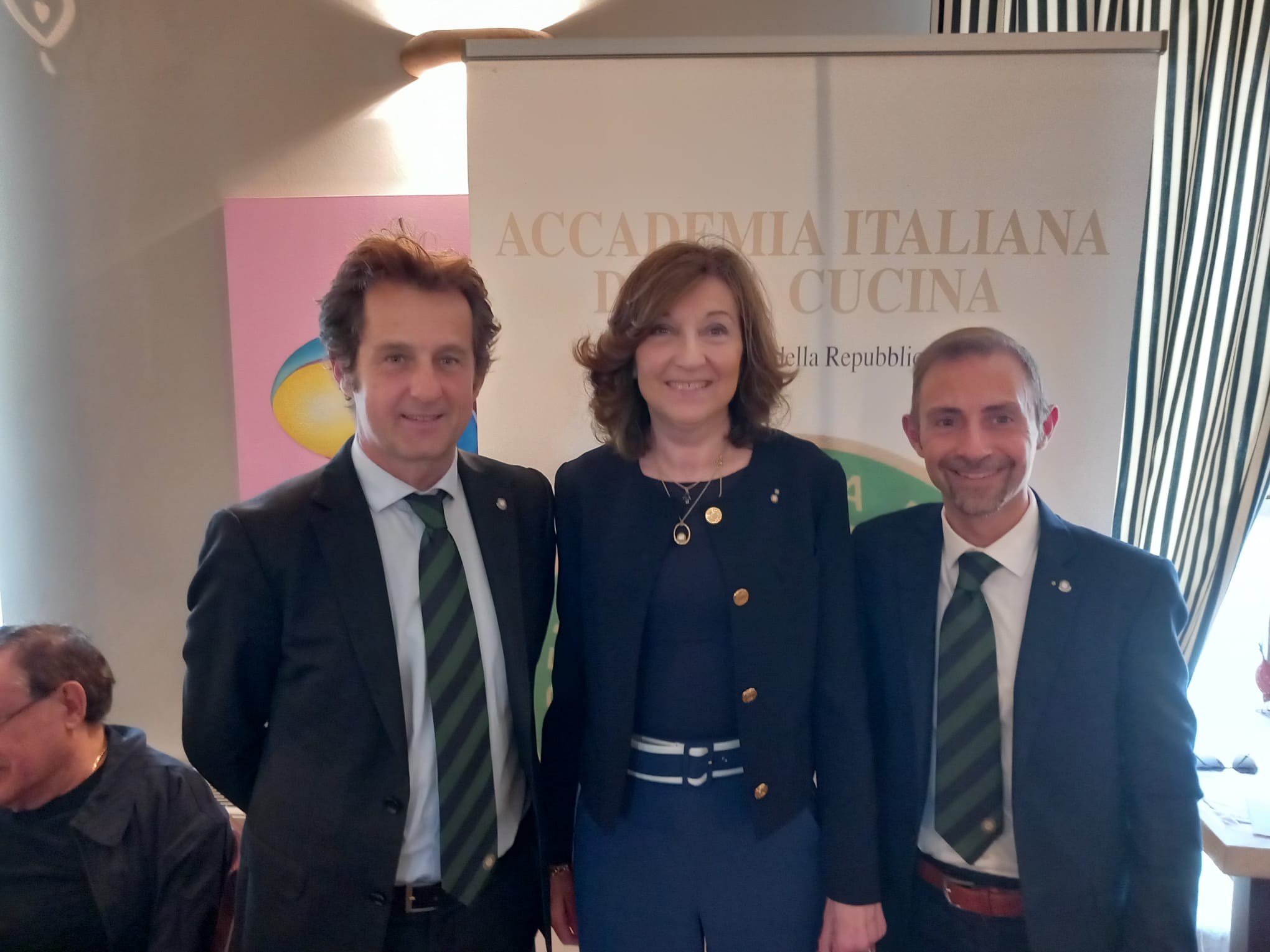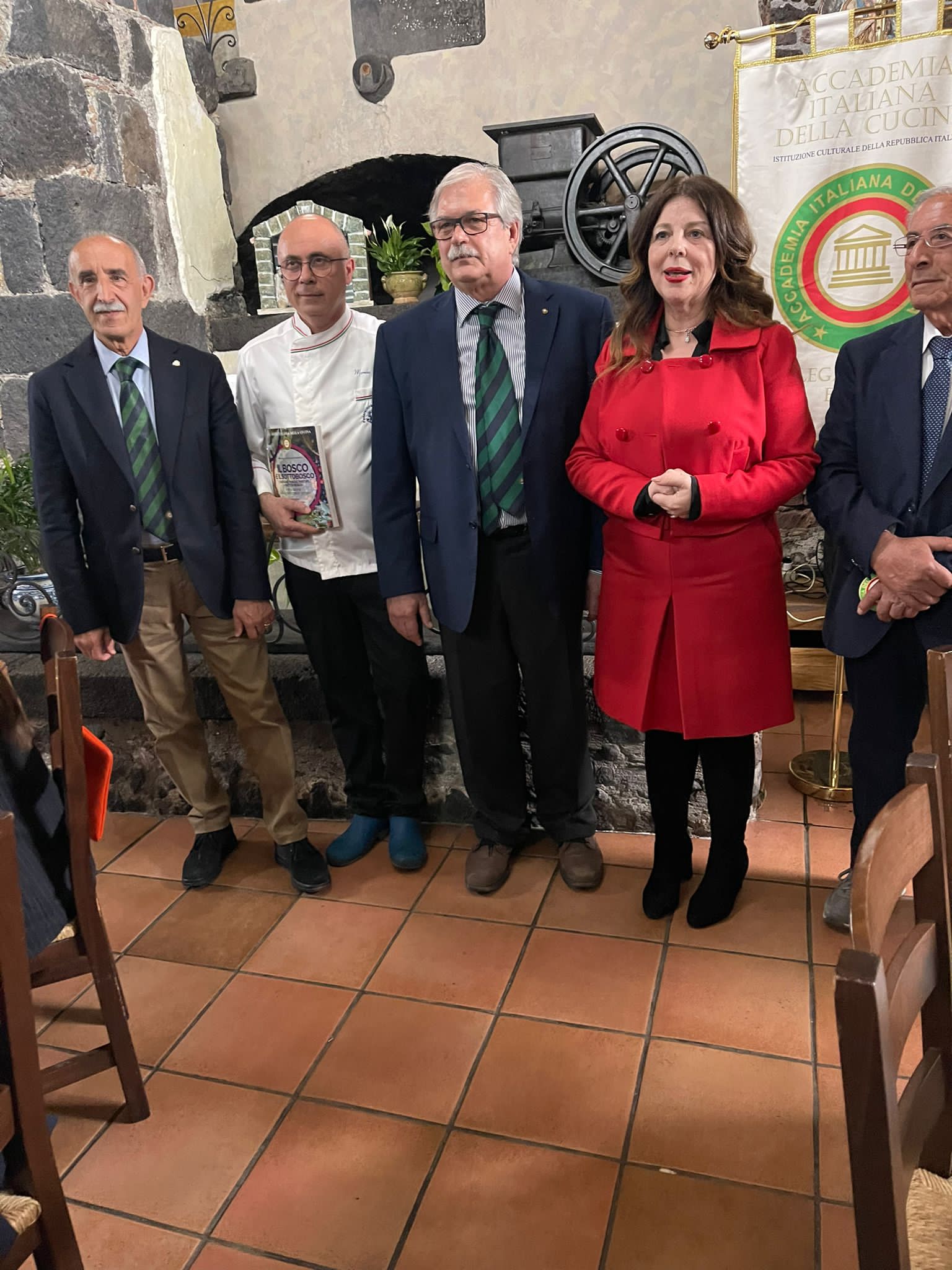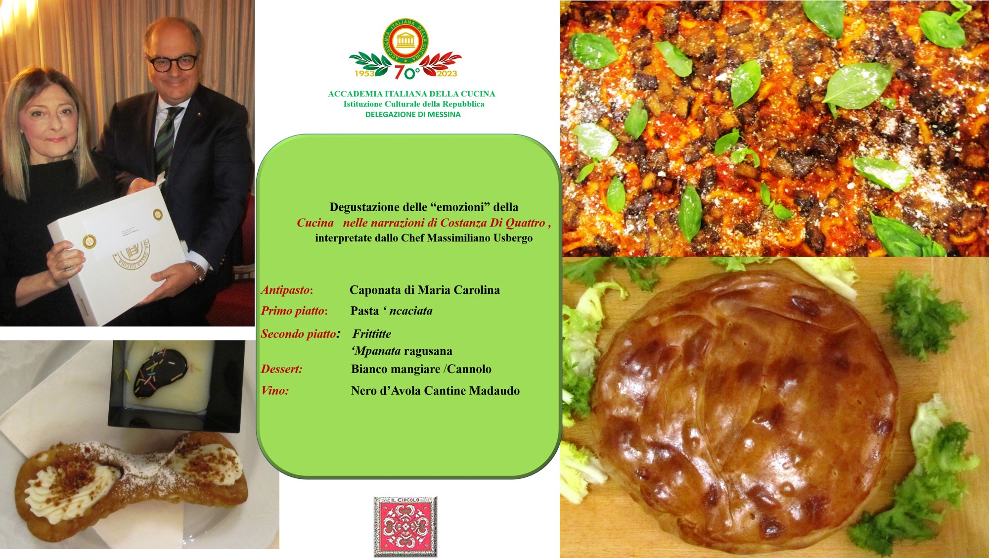 “La Cucina Partecipata nelle narrazioni di Costanza Di Quattro” è stato il tema dell’evento culturale della Delegazione introdotto dal Delegato e concluso dall’intervento del Coordinatore Territoriale della Sicilia Orientale Vittorio Sartorio, trattato in due eleganti presentazioni di Attilio Borda Bossana (La Cucina dei Monsù) e Luigi Hyerace (La cucina fra ricordi e emozioni nella cucina di Costanza Di Quattro) (Foto 1). Dopo la consegna delle insegne accademiche alla nuova Accademica Patrizia Cordaro da parte del Coordinatore Territoriale, gli Accademici e i numerosi ospiti hanno apprezzato la degustazione del menù tematico (Foto 2) preparato filologicamente dallo chef Massimiliano Usbergo e dalla sua squadra di cucina e servito dalla cortese squadra di sala, ritratti nella foto 3 con il Delegato e il Segretario.