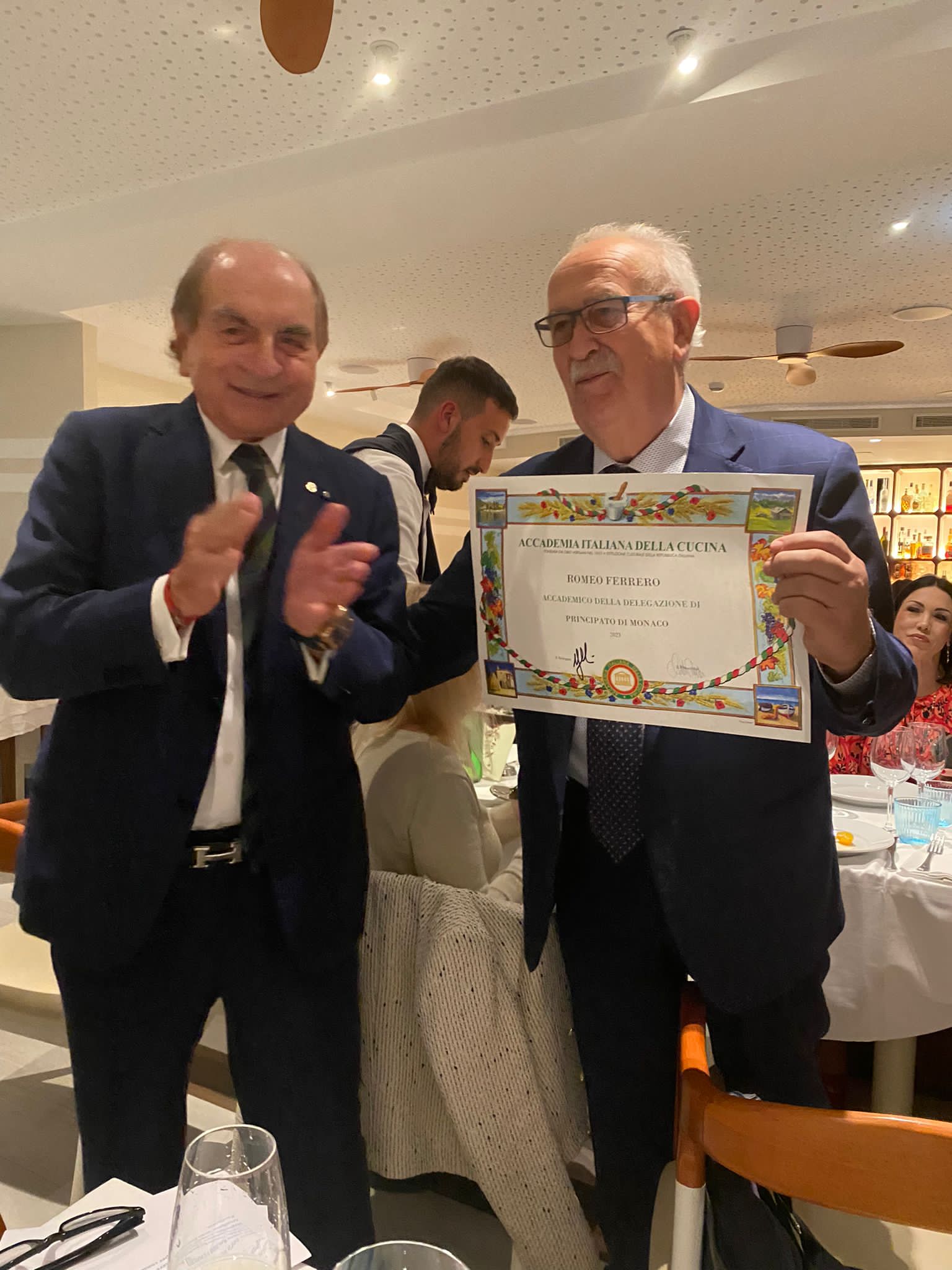 La Delegazione del Principato di Monaco ha salutato la stagione primaverile neIl’incantevoIe quadro di Port Hercule, sul quale si affaccia il Caffè Milano, locale relativamente giovane sulla scena della ristorazione monegasca, ma da tempo assai affermato e già completamente rinnovato nei suoi interni, gradevolmente luminosi e brillanti. L’impegno professionale dello chef Gaetano è confermato dalla sua adesione aII’originaria identità della cucina italiana, declinata nella sua autentica essenza, nel rispetto dei riti della tradizione e nella costante attenzione alla qualità delle materie prime. Nella composizione del palinsesto di questa cena accademica le scelte dello chef hanno privilegiato il modello mediterraneo, opzione tradizionale e spesso vincente, senza trascurare la veracità delle imprescindibili icone della cucina regionale, spaziando e coniugando il Nord e il Sud della Penisola. Una serata vivace, allietata dalla sinergica partecipazione degli Accademici e dei loro ospiti, la cui coesione ha colmato lietamente qualche tempo di attesa nei ritmi del servizio.