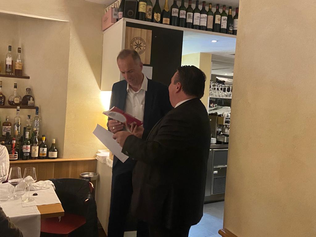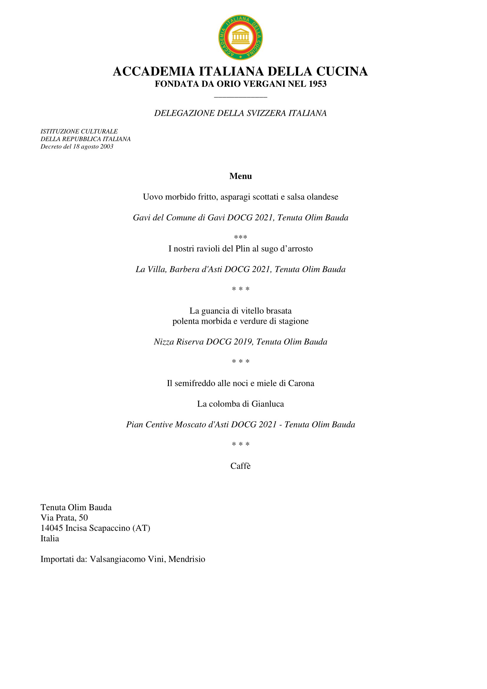 La seconda riunione conviviale del 2023, organizzata insieme al Simposiarca Enea Petrini, si è svolta presso il ristorante Posta nel pittoresco villaggio di Carona. Il locale è gestito da Francesco Donati, titolare anche dell’Osteria Trani a Lugano e del Grotto Pan Perdü sempre a Carona. Lo chef, Alessandro Calvarese, piemontese, ha deliziati Accademici ed ospiti con un interessante menu. I vini che hanno accompagnato i vari piatti sono stati scelti unitamente da Ezio De Bernardi che nel 1996 ha vinto il titolo di Miglior Sommelier della Svizzera. Ospite della serata è stato Gianluca Mollo, che unitamente a Ugo Klainguti è titolare di un negozio di pasticceria “Laboratorio San Giorgio” a Lugano. Mollo ha partecipato al campionato mondiale di pasticceria e ha presentato il dessert locale di successo “Pan di Carona”. Nel corso della serata il Consultore Francesco Cerea ha raccontato alcuni cenni storici su Carona, ora quartiere di Lugano. Alla conviviale hanno partecipato 48 ospiti, un successo. Foto 1. Da sinistra: il Sommelier Ezio De Bernardi e il Delegato Emilio Casati. Foto 2. Gianluca Mollo e Ugo Klainguti. Foto 3. Il menu. Foto 4. Uovo morbido fritto, asparagi scottati e salsa olandese.