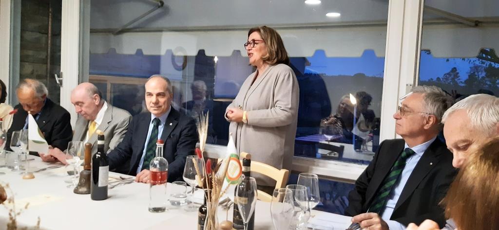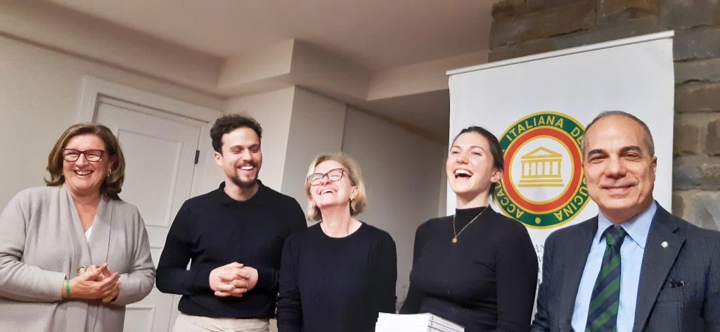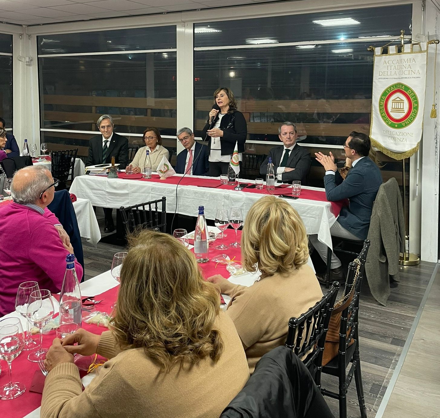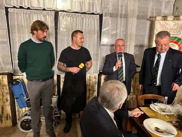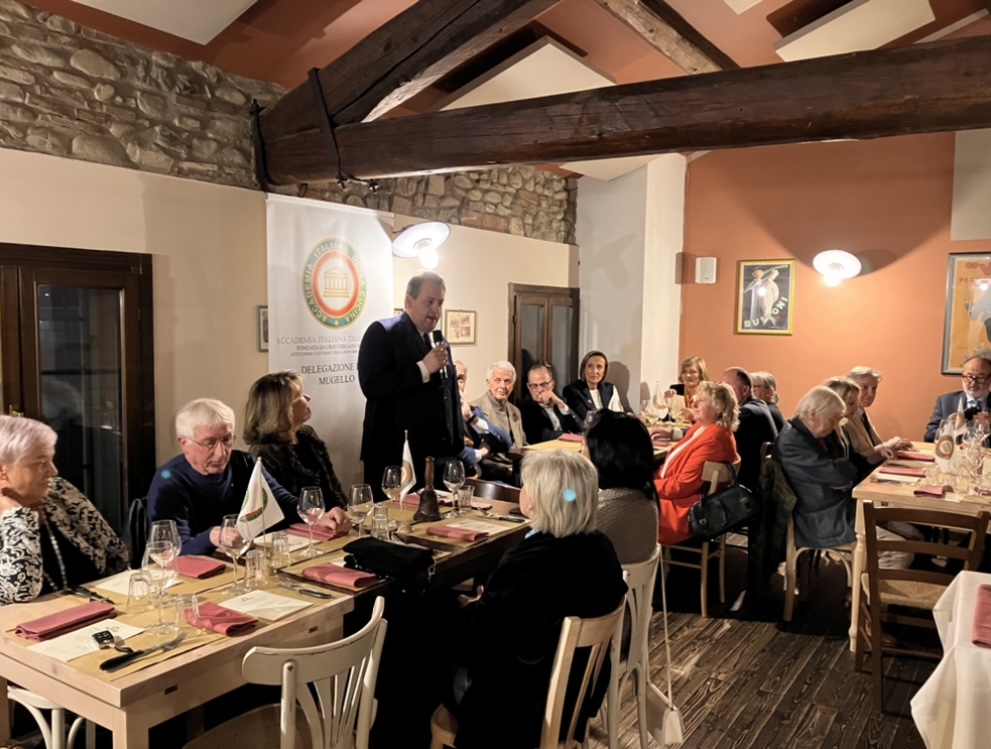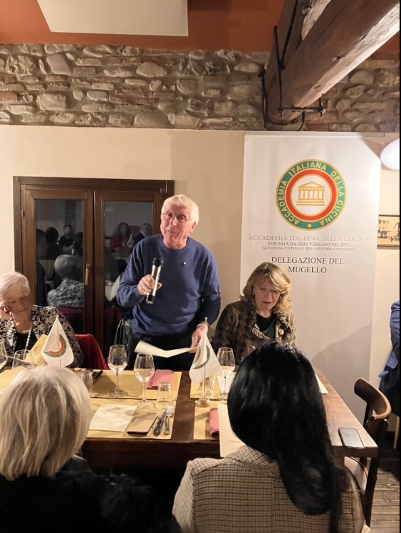Per la Conviviale di aprile la Delegazione del Valdarno Fiorentino si è riunita al ristorante Casa di Palaia, inserito in un piacevole agriturismo sulle colline di Chiocchio nel comune di Greve in Chianti. La riunione conviviale, organizzata dai Simposiarchi Anna Matteuzzi e Giovanni Gerini, è stata introdotta dalla presentazione di Anna Matteuzzi (foto 1) che, oltre a dare alcune notizie del ristorante che vedeva presenti gli Accademici per la prima volta, ha commentato il menù proposto dalla giovanissima cuoca e titolare Luisa Secci. Tutte le pietanze, che hanno richiamato le buone tradizioni del territorio, hanno avuto un corale apprezzamento da parte dei commensali (foto 2): burrata al tartufo, il Picio della Gigia (vezzeggiativo di Luisa), cacciucco di bosco (cinghiale, capriolo, cervo con funghi champignon), patate arrosto e fagioli cannellini all'olio, torta di mele, il tutto accompagnato da un buon vino Chianti Casa di Palaia IGT del 2019. Durante la serata il Delegato Sandro Fusari ha consegnato le insegne accademiche al nuovo Accademico Marco Massagli (foto 3), dando lettura della lettera di benvenuto del Presidente dell’Accademia, Paolo Petroni. In chiusura di serata, in un clima di allegria e convivialità, il Delegato e i Simposiarchi hanno ringraziato la famiglia Secci consegnando loro alcuni volumi dell’Accademia (foto 4).