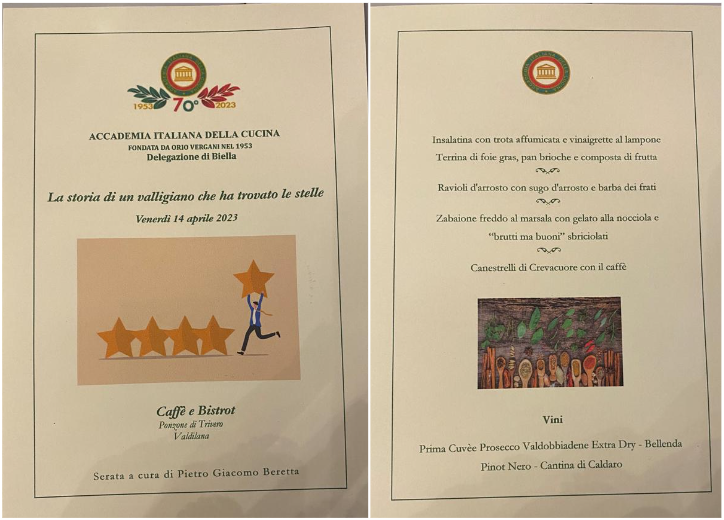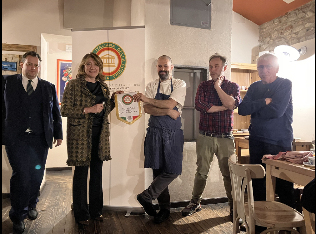 La Delegazione di Biella ha incontrato Luciano Alberti e sua moglie Stefania nel loro locale “Caffè e Bistrot” di Ponzone nella Valle Sessera. Luciano Angeli è famoso per essere stato il gestore di un locale stellato nella vicina Valsesia. Tornato nel Biellese ha aperto un piccolo ritrovo dove offre colazioni, pranzi ed aperitivi. Il tutto sempre preparato con la maestria di uno chef stellato. Nel suo locale, punto di incontro della zona, si respira un’aria serena e quieta e la lavagna con il menu del giorno, scritto a mano, invoglia gli avventori a fermarsi per un boccone. Il Simposiarca della serata, Pier Giacomo Beretta, ha voluto far conoscere la realtà lavorativa di questa coppia agli Accademici biellesi, proponendo un menu elegante ed accattivante.
