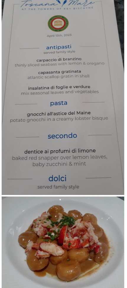 Riunione conviviale della Delegazione di Miami presso il Ristorante "TOSCANA MARE” aperto recentemente con una nuova gestione. Il locale appartiene al gruppo TOSCANA DIVINO di Tommaso Morelato, il cui motto "Eat well, leave well, be well " è diventato una filosofia di vita. È una nuova sfida per la società che già si è affermata con i suoi ristoranti nella zona di Brickell e all'interno di condomini. Anche questo locale è situato nel complesso delle TOWERS a Key Biscayne con accesso diretto alla spiaggia. Come ha ricordato il proprietario nel suo discorso introduttivo, si è ricreata una atmosfera tipica italiana dove molti locali fronte mare offrono la possibilità di accedere ai servizi di ristorazione. Il cibo curato dallo chef Andrea Marchesin, l'ambiente esclusivo, la saletta riservata per riunioni e la facilità di accesso alla spiaggia fanno di questo locale un’eccezione nel panorama della ristorazione di Miami. Il menu offre specialità a base di pesce ed è possibile usufruire del brunch domenicale e del catering per i residenti del condominio. La serata ha visto la partecipazione di 60 Accademici ed ospiti che hanno apprezzato specialmente gli gnocchi all'astice del Maine.