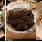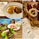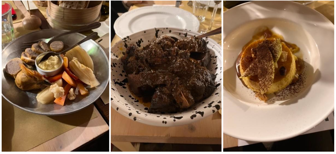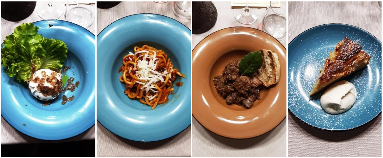 La Delegazione si è riunita presso il ristorante La Torre Osteria Et Bottega, a Scarperia e San Piero (FI). La perfetta organizzazione della serata si deve ai Simposiarchi Gherardo Gherardi e Giacomo Volpi (foto 1 e 2, durante i loro interventi) che hanno composto il menu scegliendo, tra le proposte in carta, preparazioni semplici e piatti poveri della tradizione locale. I fratelli Dugheri, che gestiscono questo locale occupandosi, Leonardo della cucina e Lorenzo della panificazione e della cantina, ripropongono molte ricette di famiglia. Tra queste la farinata di cavolo nero, il collo di pollo ripieno e la lonza con la sua lunga cottura, ma anche l’Elisir degli Dei, un liquore di erbe spontanee preparato secondo la ricetta del bisnonno, cuoco alla fine del 1800 (foto 3, alcuni dei piatti serviti). La piacevole serata si è conclusa con i ringraziamenti e la consegna del guidoncino al cuoco Leonardo, orgoglioso di tenere viva la memoria di ricette antiche (foto 4, i Simposiarchi e la Delegata con Leonardo e Lorenzo Dugheri).