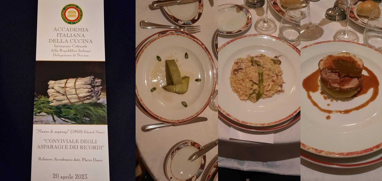La terza riunione conviviale del 2023 ha avuto come tema “Gli asparagi“ e l’Accademico Flavio Dusio ha tenuto una dotta ed esauriente relazione su questo ortaggio di stagione illustrandone la storia, gli aspetti nutritivi e le componenti benefiche. L’Accademico Marco Cesti ha presentato le caratteristiche e le qualità dei vini serviti. Gradito ospite il Delegato del Monferrato Pietro Caire. È stata anche una Conviviale dei ricordi in quanto, nel 1982, si era tenuta la prima cena della Delegazione in questo ristorante ancor oggi gestito dalla stessa famiglia e con lo stesso cuoco. Sono stati riproposti alcuni piatti cucinati nel 1982 grazie ad alcune informazioni ricavate dal notiziario di gennaio 1983 edito dall’Accademia. I piatti di allora, giudicati in quel tempo innovativi ed oggi ritenuti tradizionali, sono stati: sformato di asparagi, faraona ripiena, tulipe di fragole. Il menù è stato arricchito da una scaloppa di salmerino con asparagi e da un risotto calamaretti e punte di asparagi. Foto 1. La presentazione del cuoco Pier Giuseppe Viazzi con il Delegato Piero Spaini, il Delegato del Monferrato Pietro Caire e il relatore Flavio Dusio. Foto 2. Sformato di asparagi, risotto calamaretti ed asparagi, faraona ripiena. Foto 3. Tulipe di fragole.