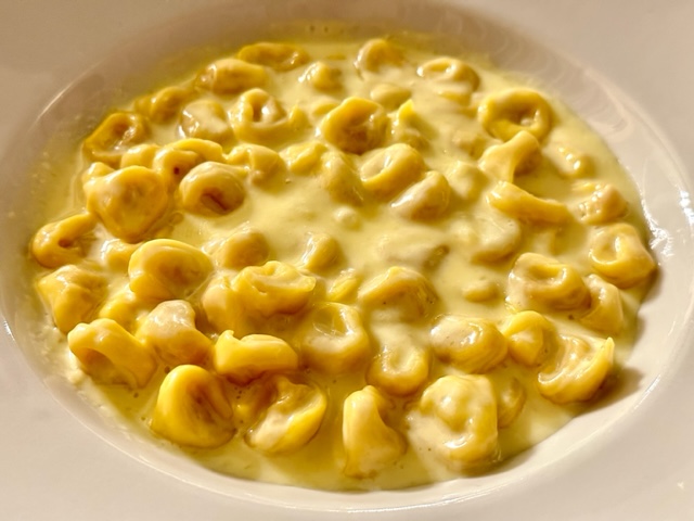 Una selezione dei piatti della gioiosa cucina petroniana ha ravvivato la conviviale di aprile in una nuova trattoria avviata da un giovane cuoco che, dopo un'esperienza nell'Appennino bolognese, è sceso nella bassa imolese lungo la trafficata San Vitale. Guido Rossi, alla guida della trattoria che porta il suo nome, ha avviato il suo percorso con degli sfiziosi stecchi seguiti dai richiestissimi e amabilissimi tortellini al mignolo e da una succulenta e classica lasagna verde al forno. Non poteva ovviamente mancare la gustosa e calorica cotoletta petroniana contornata dal tipico friggione di cipolla con pomodoro e da crema fritta a forma di dado. E in chiusura un creme caramel. Al termine un forte plauso degli Accademici al Simposiarca Michele Gamberini, al cuoco Guido Rossi e agli indovinati abbinamenti con i vini della cantina imolese Giovannini. In apertura di conviviale un saluto corale ha accolto il neo Accademico Paolo Sbarzaglia con la consegna del distintivo ad opera del presentatore Giuseppe Farina. Foto 1. Accademici a tavola. Foto 2. Accademici Sbarzaglia e Farina. Foto 3. Il commento sui piatti della serata con il Simposiarca Michele Gamberini affiancato dal Delegato Antonio Gaddoni, dal cuoco Guido Rossi e da Jacopo Giovannini. Foto 4. Tortellini del dito mignolo alla panna.