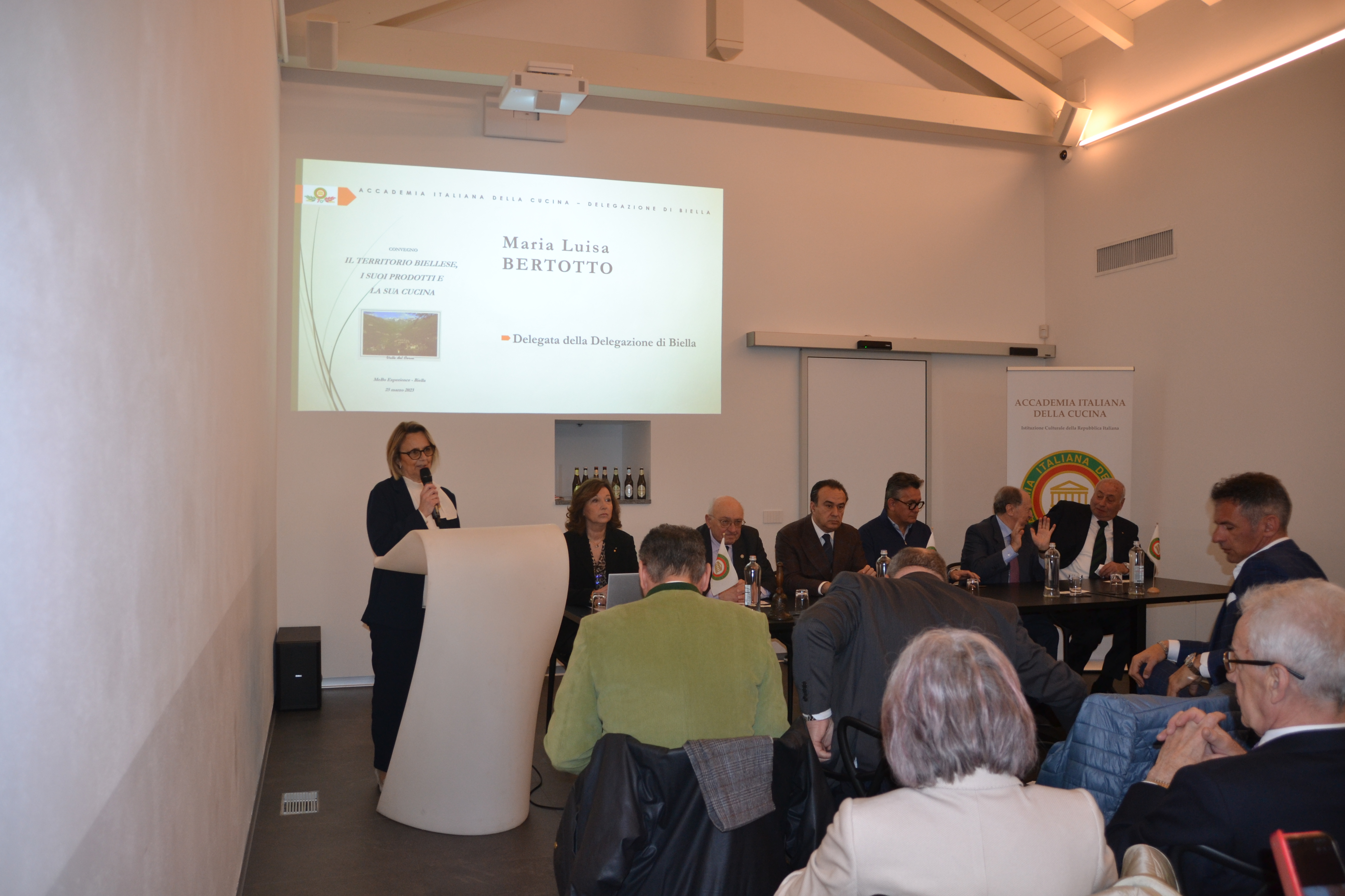 La Delegazione di Biella ha organizzato un convegno dal titolo “Il territorio biellese, i suoi prodotti e la sua cucina” per onorare i 70 anni di fondazione dell’Accademia. Il convegno si è svolto nelle sale del complesso di MeBo Experience alla presenza di un folto pubblico. Erano presenti ben 12 Delegazioni, i due Coordinatori Territoriali del Piemonte oltre al sindaco Claudio Corradino e al prefetto Silvana D’Agostino. Moderatore dell’incontro è stato l’Accademico e redattore di Eco di Biella, Giovanni Orso. I temi trattati sono stati la cucina biellese in vecchi menu dell’Ottocento e del Novecento da parte di Elisabetta Cocito; prodotti e tradizioni popolari da Giorgio Lozia; le qualità dell’acqua biellese da Fabio Vineis; la creatività in cucina e la ricerca di prodotti a KM 0 da Sergio Vineis; la vera cucina biellese da Enzo Vizzari ed infine i prodotti PAT locali da Dario Torrione. Al termine del convegno i numerosi ospiti hanno gustato un ricco aperitivo e un pranzo preparato dal catering del ristorante Croce Bianca di Oropa. A conclusione della giornata sono stati con segnati i simboli di 25 anni di appartenenza all'accademia a Bianca Gremmo Zumaglini.