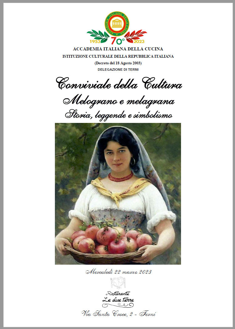 Anche la Delegazione di Terni dedica tradizionalmente la conviviale del mese di marzo alla cultura gastronomica (foto 1). I Simposiarchi Vincenzo Montalbano Caracci (foto 2) e Pietro Pegoraro hanno proposto un’interessante relazione sulla melagrana, approfondendone la storia, l’utilizzo in cucina ed altri aspetti tra cui il simbolismo e le leggende ad essa relative. Per l’occasione, è stato selezionato il ristorante Le Due Terre, in pieno centro a Terni, gestito dal 2018 da Mariagrazia Di Bello, originaria di Capua, che vi lavora con il compagno Egisto Fede. Menu a base di pesce, secondo tradizione gastronomica campana ma con richiami al territorio. In questa occasione è avvenuta anche la consegna dell'attestato di appartenenza venticinquennale all'Accademico Pietro Pegoraro (in foto 3 e 4 con Delegato onorario Guido Schiaroli e Delegato Luca Cipiccia). Al termine della piacevole serata, il Delegato ha consegnato ai ristoratori un volume dell’Accademia.