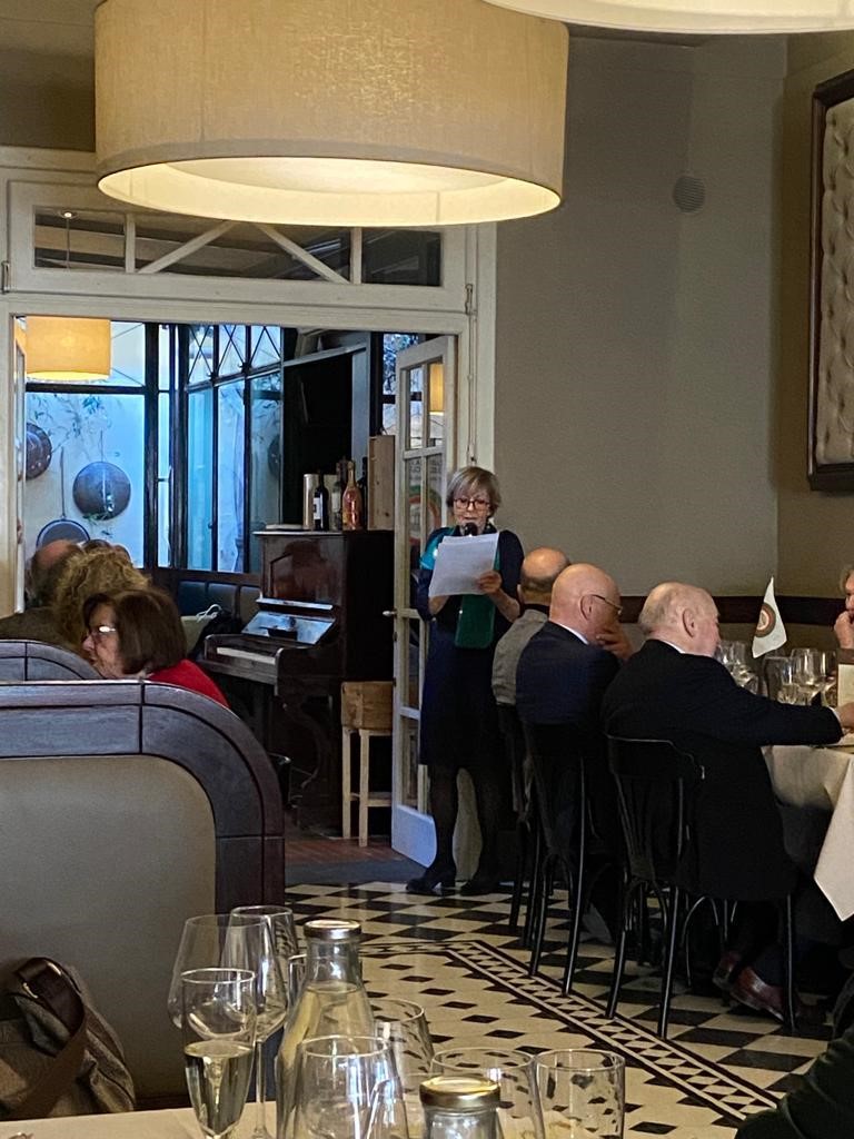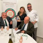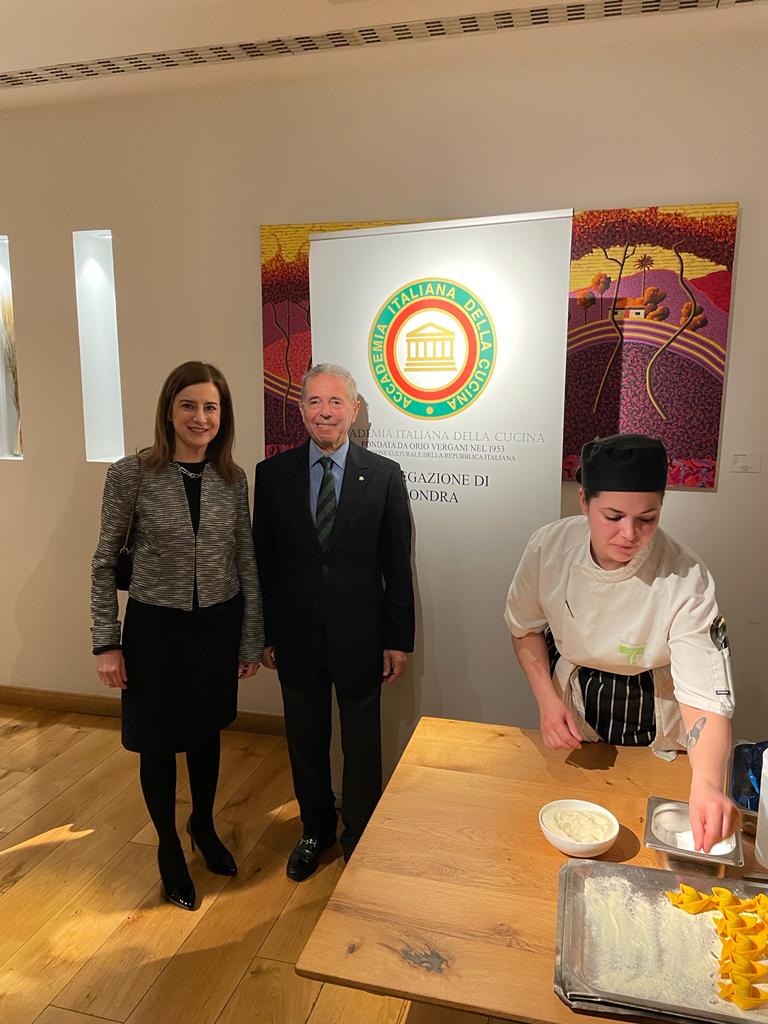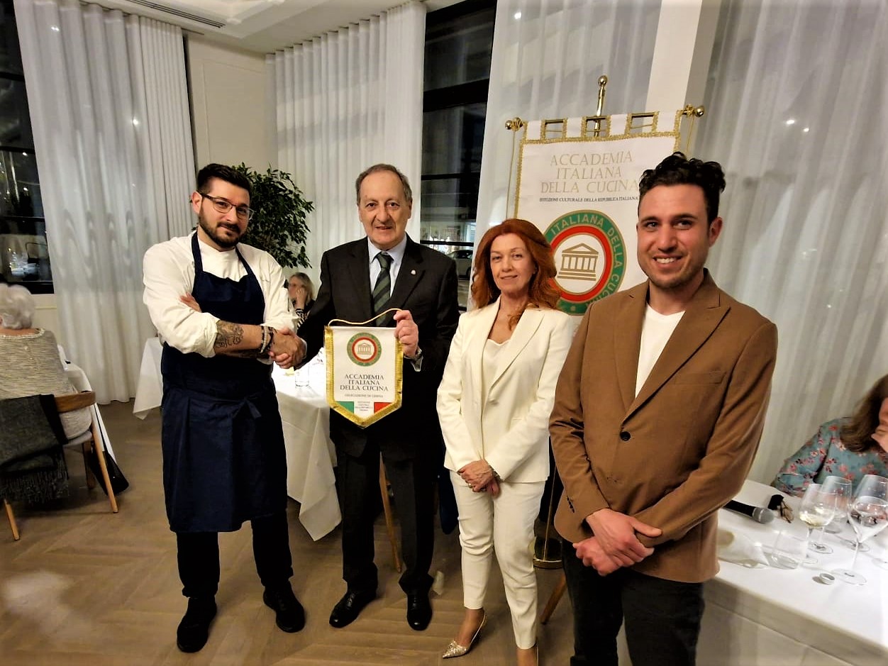 La Delegazione di Londra, in occasione della Conviviale della cultura, ha consegnato il Diploma di Buona Cucina 2022 allo chef Theo Randall che è l’esempio di come anche uno chef non italiano possa riuscire a interpretare magistralmente la nostra cucina (in foto 1 con Delegato Fazzari e Vice Delegata Ross). Fra i presenti, Gabriella Manfredi Addetta alle politiche agricole e alimentari dell'Ambasciata (in foto 2 con Delegato) e Federico Dimonopoli, Vice Responsabile dell'Ufficio Economico dell'Ambasciata (in foto 3 tra gli ospiti a tavola). Lo chef ha offerto una breve dimostrazione di cucina cui ha fatto seguito una cena a tavola con un menu creato per l'occasione, con vini adeguati alle portate. Il mese di marzo tradizionalmente l’Accademia lo dedica alla cultura e, quest’anno, il Delegato Maurizio Fazzari e la Consultrice Etta Carnelli (foto 4) hanno presentato un excursus del binomio cibo e letteratura, commentando fra l'altro alcune pagine del libro "Pranzi d' Autore" dell’autrice scomparsa Oretta Bongarzoni cui è seguita un’intervista online al figlio Davide Orecchio che ha realizzato recentemente una nuova edizione del libro. Alla fine della serata, applausi dei presenti per i due relatori, per Theo Randall, tutta la brigata di cucina e per la Simposiarca Vice Delegata Sidney Ross che ha svolto il suo compito con grande professionalità.