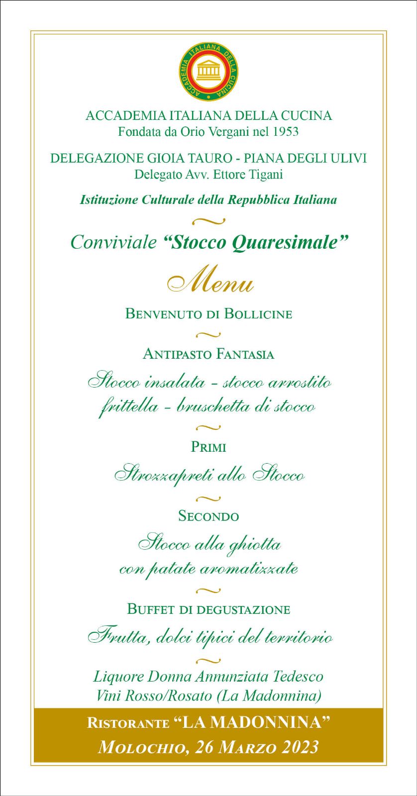 Gli Accademici di Gioia Tauro-Piana degli Ulivi capitanati dal Delegato Ettore Tigani, i Delegati della provincia reggina Giuseppe Alvaro, Enzo Vitale, Sandro Borruto, Giuseppe Ventra, alla presenza del Coordinatore Territoriale Rosario Branda e del Delegato di Vibo Valentia Giuseppe Adilardi, si sono incontrati a Molochio, presso il ristorante “La Madonnina” per una conviviale dedicata allo stoccafisso e denominata “Stocco Quaresimale”. L'incontro, al quale hanno partecipato numerosi Accademici delle varie Delegazioni, è stato organizzato nell'ottica della valorizzazione del territorio, dei ristoranti e dei prodotti e piatti tipici della tradizione culinaria calabrese. Hanno portato i propri saluti il sindaco di Molochio, Marco Caruso, che si è detto ben lieto di ospitare nella sua città gli Accademici calabresi, e il presidente dell’Associazione dei Sindaci “Piana degli Ulivi”, Giuseppe Zampogna. Il benvenuto agli ospiti è stato dato dal Delegato Ettore Tigani, il quale si è soffermato sugli obiettivi e sulle finalità dell'Accademia. Significativo l'intervento conclusivo del CT Rosario Branda, che non ha mancato di evidenziare gli aspetti salienti dell'attività delle Delegazioni dell'Accademia. A conclusione, Ettore Tigani ha voluto ringraziare la titolare-cuoca per l'accoglienza e per la buona qualità della cucina con la consegna del guidoncino dell'AIC; al Sindaco della Città ha donato una copia del volume “Storia della cucina italiana a fumetti”.