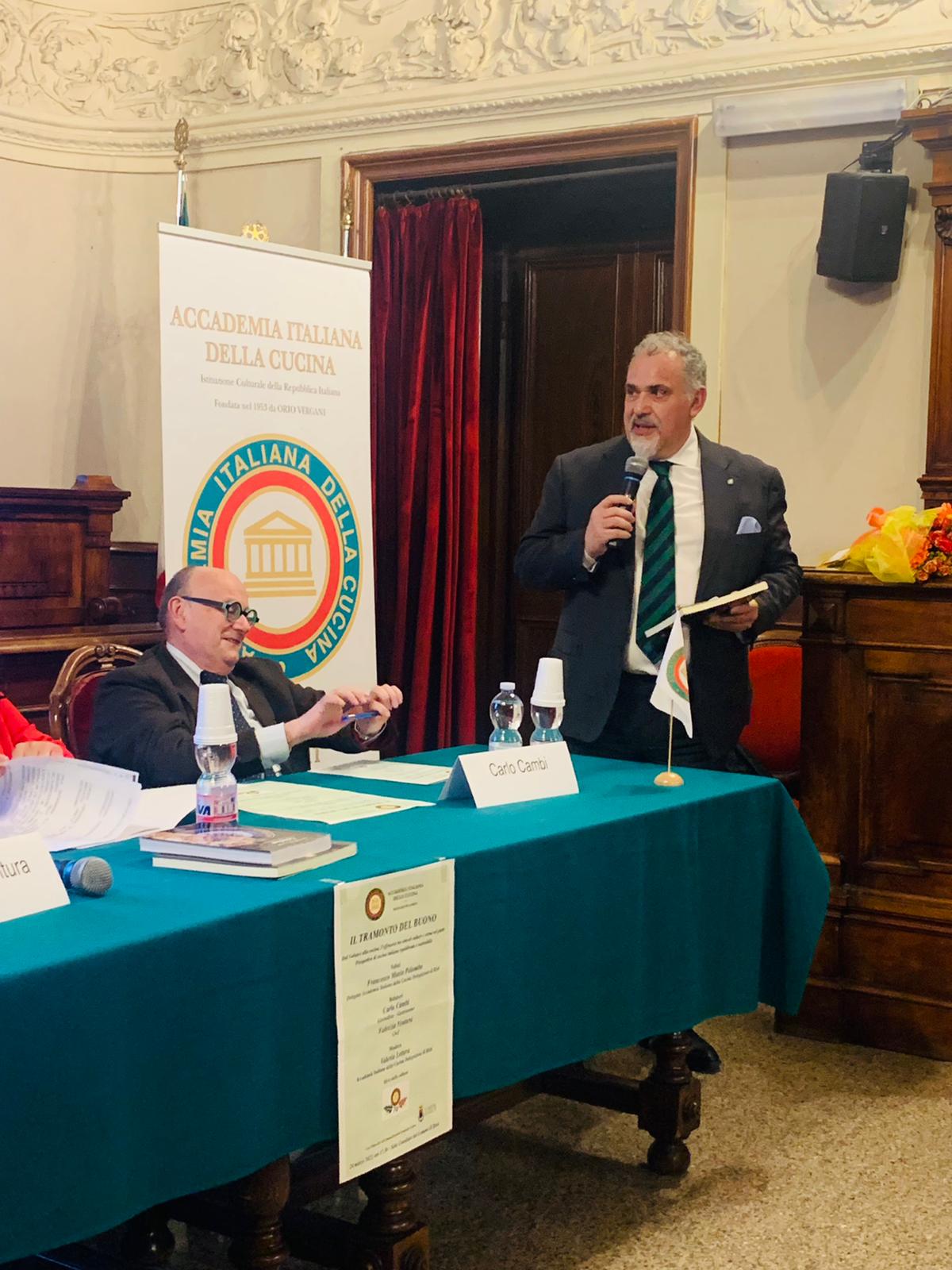 Venerdì 24 marzo, nel mese dedicato dall'Accademia alla cultura, successo in due atti per la giornata di studio e degustazione dedicata dalla Delegazione di Rieti alla celebrazione della sostenibilità all’italiana contro le scorciatoie ideologiche dei novel food. Nella bellissima e gremita sala consiliare del Comune di Rieti, si è svolto il convegno pubblico “IL TRAMONTO DEL BUONO - Dal Galateo alla cucina, l'offensiva tra cancel culture e vermi nel piatto - Prospettive di cucina italiana equilibrata e sostenibile”. Alla presenza delle autorità cittadine e di un folto pubblico, dopo il saluto iniziale del Delegato Francesco Maria Palomba, del Direttore del Centro Studi Territoriali Lazio Roberto Dottarelli e dell'Assessore Giovanna Palomba per il Comune di Rieti, il noto giornalista e scrittore Carlo Cambi e la chef Fabrizia Ventura hanno animato un incontro vivacissimo e partecipato. Per gli Accademici ed i loro ospiti, la serata è proseguita presso il ristorante Papilla, dove lo chef Marco Bartolomei, pienamente interpretando il tema della serata, ha proposto il delizioso menù “Il territorio dal mio punto di vista”, valorizzando i prodotti agropastorali del territorio insieme al pesce di lago e alle erbe spontanee con accostamenti inediti ma piacevolissimi. I piatti sono stati molto apprezzati riscuotendo unanimi consensi, con un plauso speciale per lo strepitoso carpaccio di pecora e rape fermentate e il sorprendente smoothie di zuppa inglese.