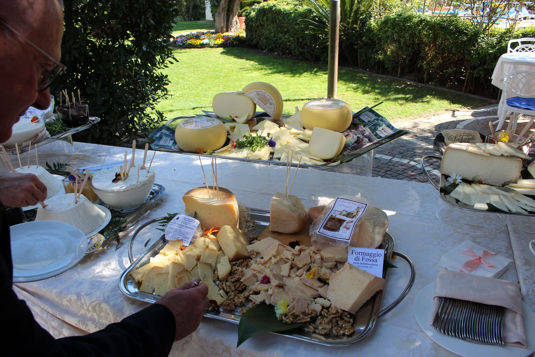 Il Coordinamento Territoriale Romagna al gran completo e la Delegazione della Repubblica di San Marino hanno organizzato il convegno “I formaggi in Romagna ed il loro uso in cucina”. Relatori d’eccezione Massimo Montanari, docente universitario Accademico Onorario di Imola, Renato Brancaleoni affinatore di importanza mondiale, Pietro Rocculi Docente Universitario, Giuseppe Guidi Presidente della Centrale del Latte della Repubblica di San Marino, Azienda di Stato e lo chef Antonio di Cesare. Relazioni di grande spessore culturale storico, tecnico e gastronomico, hanno catturato l’attenzione del 145 iscritti che hanno seguito con grande interesse gli argomenti trattati nelle esposizioni dei relatori. Dopo la parte teorica, una giornata perfetta, tersa e soleggiata, ma con temperatura gradevole, ha concesso di effettuare il buffet all’aperto con gran trionfo di prodotti tipici della Romagna, ma soprattutto con degustazione dei formaggi del territorio di qualità eccellente e sopraffina con riscontro positivo, compiaciuto ed estasiato dei gourmet intervenuti soprattutto per il formaggio di fossa. La Conviviale vera e propria si è poi svolta negli ambienti interni dell’Hotel Aurelia ed è stata caratterizzata da un clima gioioso e dal piacere di stare insieme.