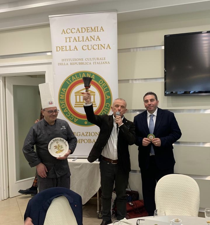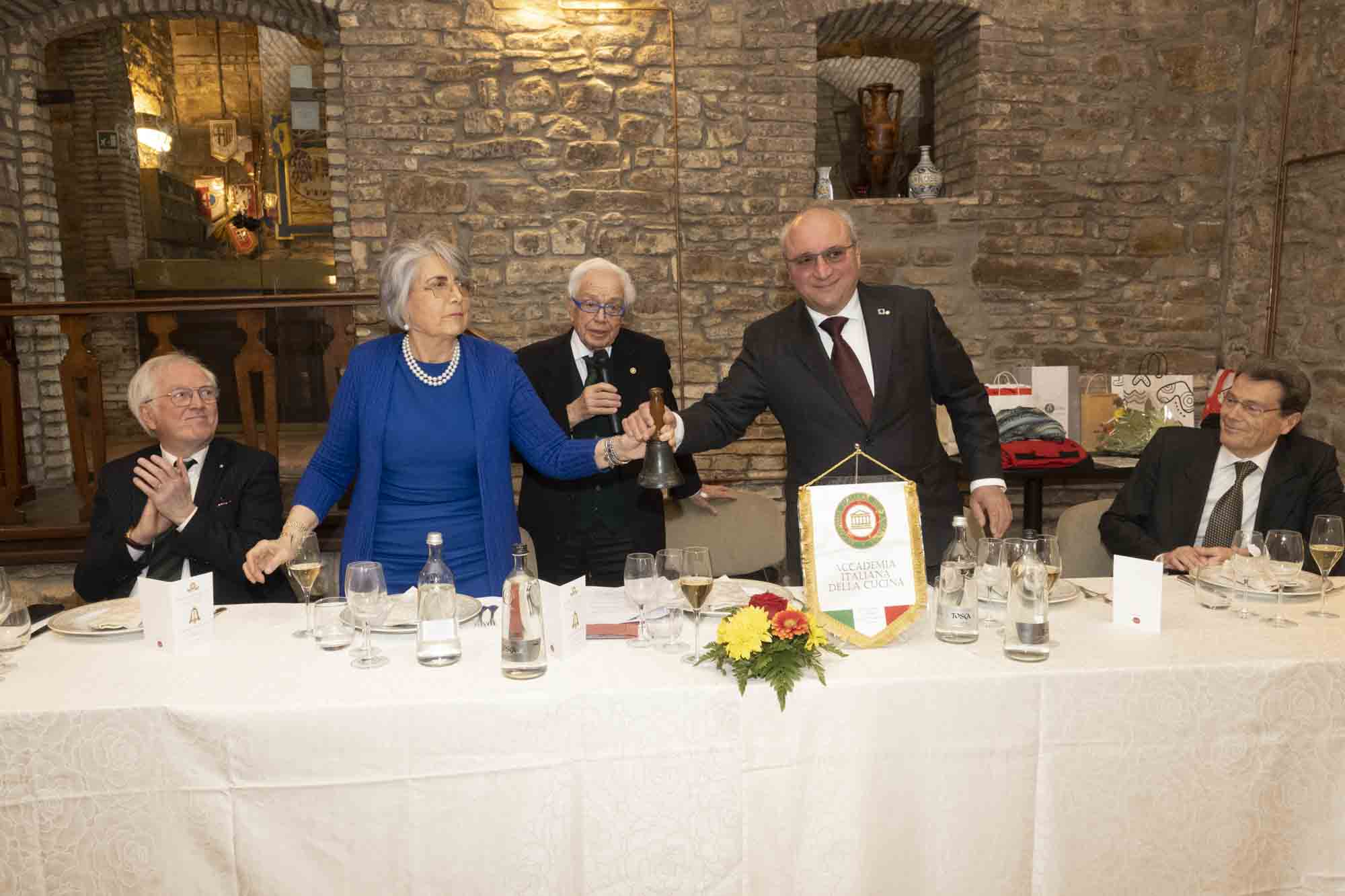 Si è svolta al Ristorante Hotel Villa Montegranelli, nella sua splendida posizione panoramica, la cerimonia del "Passaggio della Campana" dalla Delegata Paola Biraschi al nuovo Delegato Giovanni Battista Pauselli. Presenti per l'Accademia il Coordinatore Territoriale dell'Umbria Guido Schiaroli e il Direttore del Centro Studi Territoriale Giuseppe Fatati. Ospiti i Delegati umbri di Foligno Claudia Valentini, di Perugia Massimo Moscatelli e dell’Alto Tevere Patrizia Periniola Morini. Ha aperto la cerimonia Guido Schiaroli dando il benvenuto a tutti i presenti e ricordando poi i due principali artefici della fondazione della Delegazione di Gubbio esaltandone le qualità organizzative e culturali, Gianni Chiocci e Giuseppe Montanari. Dopo i saluti della Delegata uscente Paola Biraschi e del nuovo Delegato Giovanni Battista Pauselli, il Coordinatore ha sottolineato il significato della campana come simbolo della continuità dei valori dell'Accademia ed ha poi appuntato il distintivo al Delegato Giovanni Battista Pauselli tra uno scrosciante applauso dei presenti. Infine con il suono della campana a due mani da parte dei due Delegati la cerimonia si è conclusa e si è dato inizio alla Conviviale.