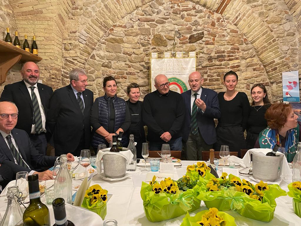 Per la riunione conviviale di primavera la Delegazione di Ascoli Piceno ha optato, tramite la Simposiarca Paola Cocci Grifoni, per il ristorante “Blobcaffè” sito in contrada S. Maria Goretti di Offida (AP), dove opera il giovane e talentuoso chef Gianmarco Di Girolamo il quale si ispira alla tradizione gastronomica del territorio impiegando, per i suoi appetitosi manicaretti, esclusivamente prodotti di stagione; per tale ragione è uso modificare il menu ad ogni cambiamento di stagione. L’effetto è il corale apprezzamento delle sue elaborate pietanze che hanno il sapore antico della cucina locale, ma presentate con originali e fantasiose innovazioni. Nel corso della serata, il Delegato Vittorio Ricci ha presentato una breve cronistoria della Delegazione che compie quest’anno i 35 anni dalla costituzione e, l’Accademico Leonardo Seghetti membro del Centro Studi F. Merenghi, ha dissertando sulle particolarità del menu e dei vari ingredienti impiegati in una stimolante ed avvincente confronto con l’ex Direttore del Centro Studi Marche, Piergiorgio Angelini. Gli Accademici e gli ospiti presenti hanno gradito molto l’erudito scambio di opinioni tra i due illustri ed altamente competenti personaggi.