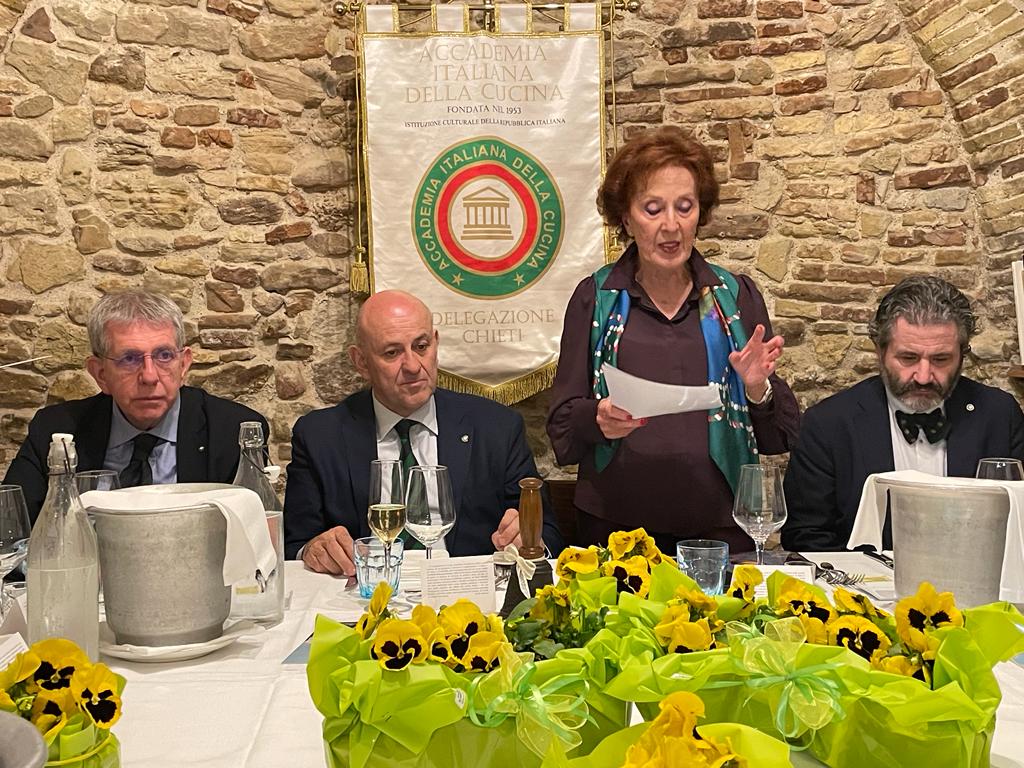 La riunione conviviale è stata organizzata a Villa D’Evoli, una location storica incastonata nella campagna della valle del Fiume Biferno, che dalle falde dei monti del Matese raggiunge l’Adriatico nei pressi di Termoli, cuore del verde Molise. Lo chef ha fondato la sua proposta di menù sulla cucina di mare, consentendo agli Accademici e e ospiti di gustare il pescato fresco della vicina costa adriatica, comodamente immersi nel verde della valle. Con il sapiente supporto del Simposiarca Maurizio Nerilli, che ha reso l’incontro ricco di spunti e di riflessioni sulle origini, produzione e tradizioni delle vivande e del vino serviti, sono stati gustati un antipasto variegato di mare e due primi che hanno soddisfatto il gusto di tutti gli intervenuti, l’uno con la chitarrina con spada e verdure e l’altro con risotto, salmone e lime. Particolarmente apprezzata per la freschezza, delicatezza e fragranza, è stata la spigola al sale naturale accompagnata da uno scampo reale. Anche il dolce, una gustosissima e leggera sfogliatina con mela e gelato, non ha deluso i commensali, soddisfatti per il connubio riuscitissimo di frutta e dolce. A chiudere il convivio, come sempre, il Delegato Ernesto Di Pietro ha ringraziato lo chef e il suo staff con parole di encomio e simpatia, consegnando ai proprietari il materiale di rito, a testimonianza del passaggio dell’Accademia a Villa d’Evoli.