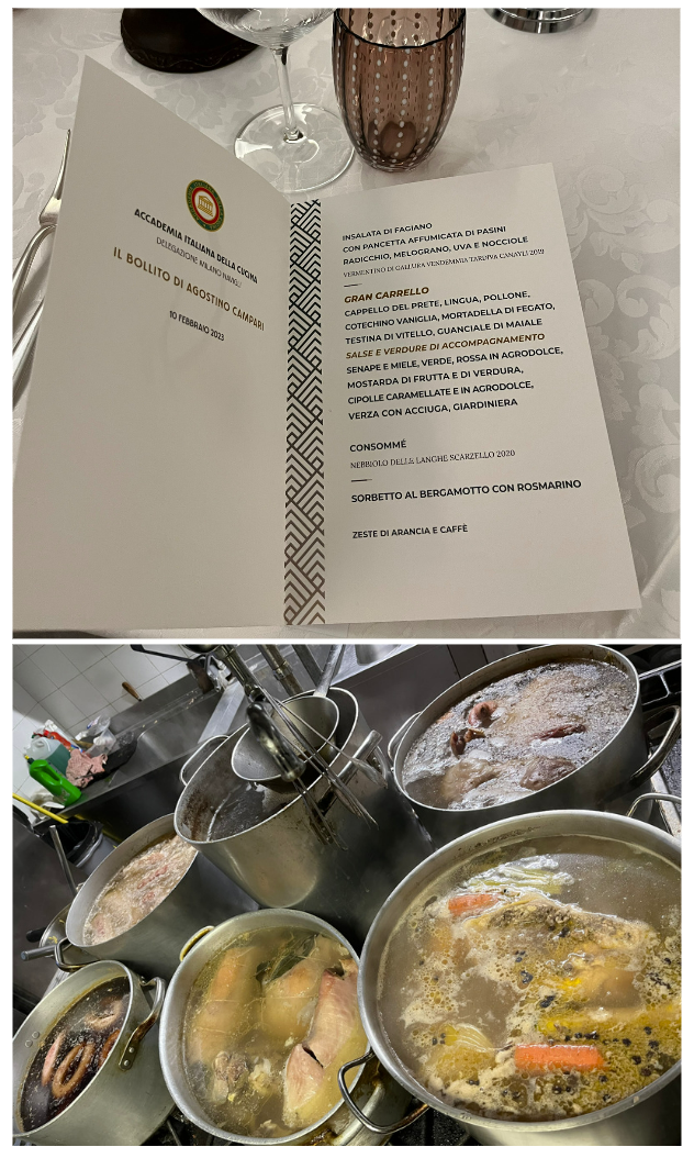 Il 15 febbraio 2023, presso l’Osteria Amarotto in Casale Monferrato, la Delegazione del Monferrato ha celebrato il bollito misto piemontese. Il Simposiarca ha ben illustrato il tema sulla scorta delle preziose indicazioni e documenti dell’Accademico astigiano Giovanni Goria. Piero Amarotto, ristoratore di grande tradizione, insieme alla sua famiglia, ha saputo creare l’atmosfera e coordinare un servizio che hanno consentito agli Accademici di gustare questo piatto storico con grande entusiasmo.