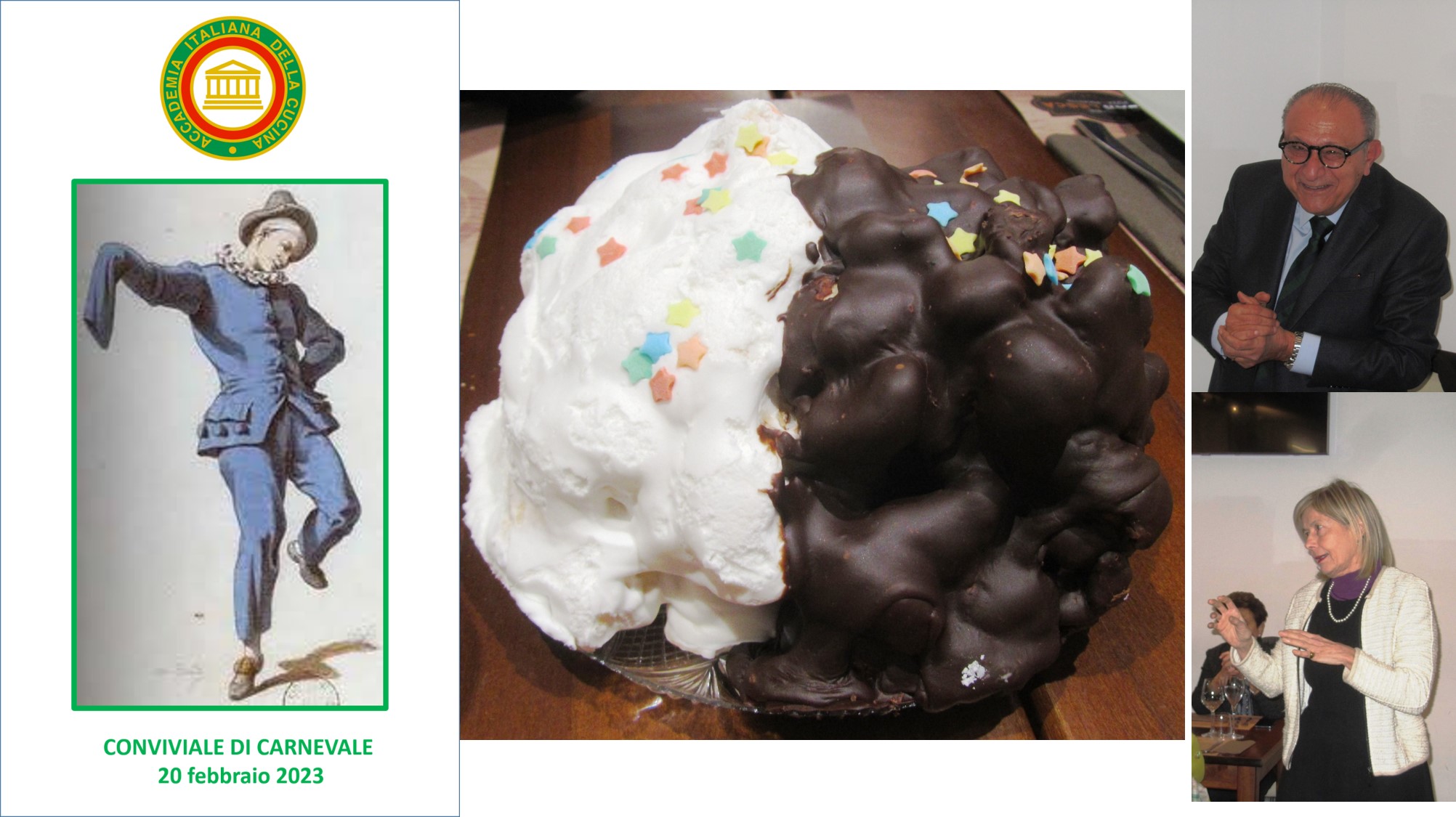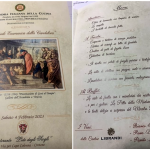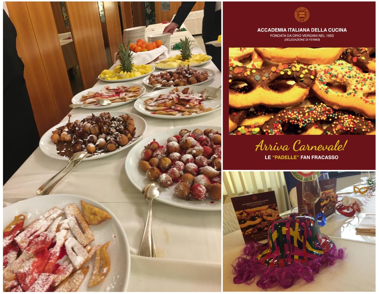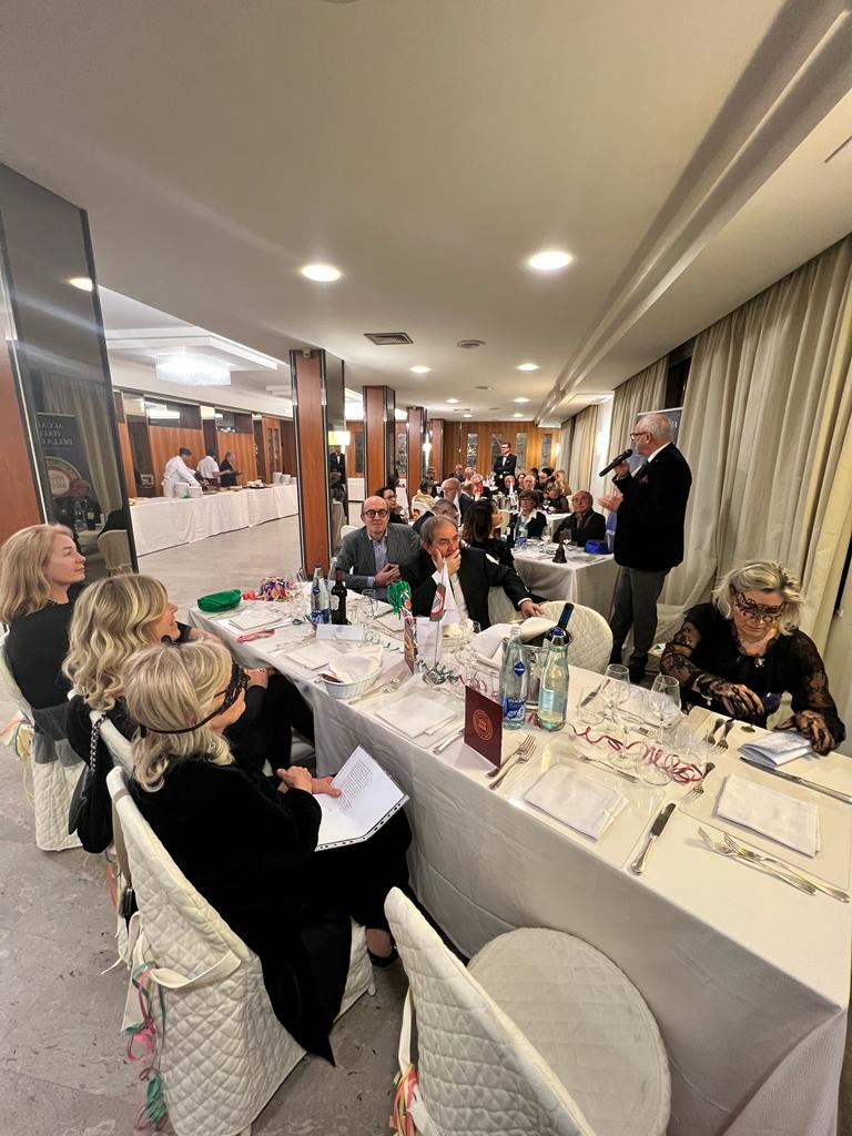 La Delegazione di Fermo ha celebrato il Carnevale presso le ampie sale dell’hotel il Timone di Porto San Giorgio esclusivamente riservate e debitamente addobbate per l’occasione. Le Simposiarche Anna Maria Ciciretti, Maura Raccichini e Nadia Zacchi (foto 1 con Delegato Torresi), con gran fervore hanno predisposto al meglio un evento incentrato sulle tradizioni locali a tavola senza però trascurare l’aspetto culturale e quello di gioiosa festa. Dopo i saluti del Delegato ai numerosissimi ospiti (foto 2), le Simposiarche si sono alternate in relazioni che hanno esplorato le tradizioni nel fermano per la festa, la storia, il folklore e la gastronomia ma anche la poesia in vernacolo. Di interesse anche la presentazione della maschera Mengone Torcicolli e della sua Lisetta. A Carnevale, si sa, le padelle fan fracasso (il rumore doveva svegliare il sole sopito dall’inverno) e le più tipiche preparazioni che riguardano per lo più i dolci e le fritture in genere sono state prima raccontate dalle Simposiarche e poi realizzate in un ricchissimo buffet con generale apprezzamento dei convenuti (foto 3 i dolci). Molto gradita la polenta al ragù di maiale, i maccheroncini e le fritture. Ringraziamenti del Delegato a Gianni Lamponi, patron della struttura, che ha seguito nei dettagli l’organizzazione dell’evento (foto 4). Una serata all’insegna della cultura, del buon cibo e del divertimento predisposta per soddisfare tutti i palati.