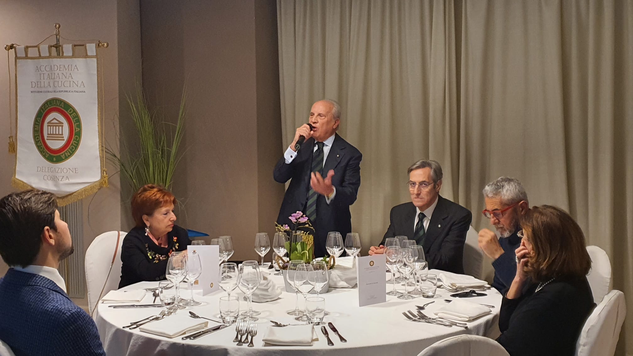 La riunione conviviale di Carnevale della Delegazione di Cosenza ha costituito l’occasione per riannodare i fili che legano cultura e tradizioni popolari grazie ad usanze tramandate nel tempo. Ricca di colte e stimolanti curiosità la relazione dell’Accademico Simposiarca Oreste Morcavallo (foto 1) molto apprezzata ed applaudita dai numerosi Accademici presenti (foto 2). Piatti molto ben realizzati e presentati dalla cucina (foto 3), in magnifico abbinamento con i vini di Terre del Gufo della vicina Donnici. Alla titolare Flora Fabiano la consegna del Guidoncino ad opera del Delegato Rosario Branda e del Vice Delegato Pietro Vivona (foto 4.)