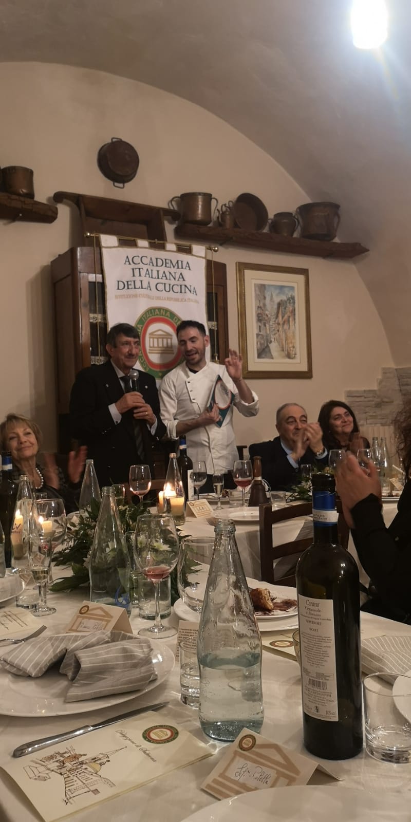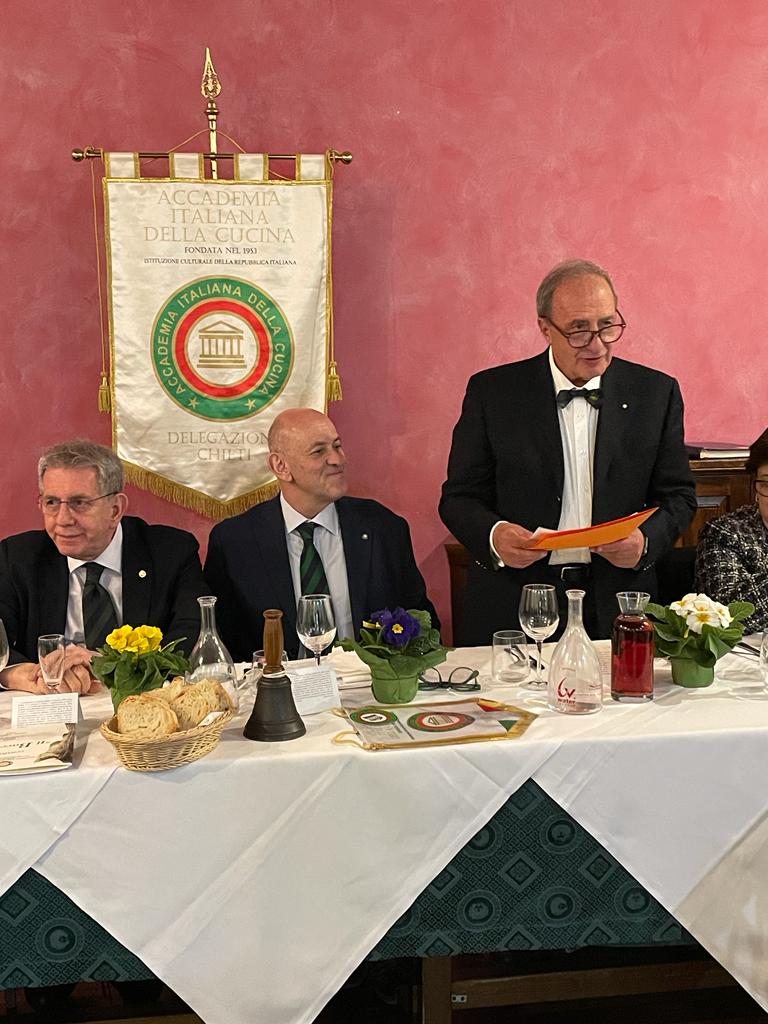 Serata dedicata ad uno dei prodotti che fin dal XV secolo rappresenta un punto fermo per la cucina del territorio, anche se non propriamente abruzzese: il baccalà, protagonista di un evento culturale-gastronomico che ha unito le nove Delegazioni della regione il 16 febbraio, sotto la guida del Coordinatore territoriale e Delegato di Chieti, Nicola D’Auria. Nel convivio teatino, celebrato al ristorante Capsicum nel capoluogo di provincia, grazie al Simposiarca Rocco Del Conte, il Vice Presidente Vicario, Mimmo D’Alessio, ha deliziato gli Accademici e i loro ospiti con una disamina storica della parabola gastronomica del baccalà, che ha proprio nella provincia di Chieti uno dei suoi centri di diffusione e di maggior consumo. La brigata di cucina, guidata da Patrizia Marinucci, è stata attentissima nel riproporre i piatti della tradizione abruzzese collegati con il baccalà, che un tempo erano diffusi in tutte le cucine, soprattutto quelle “povere”. Foto 1. Il Simposiarca Del Conte illustra il menu. Foto 2. VPV Mimmo D’Alessio e Delegato Nicola D’Auria. Foto 3. Accademici e intervento di D’Alessio. Foto 4. Consegna del guidoncino a Patrizia Marinucci.
