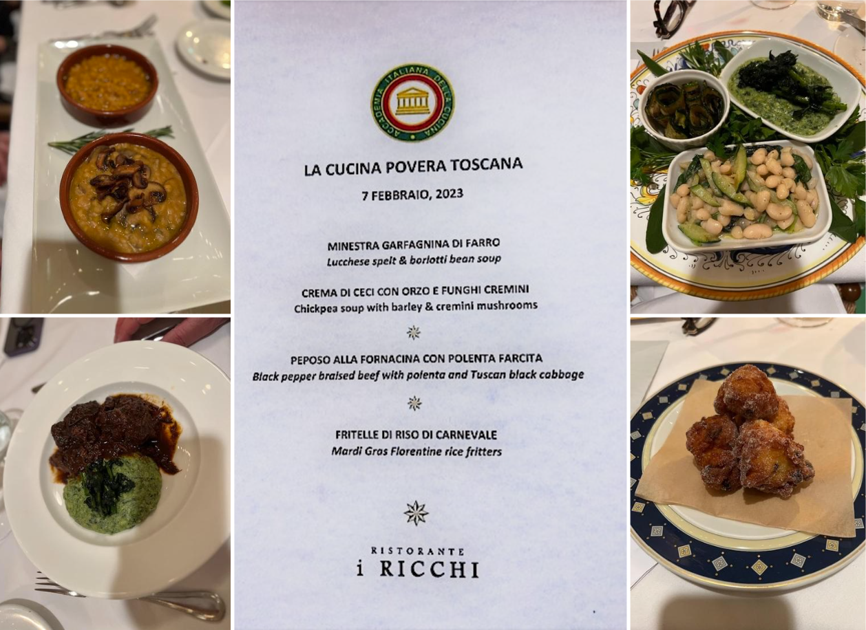 Incontro conviviale della Legazione Washington D.C. al ristorante di cucina toscana “I Ricchi” della chef Christianne Ricchi, nata negli Stati Uniti ma che ha vissuto e gestito un ristorante a Firenze per 17 anni. Il menu della serata accademica si è contraddistinto per l'eccezionale profumo di funghi della minestra garfagnina, le zuppe entrambe ottime per consistenza, cottura, sapore e aromi; il peposo alla Fornacina, ottimo spezzatino per sapore e cottura. Prodotti di qualità e buona carta dei vini.