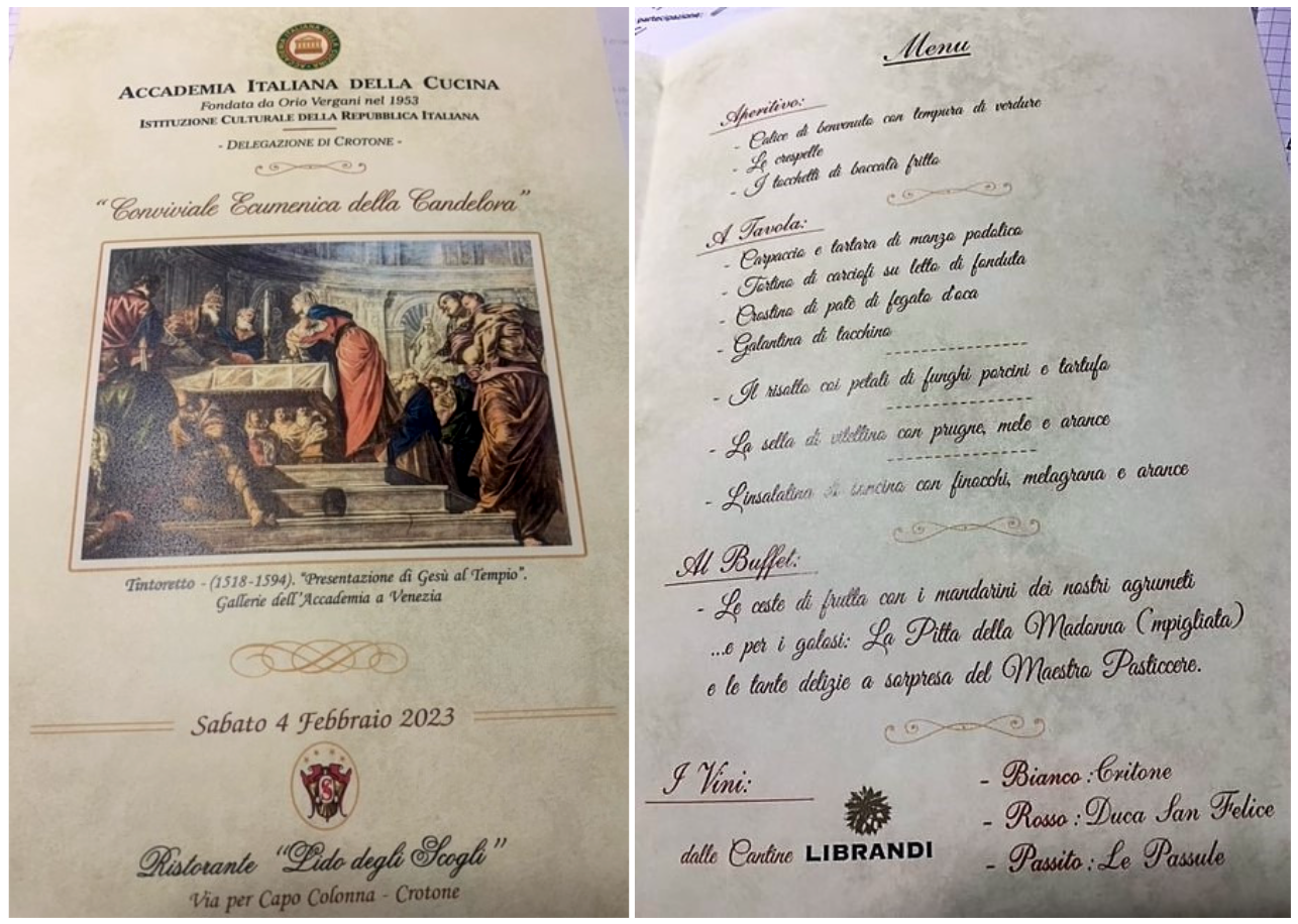 La Delegazione di Crotone, nell’elegante cornice del Salone delle Feste dell’Hotel Ristorante “Lido degli Scogli ‘’, ha organizzato la "riunione conviviale della Candelora”. Non avendo avuto luogo la conviviale natalizia di dicembre per motivi contingenti, in questa occasione d’incontro è stato mantenuto lo stesso ricco menu programmato per il Natale. La serata è stata molto partecipata e nell’occasione il Rettore della Basilica Cattedrale, Monsignor Alessandro Saraco, ha tenuto una interessante conversazione spaziando dal Natale fino al giorno della Candelora (2 febbraio). Al momento del dessert, per la concomitante presenza di un ospite milanese, si è voluto omaggiarla a sorpresa con i panettoni della tradizione milanese per San Biagio.