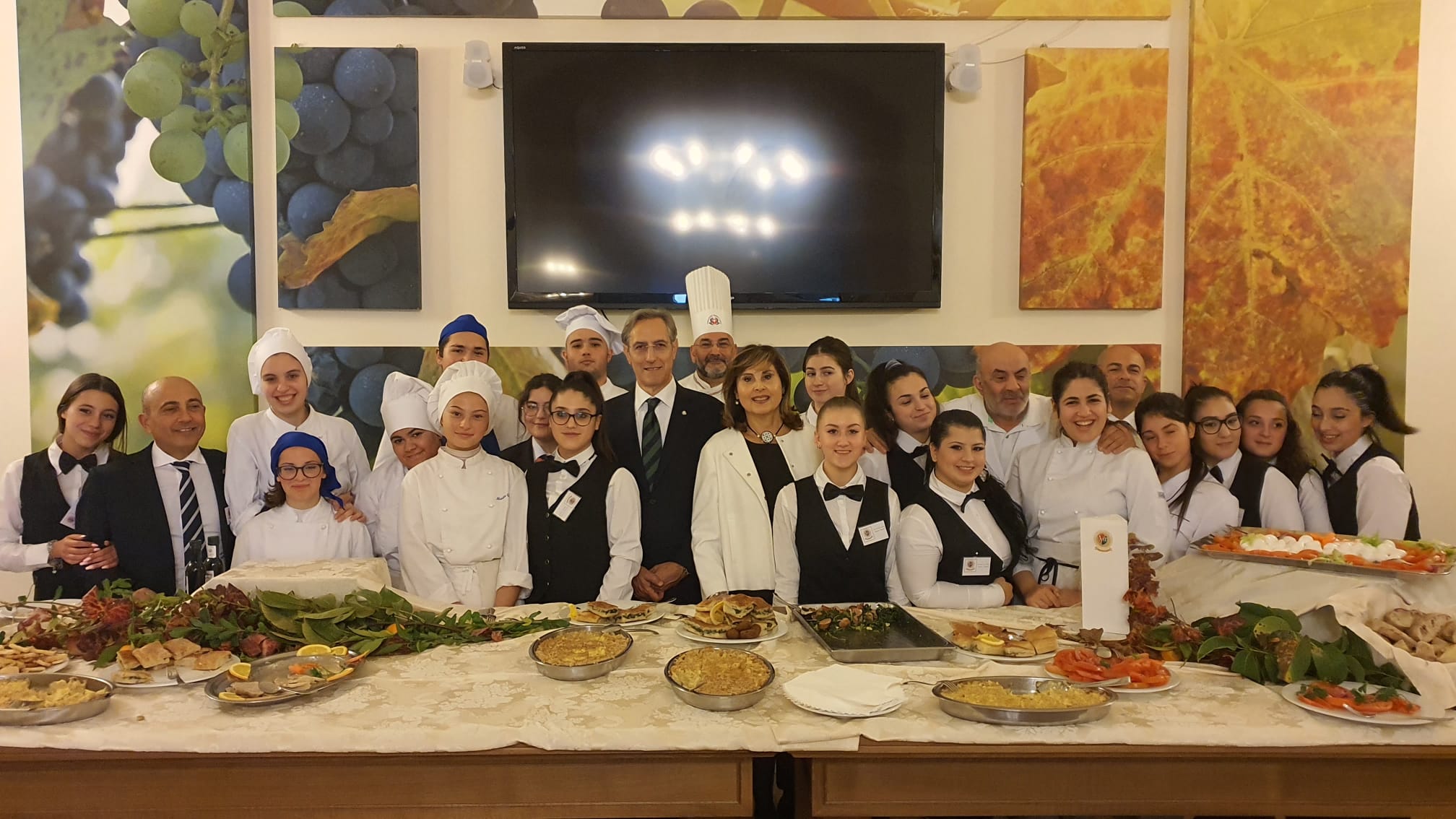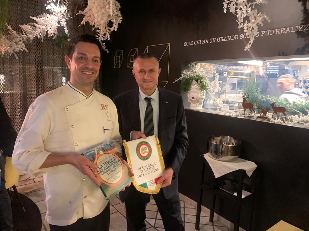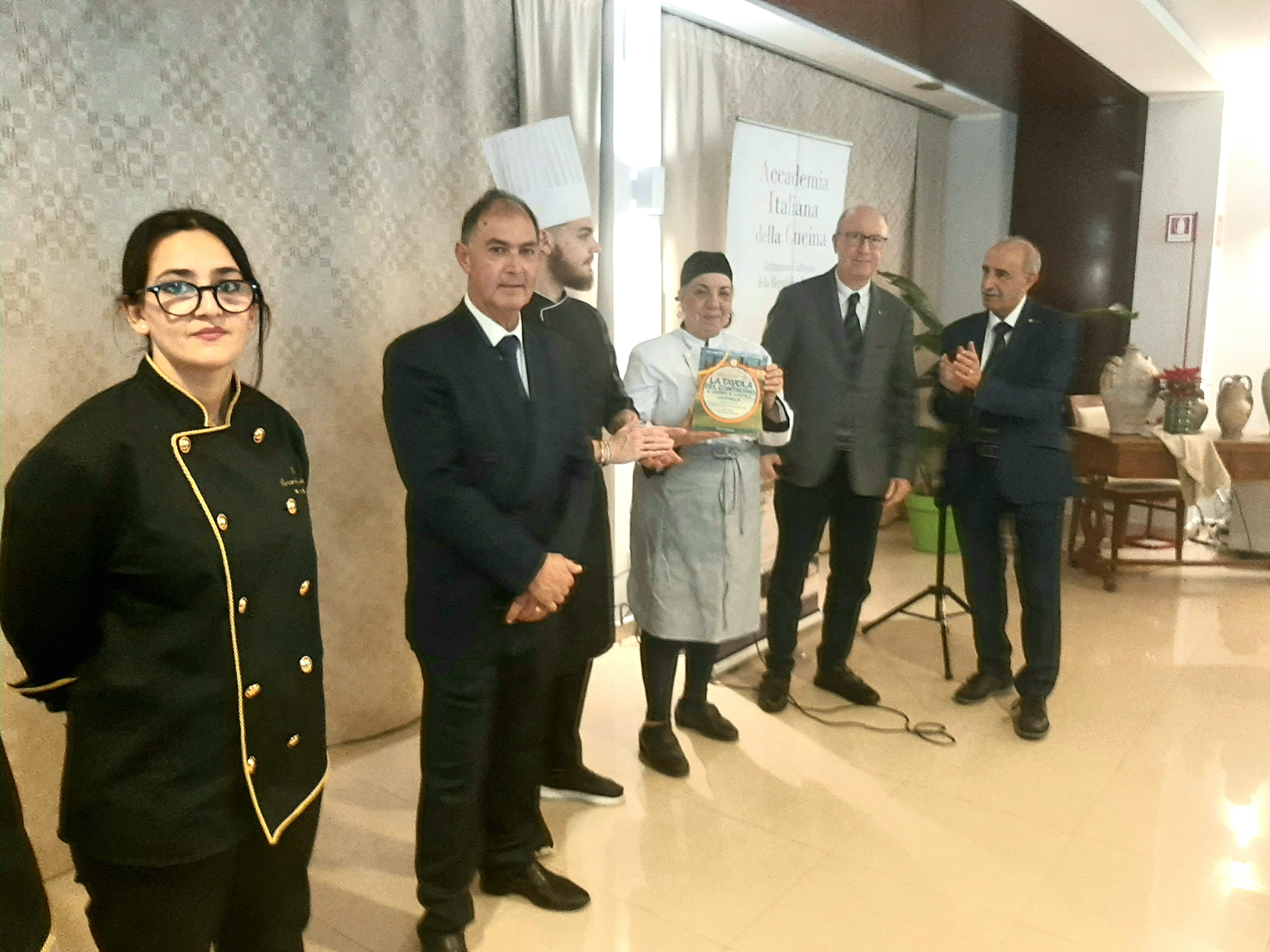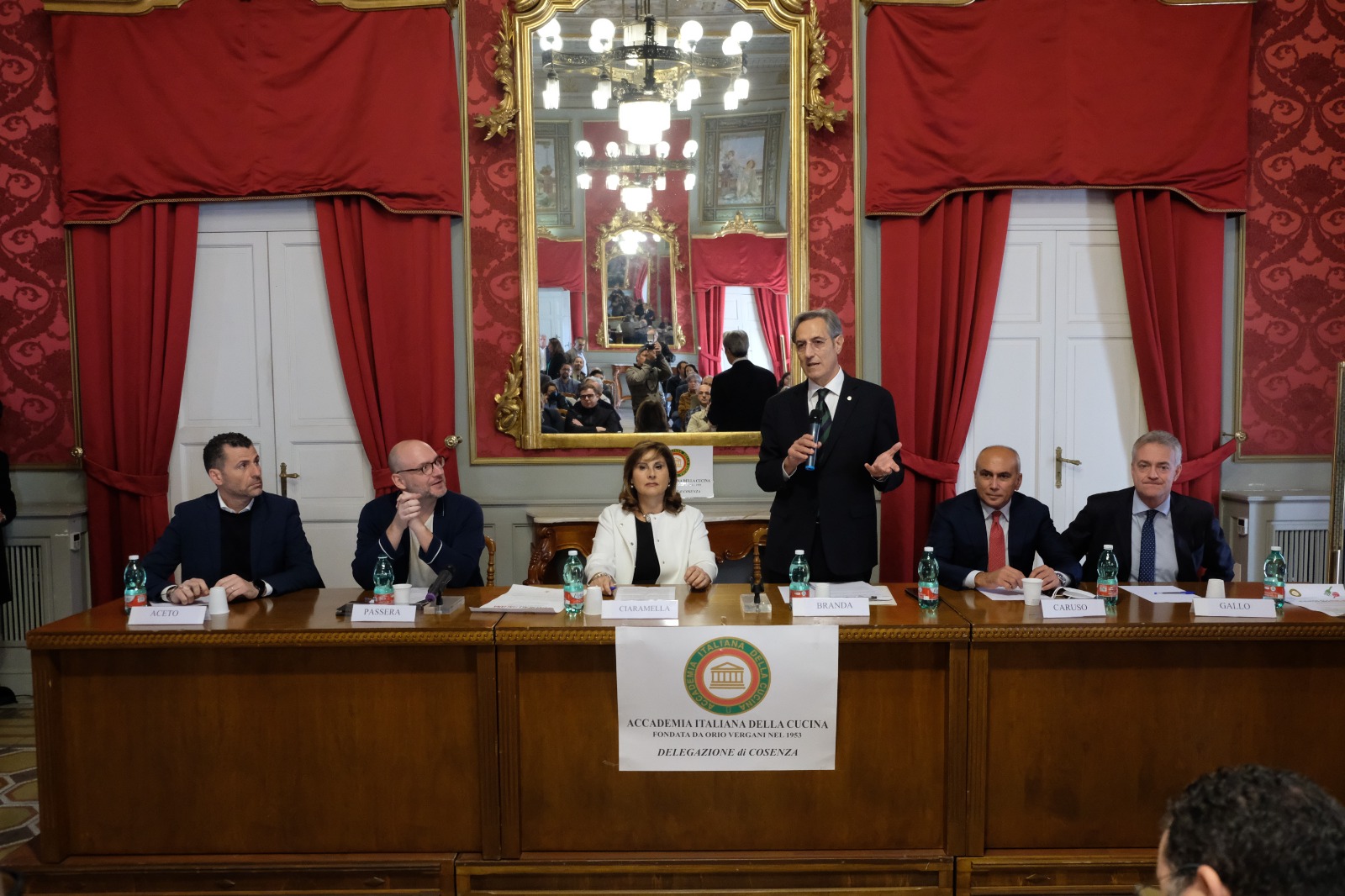 “Gli ingredienti della cucina di territorio per la salute delle persone e la tutela del pianeta”, è il tema scelto dalla Delegazione cosentina per l’iniziativa che si è tenuta sabato 19 novembre nella “Sala degli Specchi” della Provincia di Cosenza (foto 1). L’evento, molto partecipato (foto 2), ha richiamato le iniziative mondiali della VII settimana della Cucina Italiana nel Mondo. Particolarmente coinvolgente il momento della consegna dei premi assegnati per il 2022 ad Antonio Biafora del ristorante Hyle con il “Diploma di Cucina Eccellente”; il premio "Giovanni Nuvoletti” a Francesca De Marco del ristorante 87Cento; il premio “Dino Villani” al produttore Stefano Renzelli per la “Varchiglia di Cosenza” ed il premio “Massimo Alberini” a Mario Grillo per l'esercizio commerciale Fattoria Biò. Apprezzamenti unanimi da parte delle autorità intervenute per le attività dell’Accademia, così come per la qualità degli interventi degli chef relatori Luca ed Antonio Abbruzzino, Nicola Annunziata, Antonio Biafora, Nino Rossi e Riccardo Sculli, con il botanico Carmine Lupia, sotto lo stimolo del giornalista Carlo Passera (foto 3 con premiati e Consultori della Delegazione). A chiusura dei lavori, una degustazione dei prodotti di territorio a cura degli allievi dell’IIS Mancini-Tommasi di Cosenza guidato dalla dirigente Graziella Cammalleri (in foto 4 con il Prefetto).