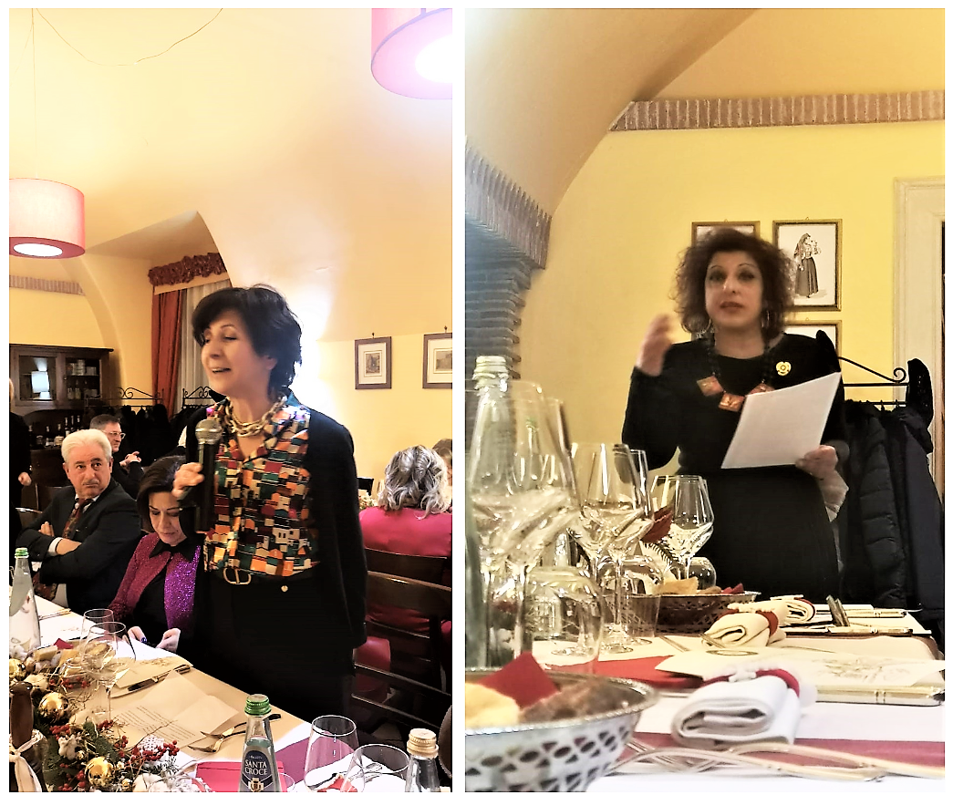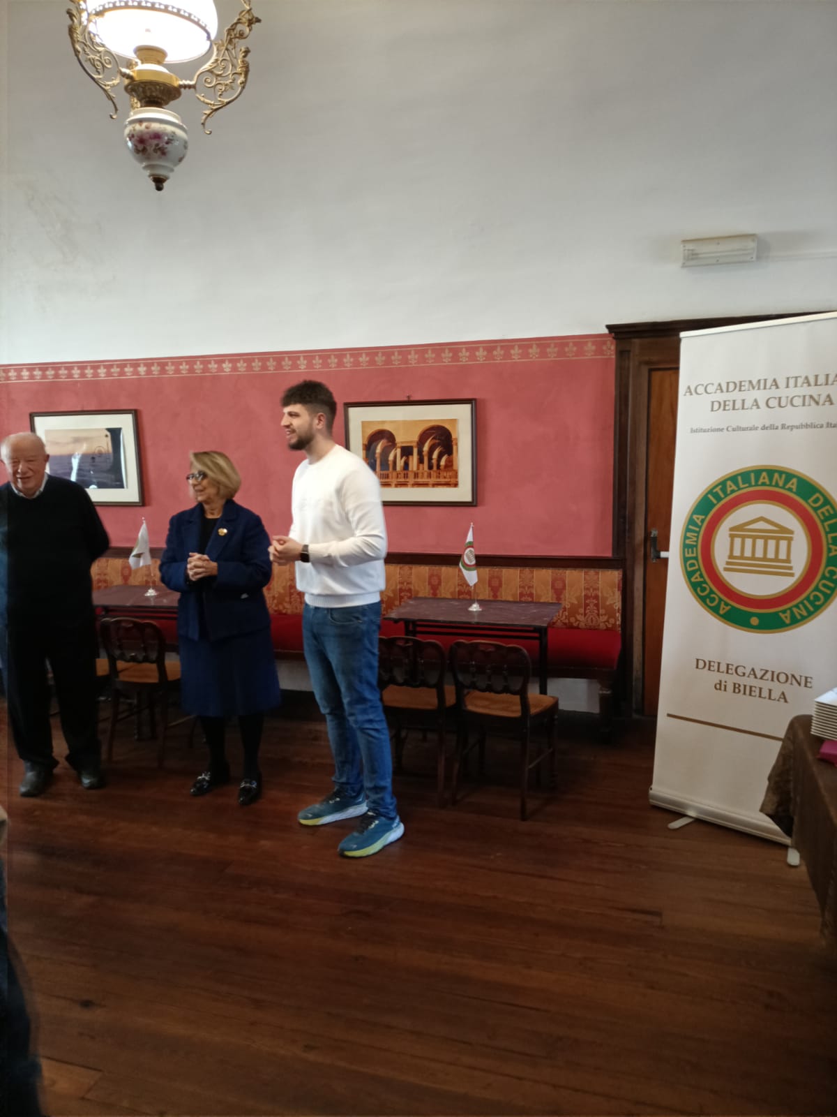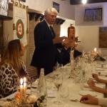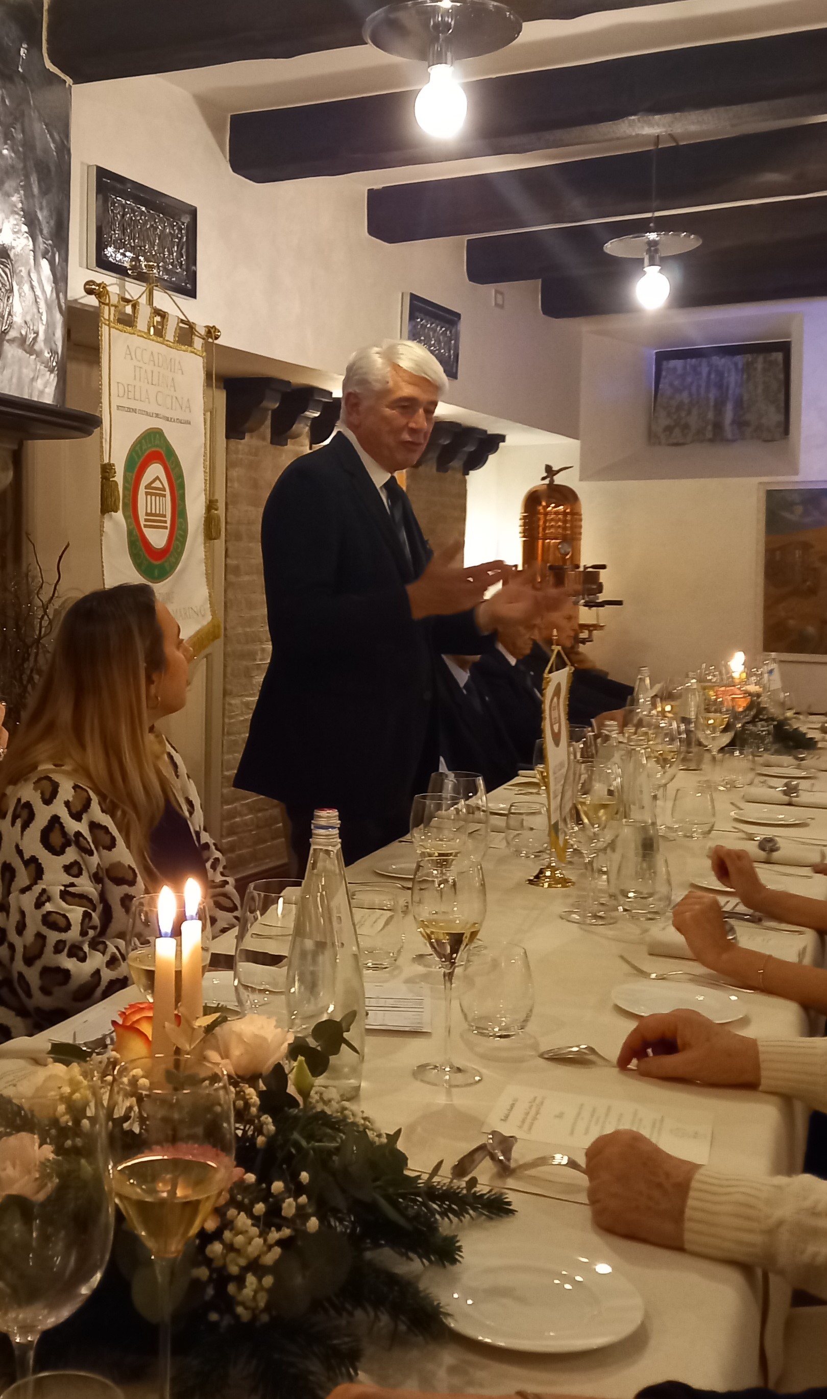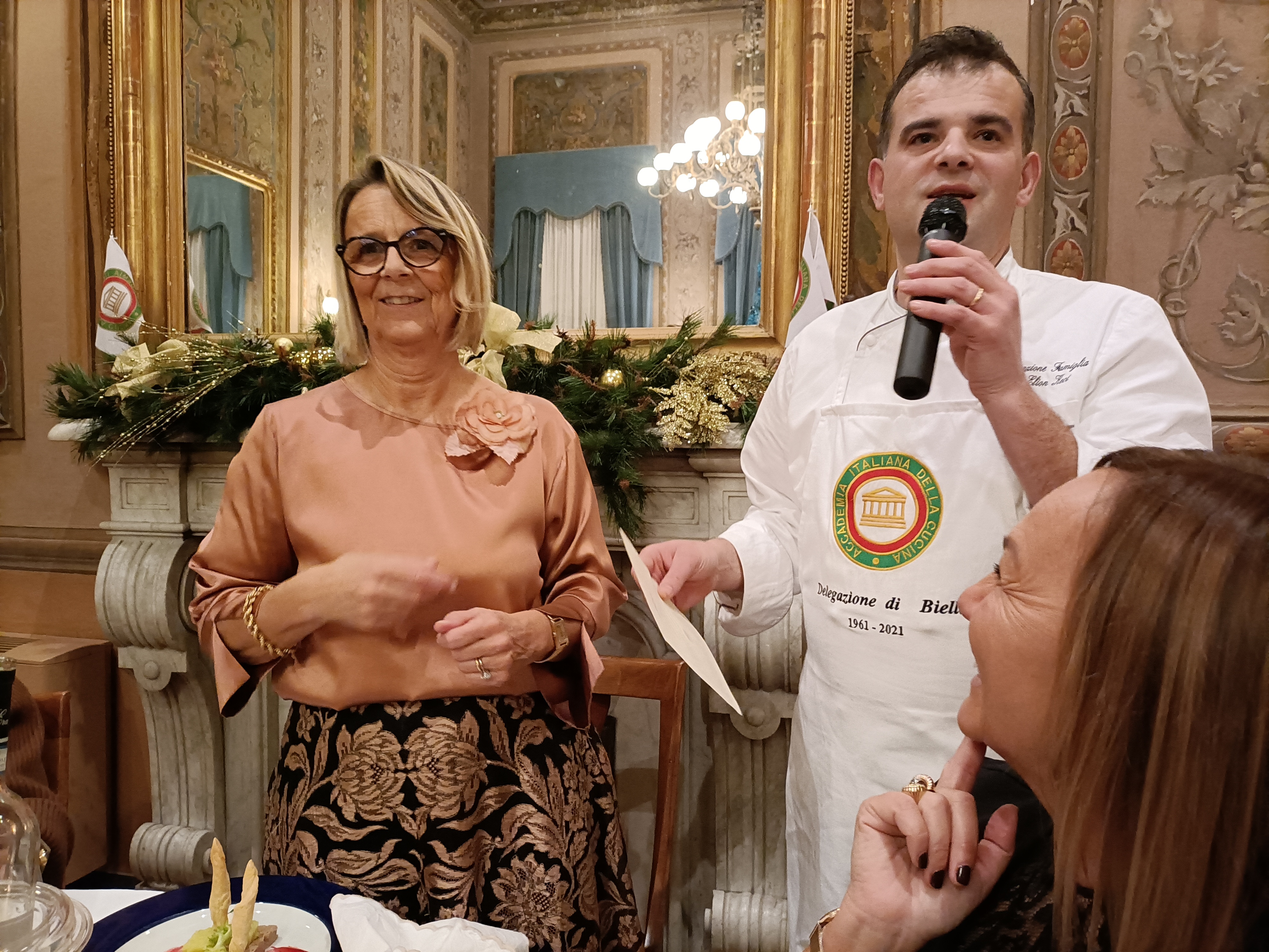 Il Circolo Sociale Biellese ha ospitato il convivio degli auguri della Delegazione di Biella. È stata una serata organizzata all’insegna della tradizione natalizia e dell’eleganza, con addobbi, candele accese e tavole decorate. Anche il menu proposto dal cuoco Elion Keci, gestore del Circolo, richiamava la tradizione piemontese: un classico aperitivo, paté di selvaggina, ravioli ai tre arrosti, faraona ripiena, panettone con zabaione. Bell’atmosfera di convivialità e di chiacchere tra i numerosi Accademici presenti e i loro ospiti, tra cui il Procuratore Capo della Repubblica di stanza a Biella Teresa Angela Camelio accompagnata dal consorte Accademico di Pisa, Massimo Messina, il Delegato di Ivrea, Maurizio Rossi, e la vice Delegata del Monferrato Alessandra Bellaria. La serata si è conclusa con un brindisi e i ringraziamenti al cuoco del Circolo. 1.Tavolo con Delegata Bertotto, il Delegato di Ivrea e la vice Delegata del Monferrato. 2. Visione della sala con l’Accademico Meliga mentre illustra i vini. 3. Delegata Bertotto e Chef Elion Keci illustrano il menu. Foto 4. Chef Elion Keci serve lo zabaione.