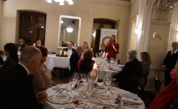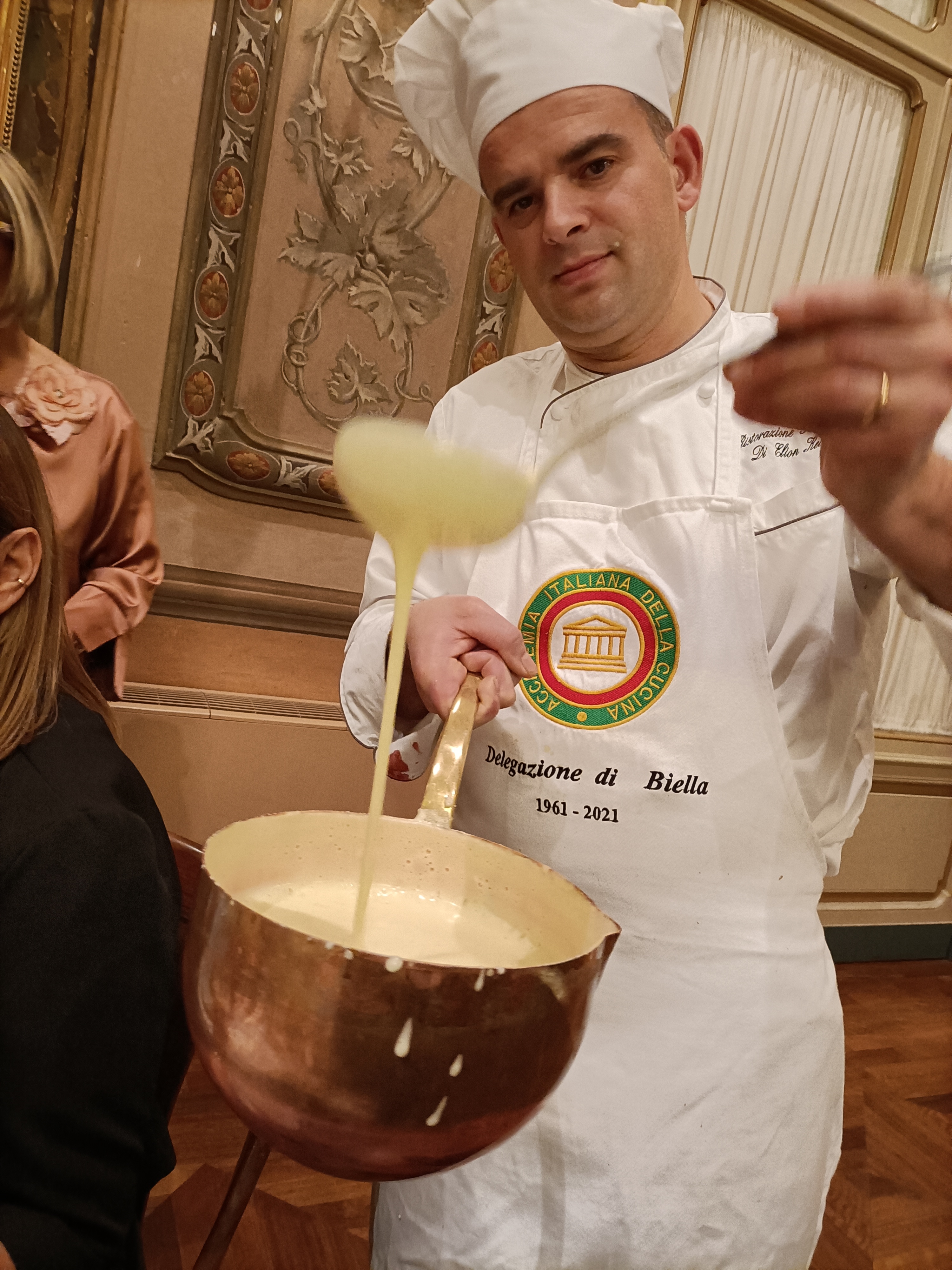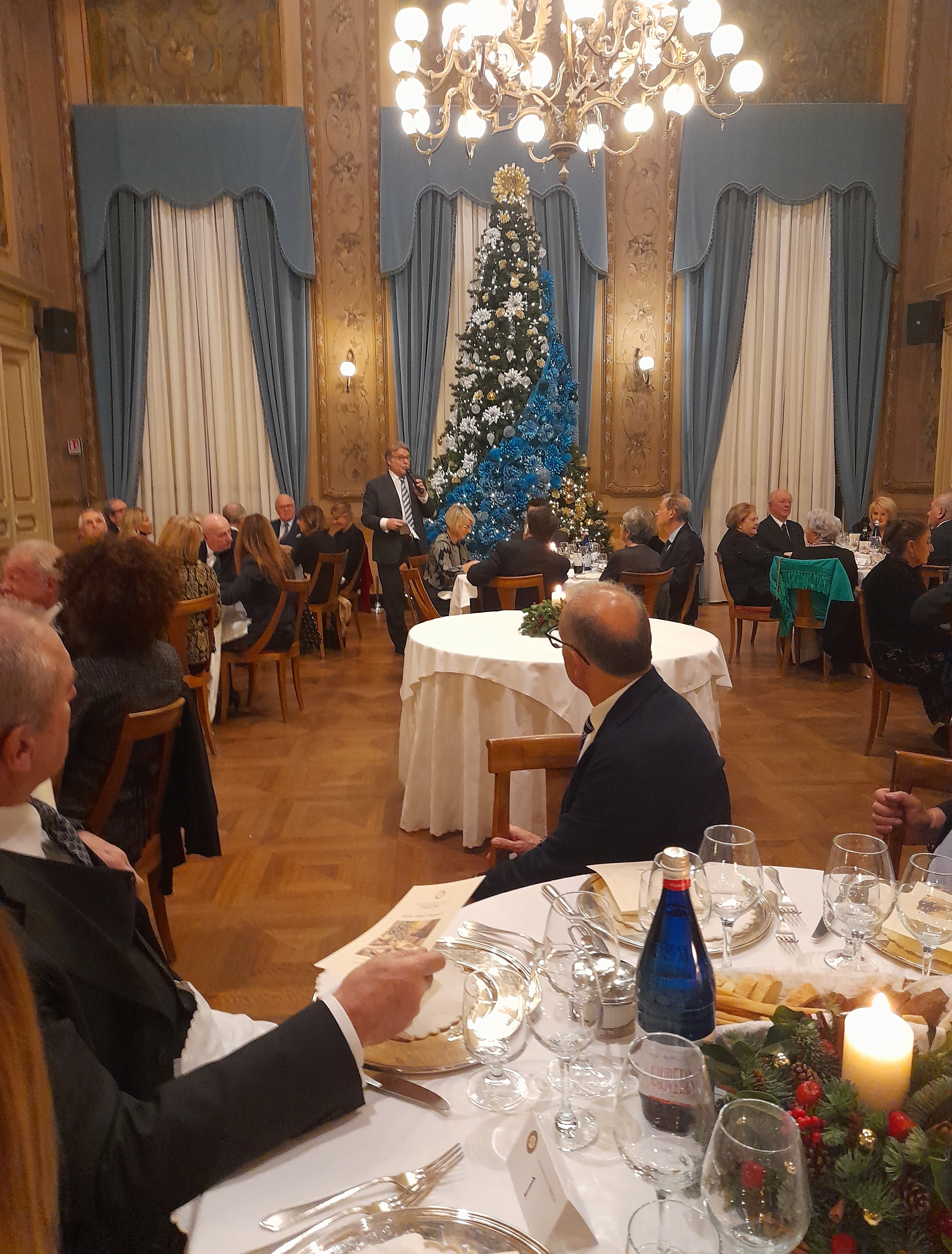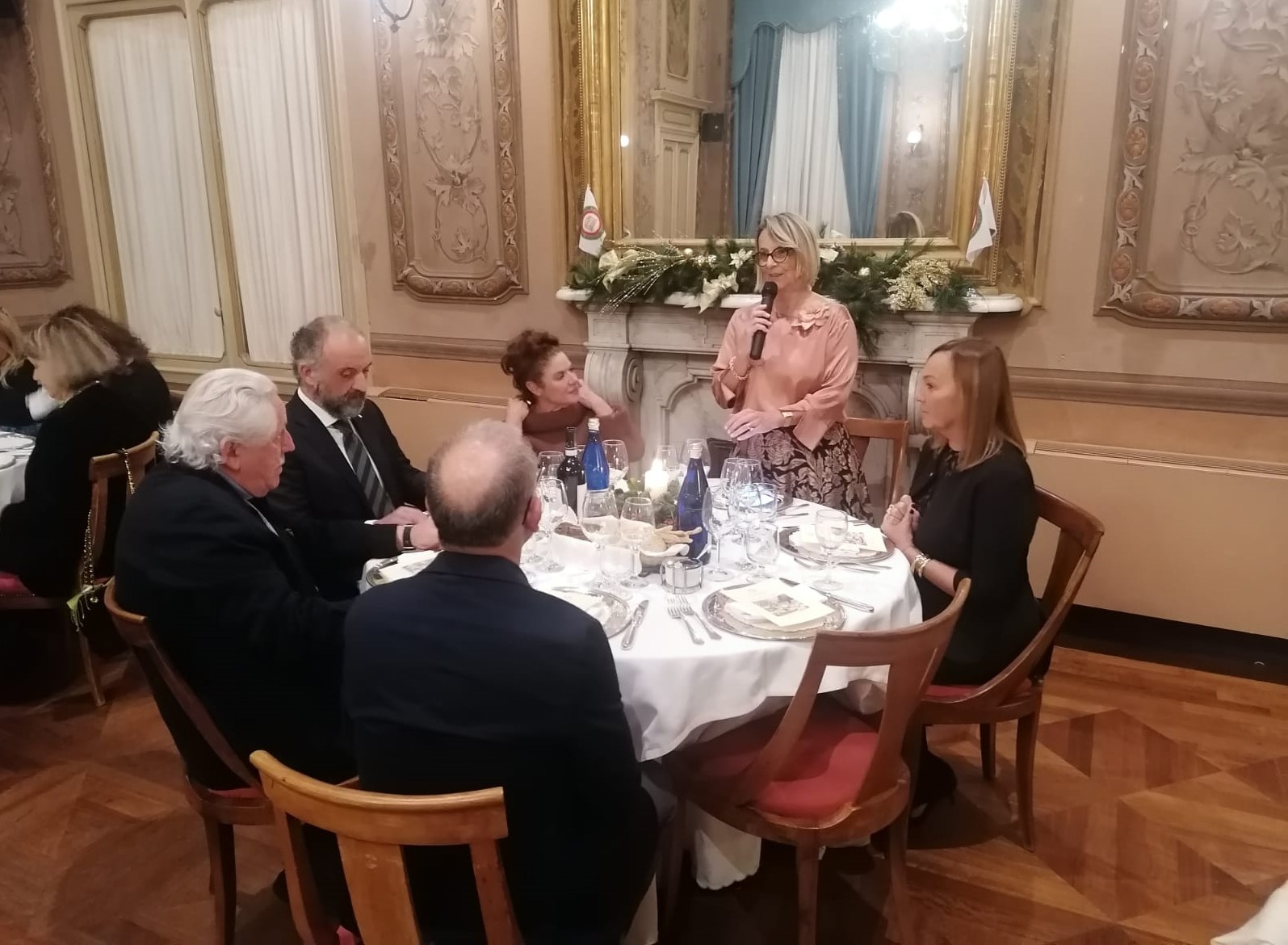 Il Circolo Sociale Biellese ha ospitato il convivio degli auguri della Delegazione di Biella. È stata una serata organizzata all’insegna della tradizione natalizia e dell’eleganza, con addobbi, candele accese e tavole decorate. Anche il menu proposto dal cuoco Elion Keci, gestore del Circolo, richiamava la tradizione piemontese: un classico aperitivo, paté di selvaggina, ravioli ai tre arrosti, faraona ripiena, panettone con zabaione. Bell’atmosfera di convivialità e di chiacchere tra i numerosi Accademici presenti e i loro ospiti, tra cui il Procuratore Capo della Repubblica di stanza a Biella Teresa Angela Camelio accompagnata dal consorte Accademico di Pisa, Massimo Messina, il Delegato di Ivrea, Maurizio Rossi, e la vice Delegata del Monferrato Alessandra Bellaria. La serata si è conclusa con un brindisi e i ringraziamenti al cuoco del Circolo. 1.Tavolo con Delegata Bertotto, il Delegato di Ivrea e la vice Delegata del Monferrato. 2. Visione della sala con l’Accademico Meliga mentre illustra i vini. 3. Delegata Bertotto e Chef Elion Keci illustrano il menu. Foto 4. Chef Elion Keci serve lo zabaione.