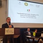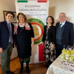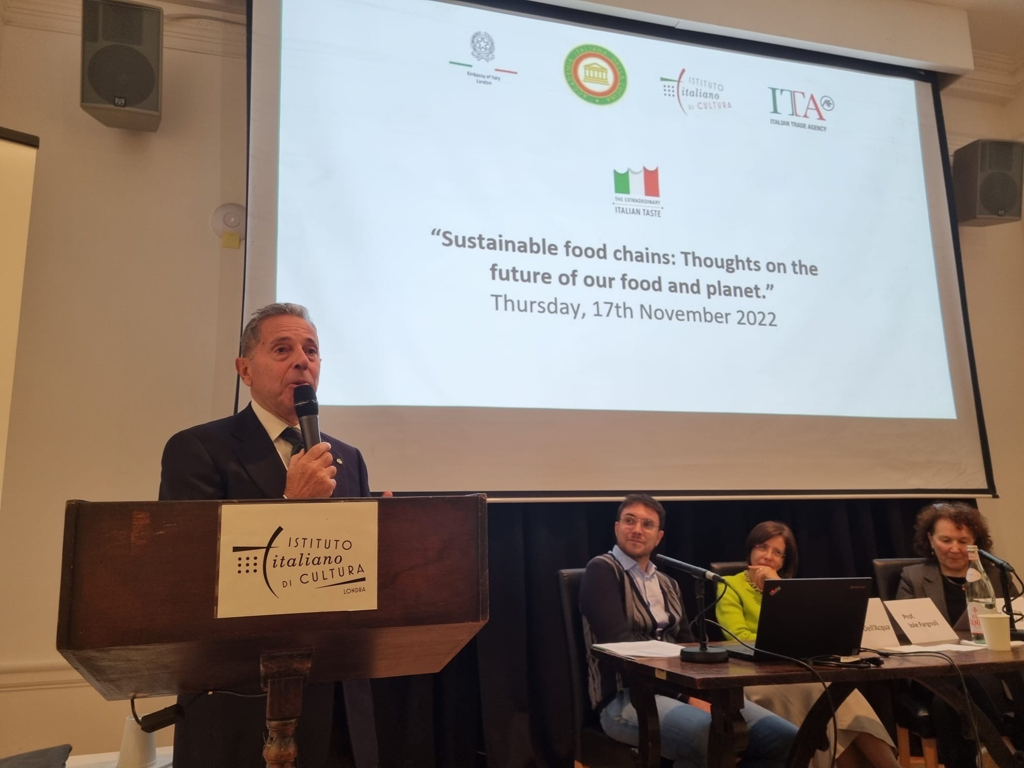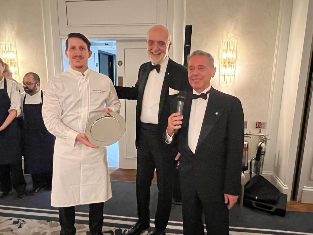 Nella programmazione degli eventi promossi a Londra, la Delegazione locale ha organizzato il 17 novembre, in collaborazione con ICE/ITA e l’IIC DI Londra e con il patrocinio dell’Ambasciata d’Italia a Londra, l’interessante tavola rotonda “Sustainable food chains: thoughts on the future of the planet”. L’evento si è tenuto alla presenza di un pubblico numeroso, importanti ospiti ed esperti relatori che hanno illustrato I progetti e le tecniche della genetica nella catena alimentare, l’impatto sulla nutrizione delle popolazioni osservate ed evidenziato come il problema della catena alimentare venisse affrontato fin dai tempi del Romani. La serata si è conclusa con un ricco aperitivo preparato dallo chef Enzo Oliveri. Il giorno precedente, il Delegato Fazzari è stato invitato dall’ICE a partecipare alla masterclass dello chef Theo Randall per gli alunni della Westlondon University, un’iniziativa che ha registrato un grande successo per il secondo anno consecutivo, come sottolineato dal Delegato e Vice Presidente Fazzari. Il 20 novembre, la Delegazione ha ospitato il Gala conclusivo della SCIM negli splendidi locali del ristorante Al Mare del Jumeirah Carlton Tower. Simposiarche, le Consultrici Silvia Mazzola e Lucille Perricone che hanno interpretato con maestria la serata curata dallo chef Marco Calenzo. Tra gli illustri ospiti, S.E. l’Amb. Inigo Lambertini, il Min. Riccardo Smimmo, il Console Generale Domenico Bellantone, il Cons. Econ. Dino Sorrentino, il Direttore dell’ICE/ITA Giovanni Sacchi, il Presidente della Camera di Commercio Alessandro Belluzzo. L’Ambasciatore ha ricordato l’importanza degli eventi della Settimana e ringraziato l’Accademia per il lavoro che costantemente svolge. Il Delegato Fazzari ha riassunto gli eventi della SCIM, illustrato il menu e ringraziato i membri della Consulta; ha inoltre annunciato la imminente diffusione del libro “La Cucina italiana a fumetti” in lingua inglese. La serata si è conclusa con la consegna del piatto accademico allo chef da parte del Delegato con i complimenti dell’Ambasciatore.