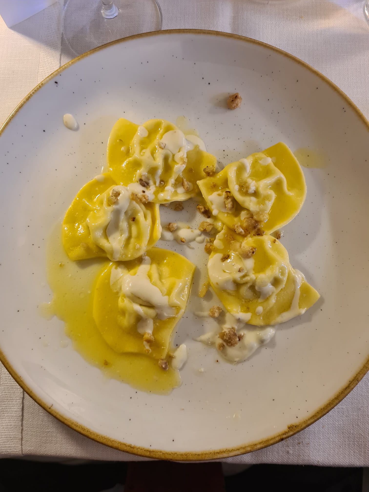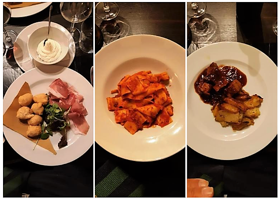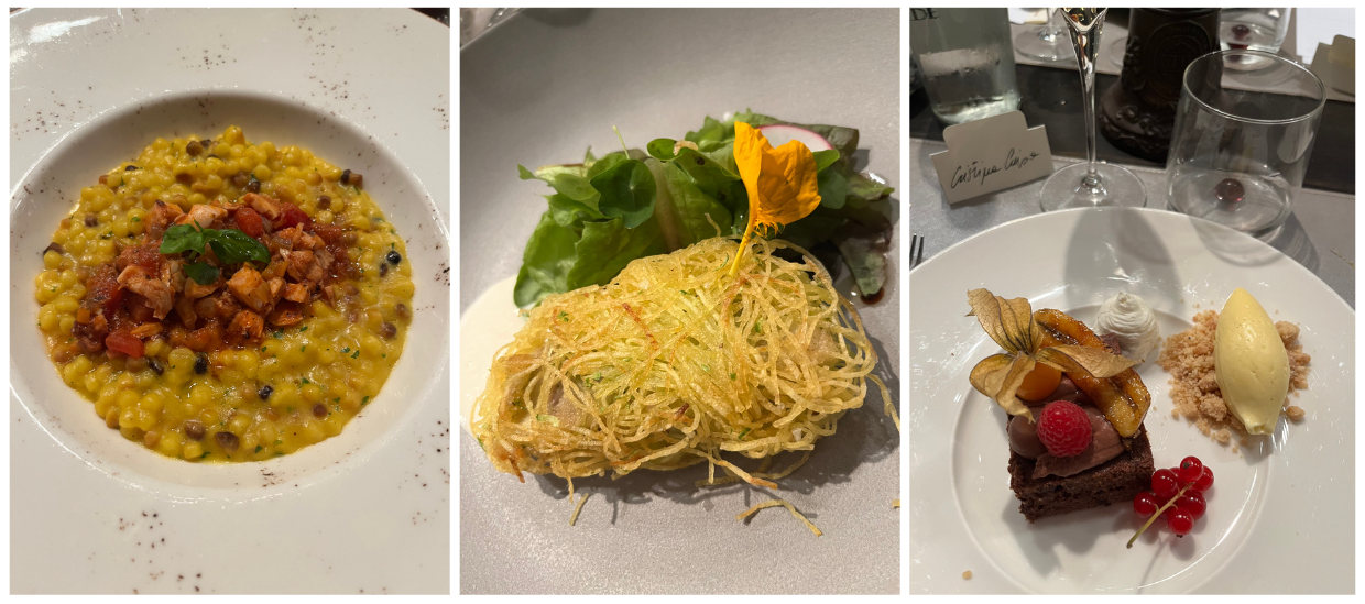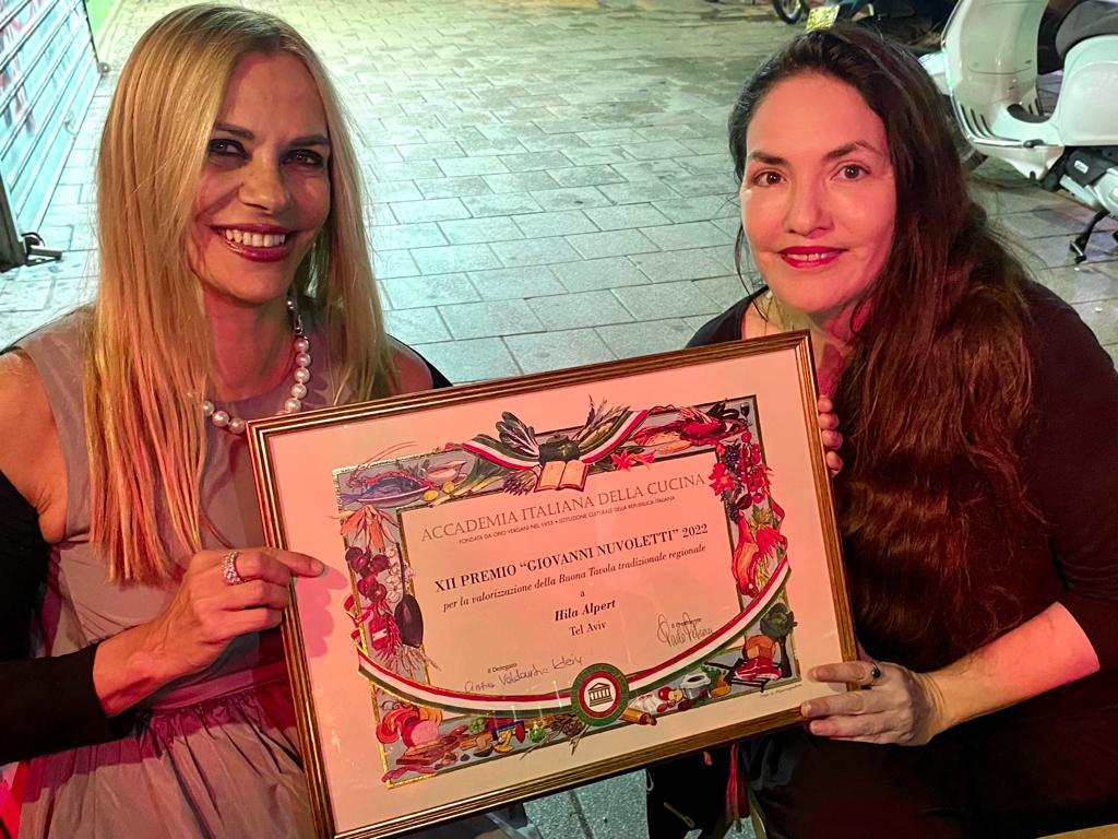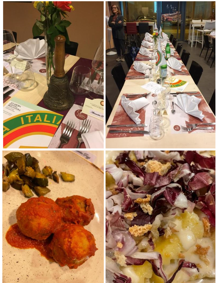 Riunione conviviale della Delegazione di Tel Aviv presso il ristorante Calabria, locale inaugurato di recente, durante la quale è stato consegnato il Premio Nuvoletti 2022 alla giornalista culinaria Hila Alpert che promuove e sostiene il cibo italiano di qualità in Israele nei suoi programmi televisivi, sulla stampa locale e sui canali social. Alla cena ha partecipato una rappresentanza ristretta della Delegazione per via delle dimensioni raccolte del locale. L'atmosfera del ristorante è piacevole e in stile con i ristoranti in voga a Tel Aviv, i piatti adattati un po’ troppo alle esigenze dei palati degli israeliani con, ad esempio, un uso spropositato del parmigiano. Una tendenza generale a Tel Aviv che la Delegazione sta cercando di contrastare. La serata è stata comunque molto piacevole e divertente, all'insegna della vera convivialità italiana. Foto 1 e 2. La premiata Hila Alpert con la Delegata Cinzia Klein e con Accademici. Foto 3. Accademici, la Delagata e il proprietario Benzi. Foto 4. Le portate.