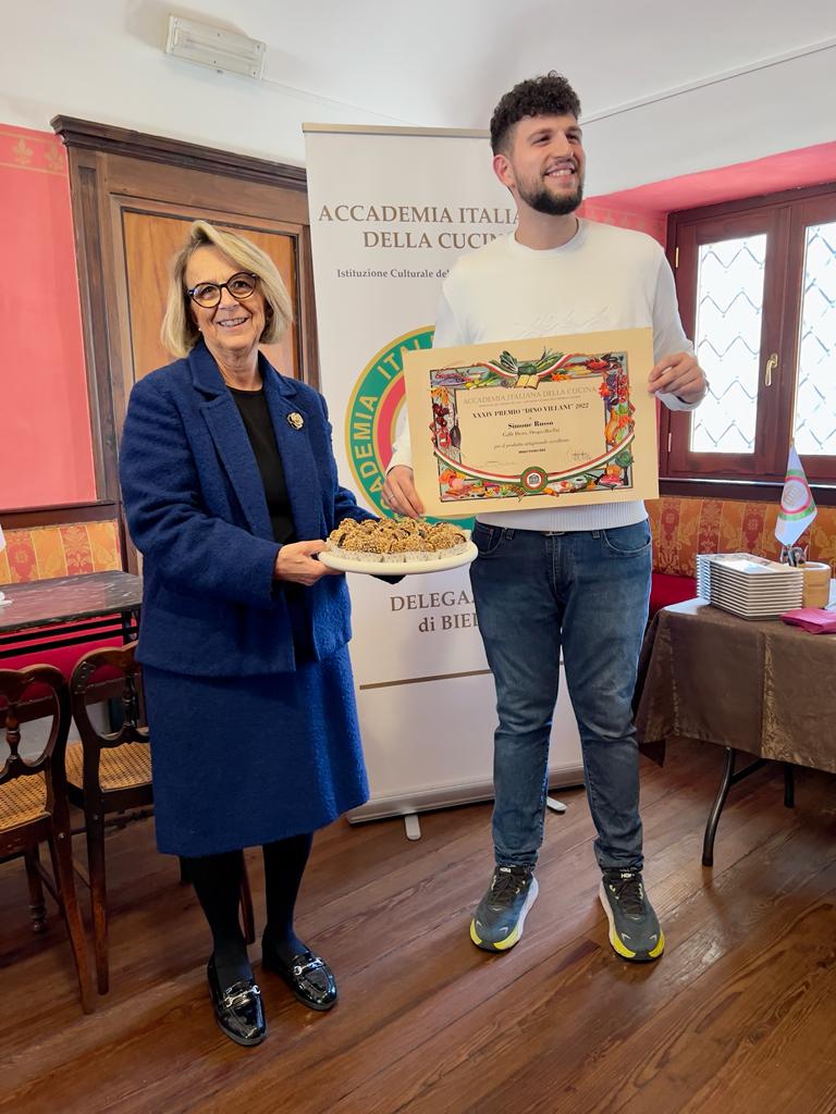 La Delegazione ha proposto l’assegnazione del Premio Dino Villani 2022 ad un prodotto caro alla memoria di molti Biellesi: i biscotti Mucroncini dello storico Caffè Deiro del Santuario di Oropa. I biscotti prendono il nome dal monte che sovrasta la conca di Oropa, il Monte Mucrone, appunto. La ricetta di questi biscotti risale all'inizio del secolo scorso grazie ad un pasticcere di Biella che forniva il caffè con i suoi prodotti ed è arrivata a noi grazie all'intraprendenza del nuovo titolare del locale, Simone Russo. Simone è un giovane ventenne che ha portato avanti la tradizione con entusiasmo. Nei mesi freddi il Caffè Deiro era famoso per la cioccolata calda con panna accompagnata da dolci vari come i Mucroncini, doppi biscotti morbidi alla nocciola IGP Piemonte accoppiati con ganache di cioccolato fondente piemontese e granella di nocciola all'esterno.