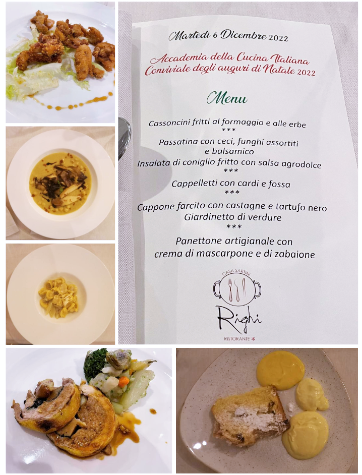 Martedì 6 dicembre si è svolta la riunione conviviale degli auguri presso il ristorante Righi-Casa Sartini nel cuore del centro storico di San Marino. Lo chef Luigi Sartini ha accolto gli Accademici con un menu che conferma tutte le sue esperienze, la conoscenza della tradizione e del territorio, l’amore per il suo lavoro e la fantasia dei piatti, ingredienti necessari per reinterpretare ogni giorno la sua cucina ed esaltarne i pregi. Bellissima serata con gli auguri per le feste che il Delegato ha rivolto ai presenti anticipando alcune proposte per il 2023, in un'atmosfera di amicizia e cordialità, testimonianza del piacere di ritrovarsi.