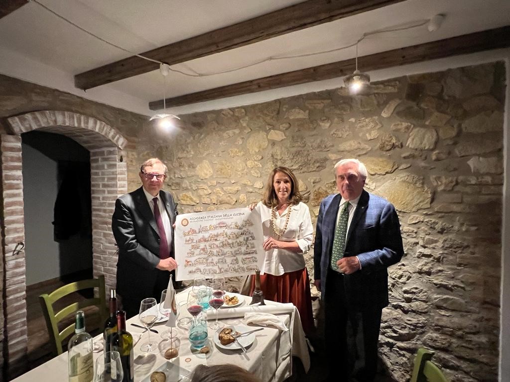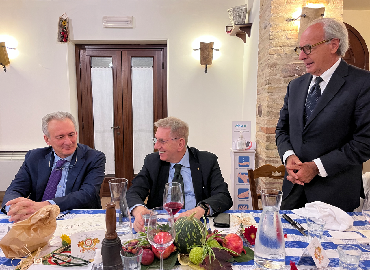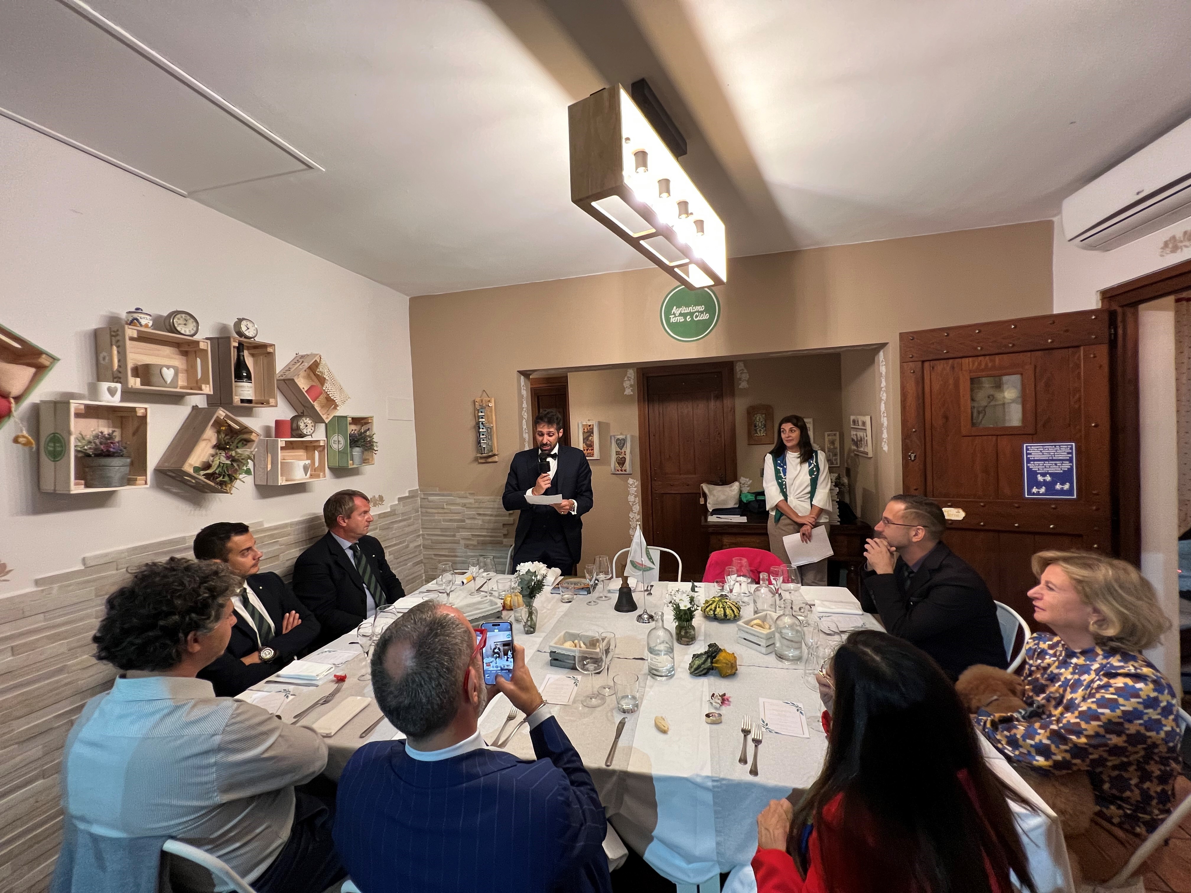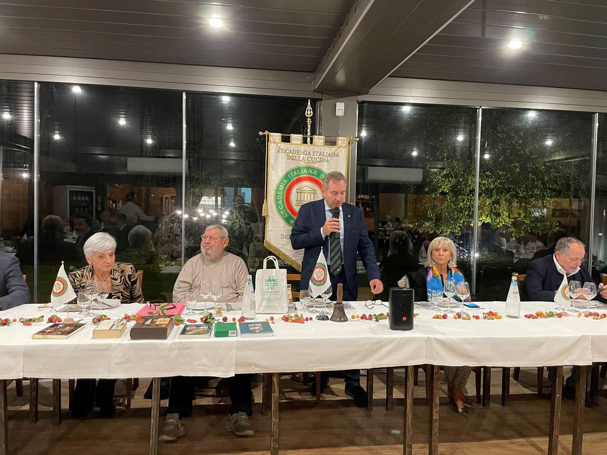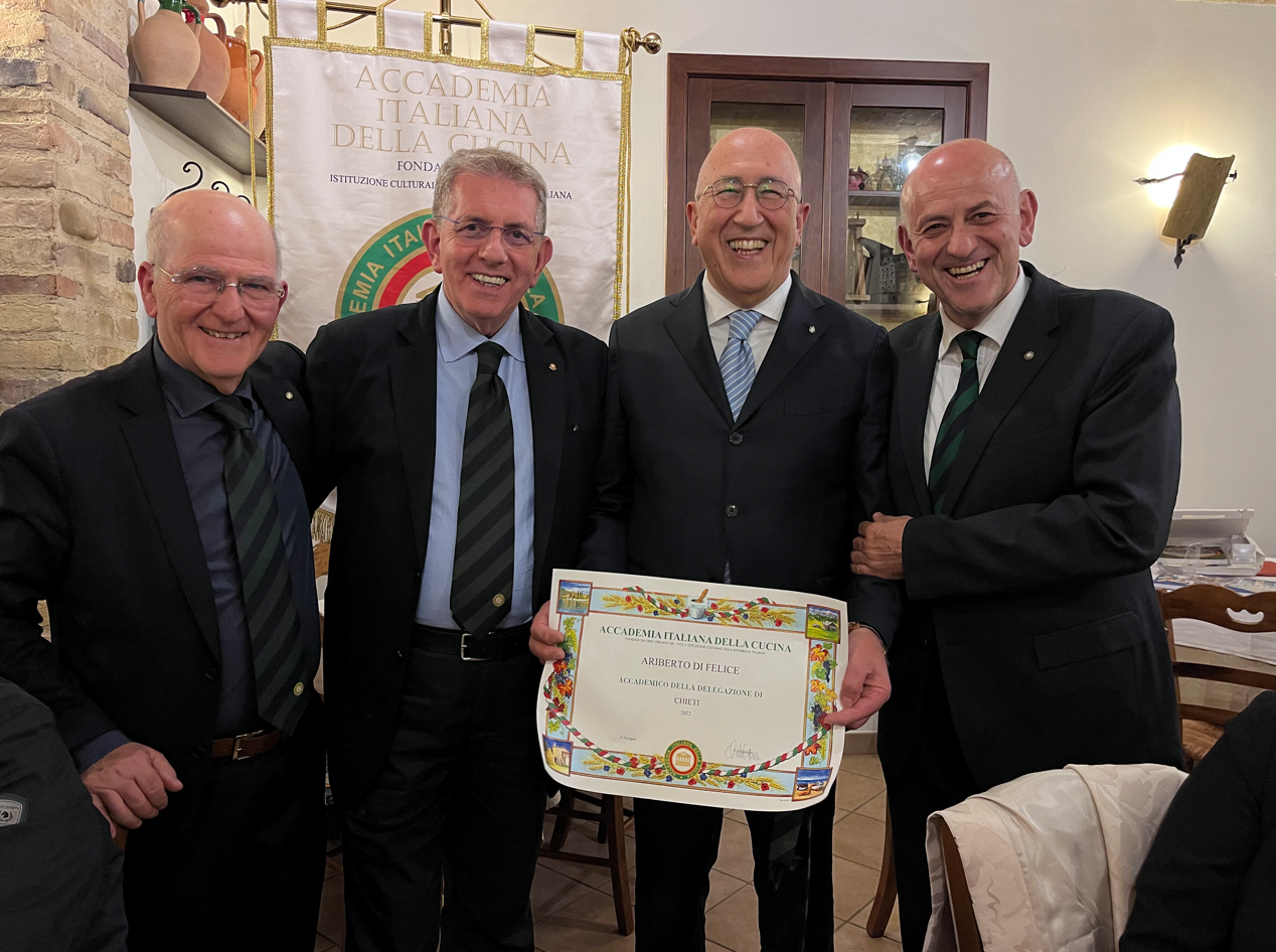 Per tornare alle origini e ritrovare i piatti della "tavola del contadino" la Delegazione di Chieti, guidata da Nicola D’Auria, ha scelto di visitare uno degli storici agriturismi del territorio, quello di "Zà Culetta" nelle campagne frentane di Rocca San Giovanni. Nella relazione tenuta dal Direttore del Centro Studi Territoriale, Maurizio Adezio, la memoria degli Accademici e degli ospiti presenti - tra i quali il prefetto di Chieti Armando Forgione, l'arcivescovo di Lanciano-Ortona mons. Emidio Cipollone e il presidente dell'Ordine dei Giornalisti d'Abruzzo Stefano Pallotta - è andata subito al tempo lento e scandito dalle stagioni, alla convivialità di una tavola condivisa, al ritorno alle origini, al recupero di piatti che sostentavano intere famiglie quando il "km0" era l’unica possibilità. Nel corso del convivio ecumenico, dopo tre anni di postulandato, Ariberto Di Felice è stato ammesso a pieno titolo tra gli Accademici teatini: ad appuntargli il distintivo è stato il vice Presidente vicario, Mimmo D'Alessio, che ha ricordato a tutti presenti il senso dei convivi accademici e dell’importanza del ruolo della nostra Associazione. Numerosi gli interventi tra una portata e l’altra in un clima festoso e conviviale.