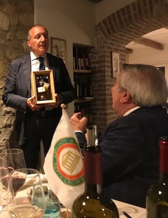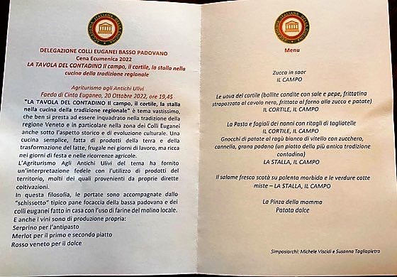 La Delegazione Colli Euganei-Basso Padovano per il tema di quest'anno ha scelto l'agriturismo “Agli Antichi Ulivi” a Faedo di Cinto Euganeo. Fabio, Monica e Luigi hanno interpretato fedelmente "La tavola del contadino" anche sotto l’aspetto storico e di evoluzione culturale. Una cucina semplice, con l’utilizzo di prodotti del territorio, molti dei quali provenienti da proprie dirette coltivazioni. Le portate sono state accompagnate dallo “schissotto” tipico pane focaccia della bassa padovana fatto in casa con l’uso di farine del molino locale e dai vini di produzione propria da vitigni autoctoni della zona. La serata è stata l'occasione per dare il benvenuto a Sergio Bertasi, già Delegato di Pechino, rientrato in Italia nella Delegazione Colli Euganei. Ospite speciale Giuseppe Landini, Vice Delegato di Bologna che, essendo di passaggio in zona, non ha voluto perdere l'appuntamento annuale con la cena ecumenica.
