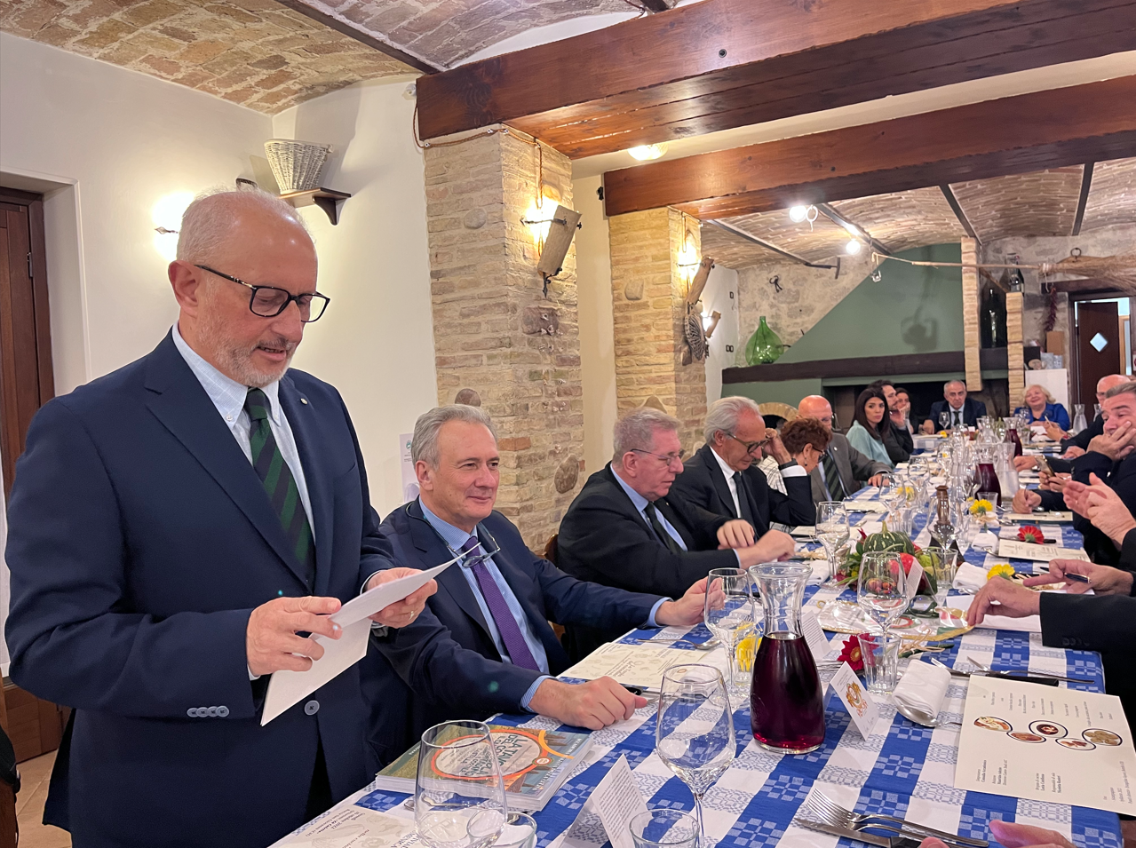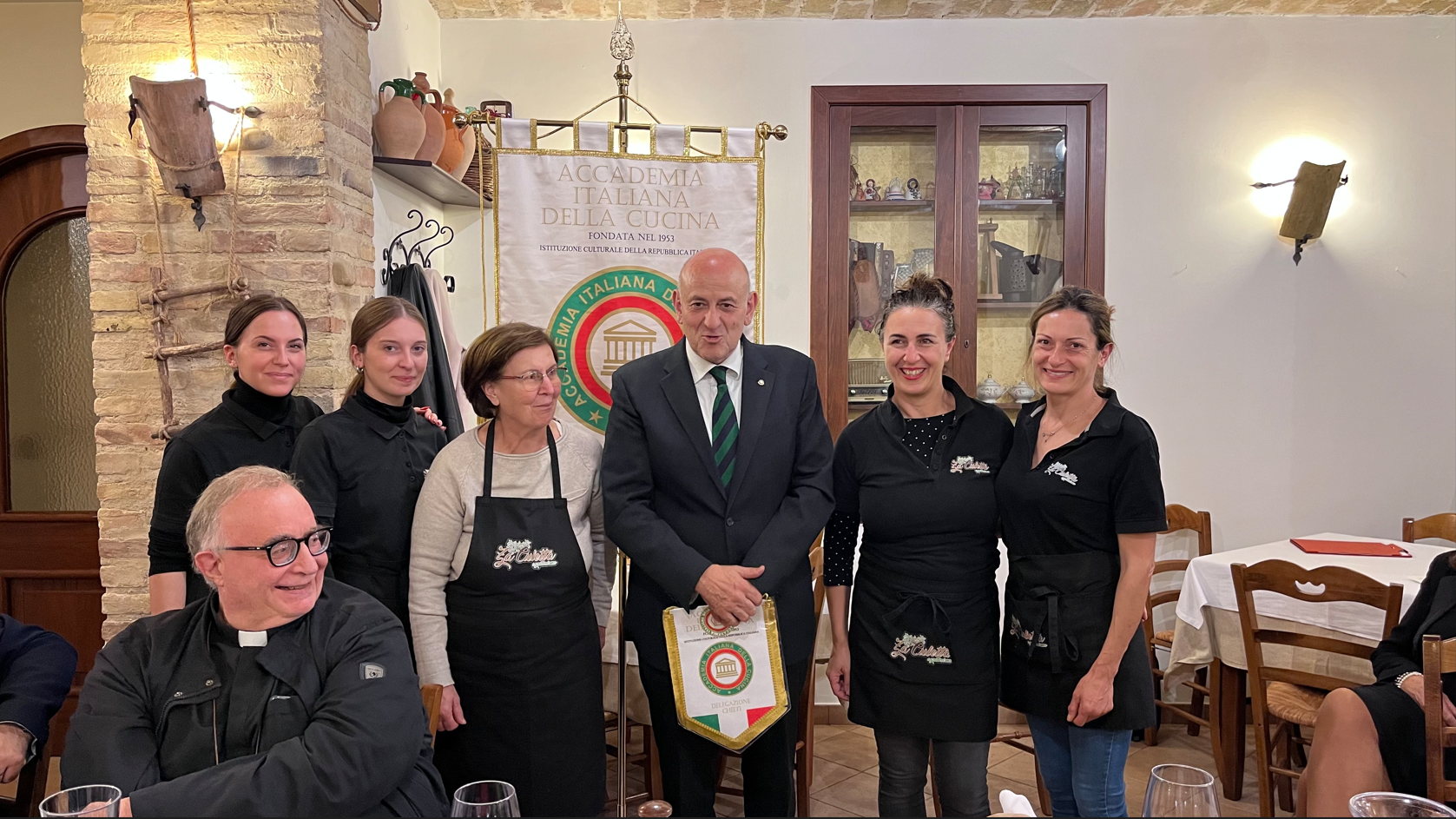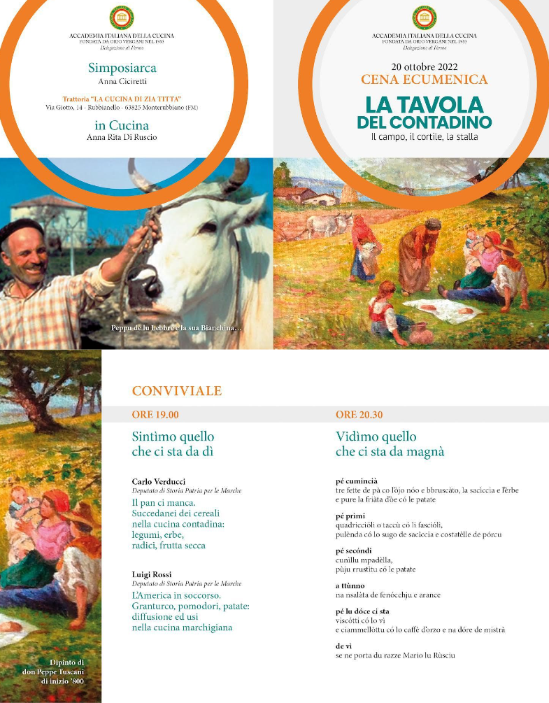 La tavola del contadino rappresenta il riferimento della cucina tipica e tradizionale del fermano. Per celebrare adeguatamente il tema, gli Accademici si sono dati appuntamento presso la Trattoria Zia Titta di Rubbianello, frazione rurale di Monterubbiano, nel cuore della valle dell’Aso, centro dell’ortofrutticoltura marchigiana dove più vive sono le tradizioni contadine. Simposiarca Anna Maria Ciciretti, membro del CST, che nel corso dell’anno aveva approfondito il tema e che con grande scrupolo e dedizione ha voluto riassumerlo ai presenti, badando alla stagionalità sia nelle preparazioni di Anna Maria Di Ruscio, titolare e cuoca della trattoria, sia nella presentazione delle stesse. La apprezzatissima cena è stata preceduta da due interessanti interventi dei professori Carlo Verducci e Luigi Rossi, entrambi Deputati di Storia Patria delle Marche. Verducci a ricordare la miseria e la povertà cui erano assoggettate le campagne sino al dopoguerra e la particolare dipendenza dagli eventi meteorologici, cagione di inenarrabili carestie. Luigi Rossi ha tracciato la storia dell’introduzione nella regione della non facile coltivazione di tre prodotti oggi di largo consumo provenienti dalle Americhe e soprattutto del loro sfruttamento per piatti oggi diventati tradizionali. Un plauso alla cuoca Anna Maria Di Ruscio che ha saputo riproporre prodotti, sapori e sentori della storia culinaria del territorio con semplicità e sapienza.