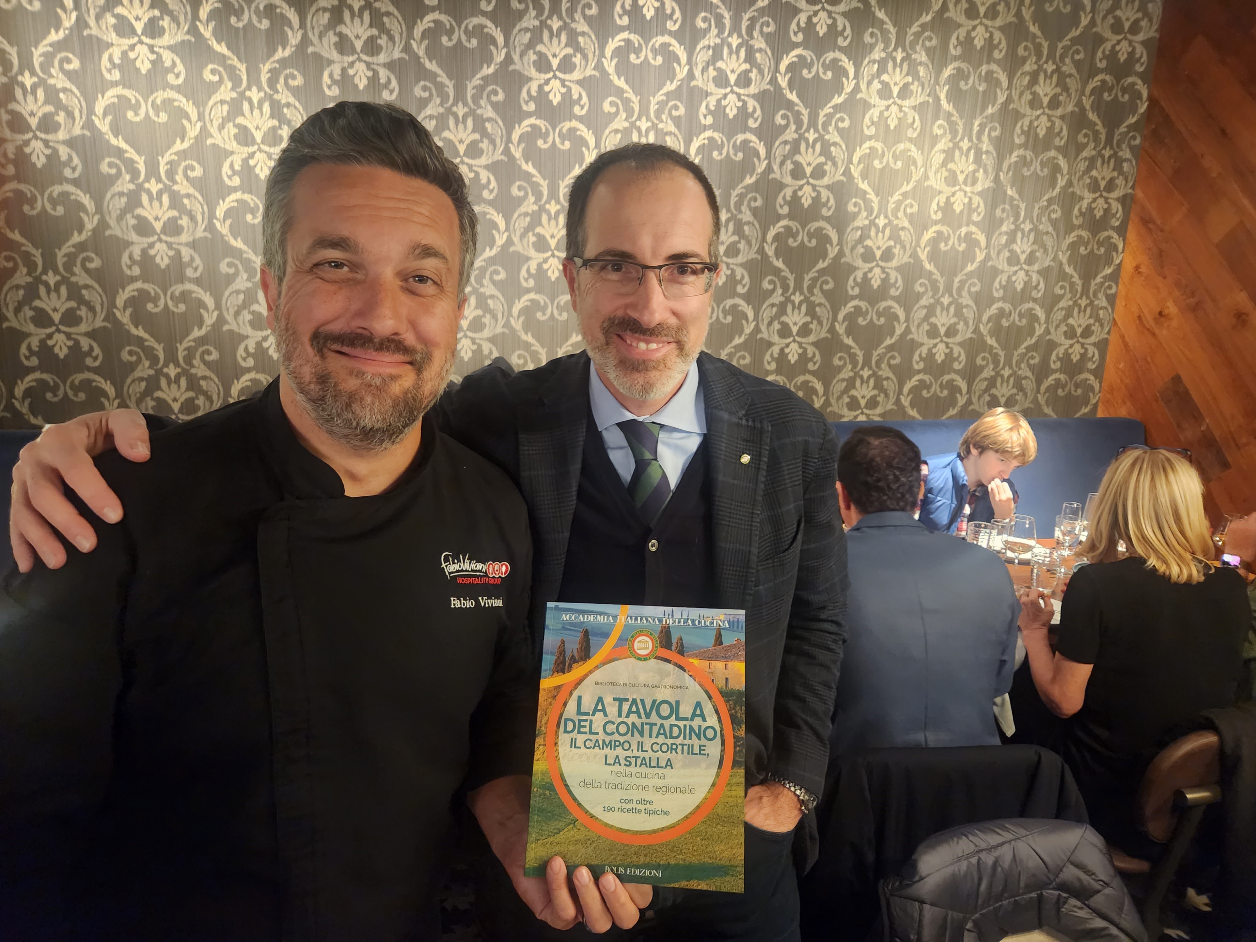 Per l’annuale Cena Ecumenica, la Legazione di Chicago si è riunita al ristorante Curfew, recentemente aperto dallo chef toscano Fabio Viviani. Chef Viviani gode di notevole popolarità negli USA, essendo stato protagonista in due stagioni del programma televisivo “Top Chef” sul canale Food Network. Ispirati dal tema della cucina del contadino, i partecipanti hanno apprezzato la cena che includeva, tra le altre pietanze, un’originale pinza alla zucca arrostita come antipasto, un’insalata di biete e finocchi con formaggio tenero di capra, orecchiette con petto di manzo brasato, carni e verdure alla griglia, il tutto accompagnato da vini italiani ed americani a simboleggiare il percorso gastronomico dello chef. Vista la qualità del cibo e del servizio, gli Accademici hanno deciso unanimemente di segnalare il ristorante Curfew per la Guida alle Buone Tavole. Chef Viviani è intervenuto alla serata ringraziando i venti partecipanti e parlando delle sue ispirazioni nella cucina contadina italiana. L’Accademico Andrea Farris, Simposiarca della serata, ha donato allo chef una copia del libro “La tavola del contadino. Il campo, il cortile, la stalla” edito dall’Accademia (foto). Nell’occasione, il Legato Michele Gambera ha presentato i due nuovi candidati Accademici Micaela Della Torre e Kenneth Caniglia.