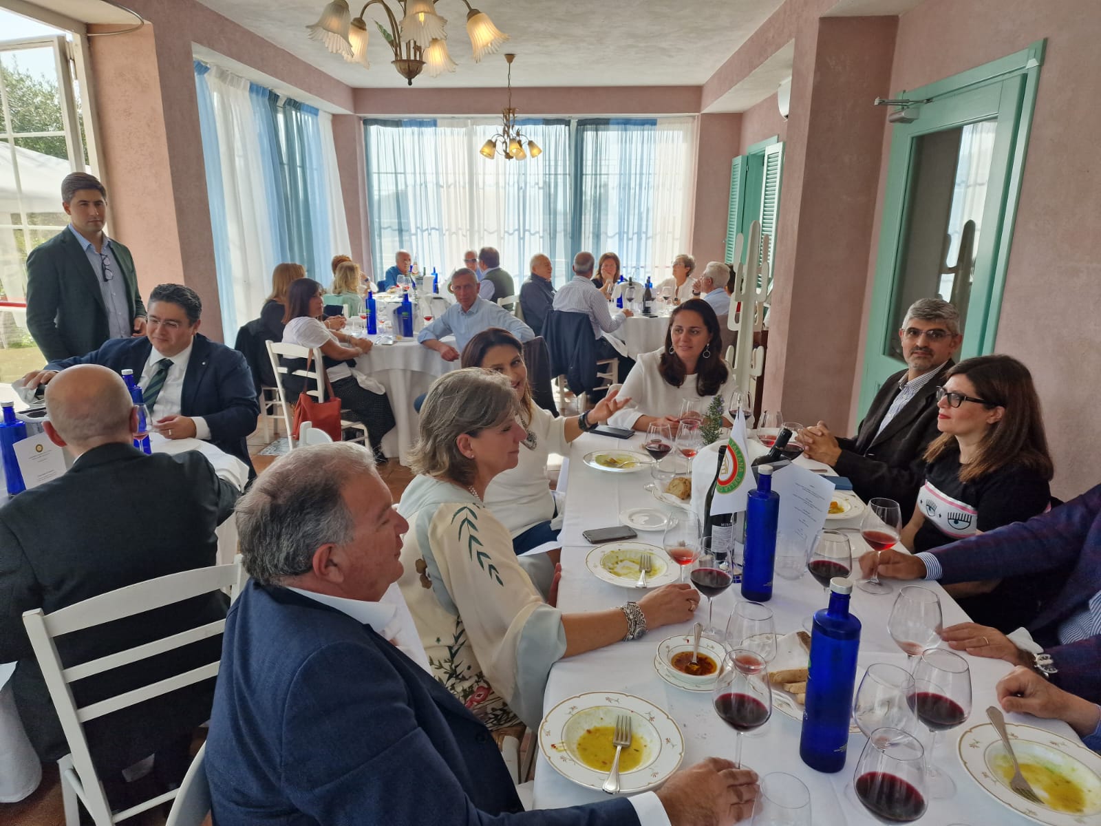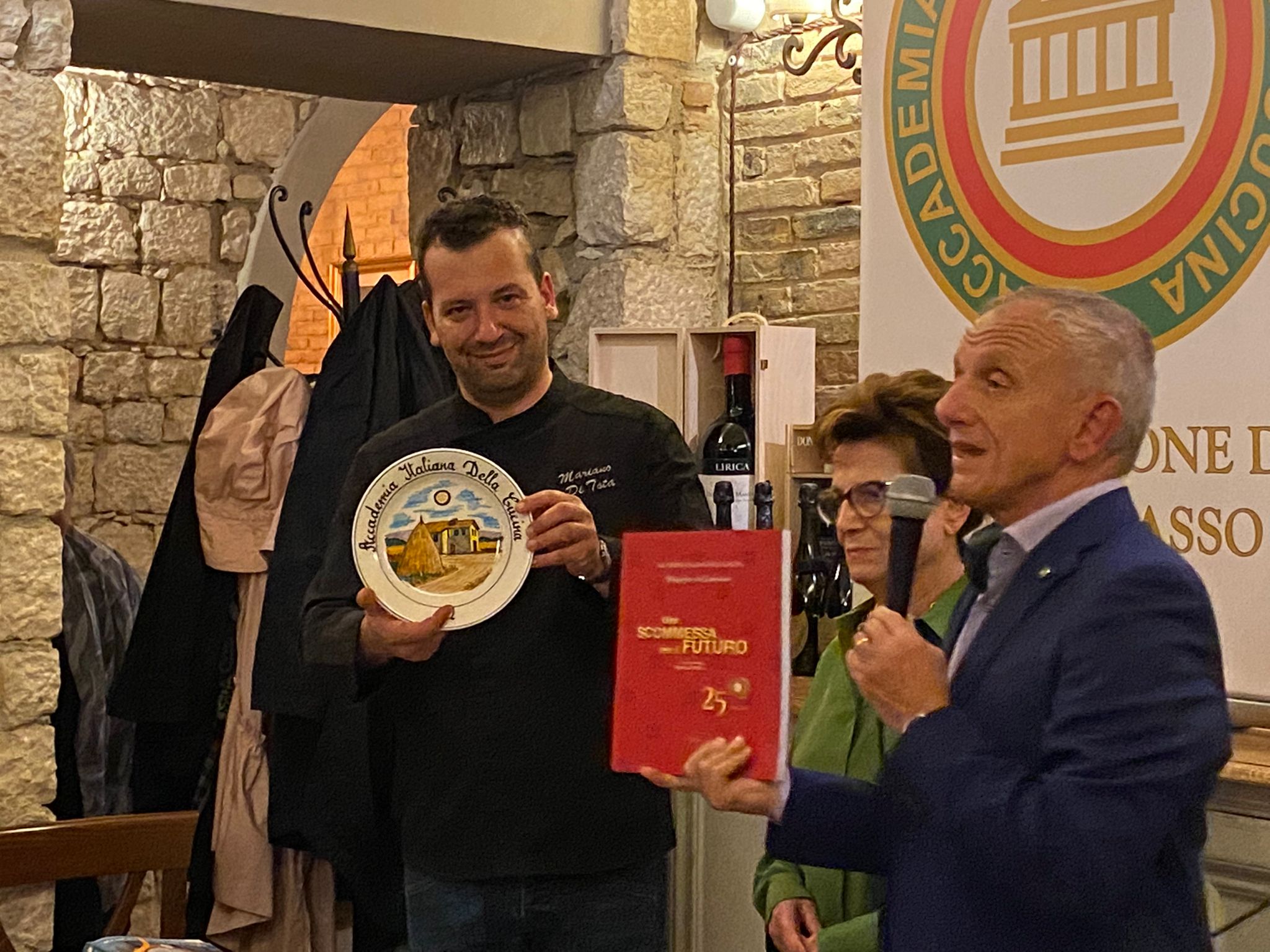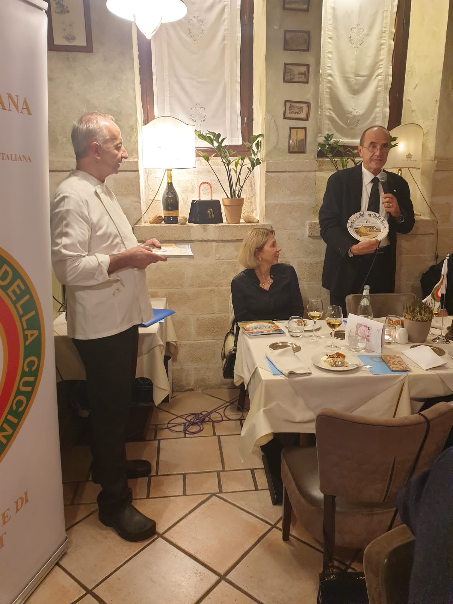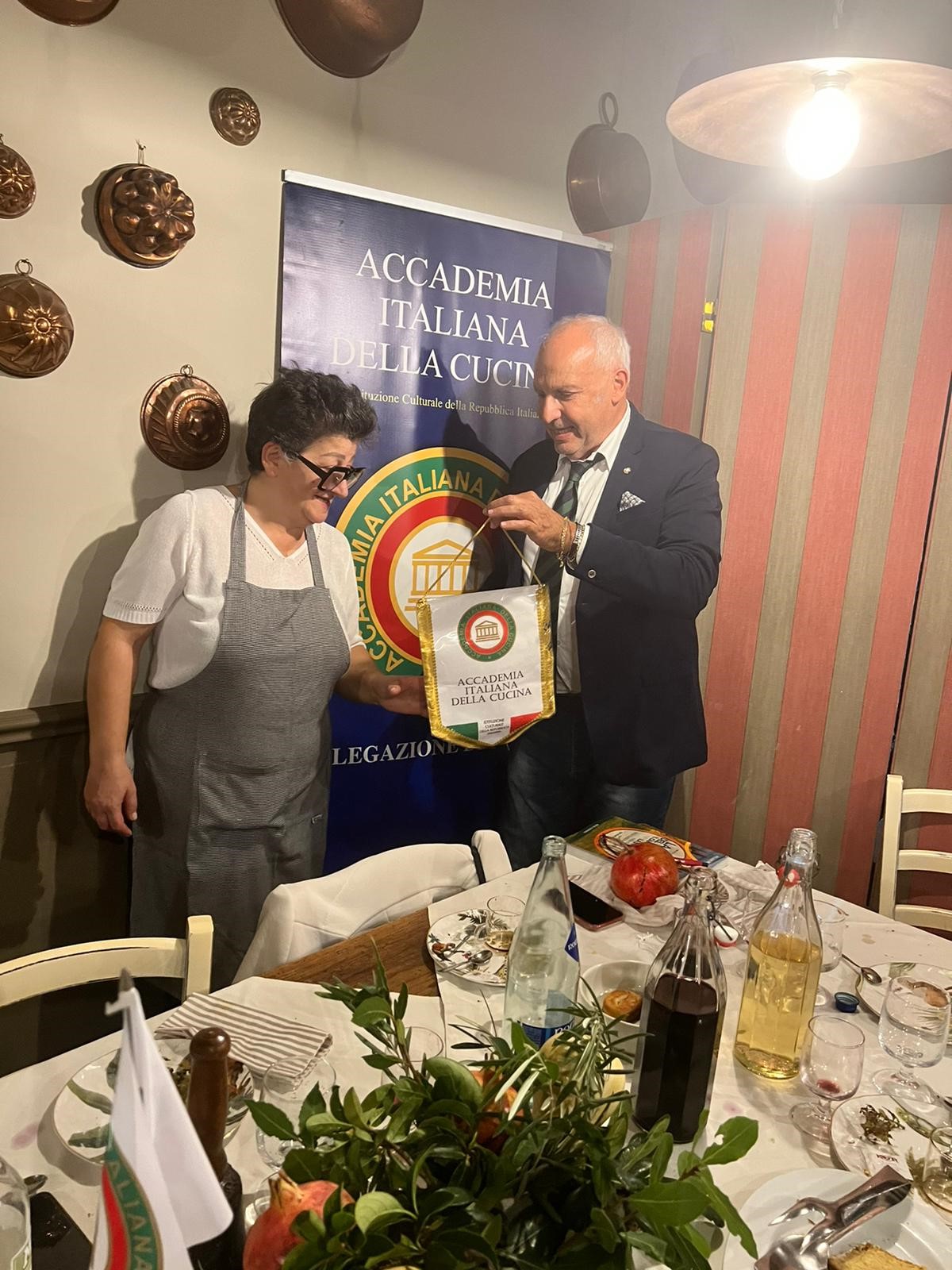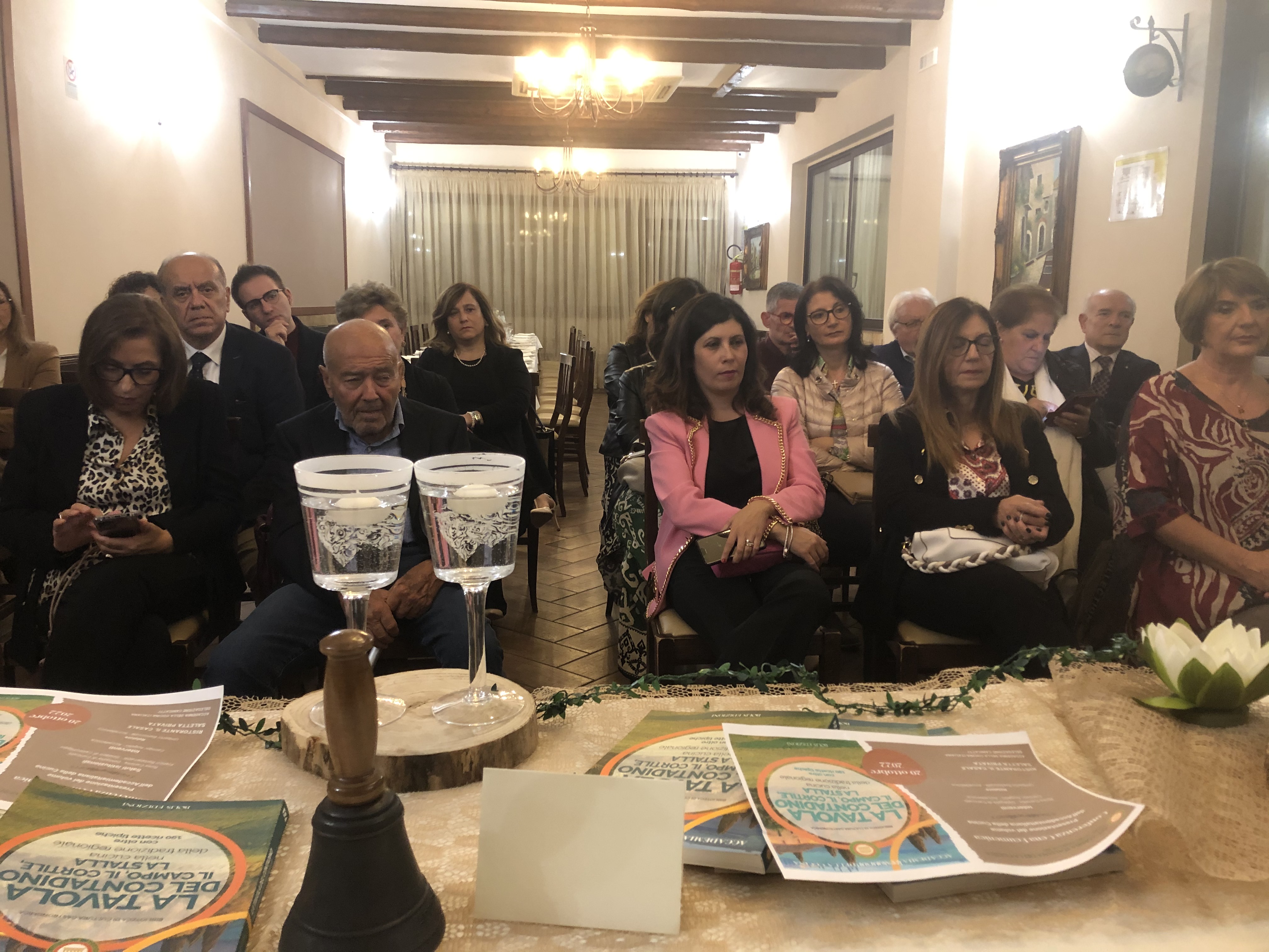 Provare a restituire il giusto rilievo ad una cucina nata povera per necessità e disponibilità, ma straordinariamente ricca di inventiva e sapiente manualità, ha costituito la traccia lungo quale è stata sviluppata l’organizzazione della Conviviale Ecumenica. Presentazione a due voci da parte del DCST Ottavio Cavalcanti e del Delegato Rosario Branda che hanno avuto modo di evidenziare come, in un tempo in un tempo frastornato da una letteratura invasiva, contraddittoria e spesso poco affidabile, sorpreso da repentini cambiamenti ambientali e climatici, siano tornati di grande attualità concetti quali genuinità, salubrità, sostenibilità ed equilibrio nutrizionale che sono da sempre i tratti distintivi del tema dell’anno. La località amena del Resort Borgo Rosso di Sera, immerso nel verde e sospeso tra mare e collina, ha fatto da cornice al partecipato momento conviviale (foto 1), allietato in maniera sapiente dalla cucina (foto 2) fino alla presentazione dei dolci (foto 3). Con applausi la consegna del guidoncino dell’Accademia al titolare Cosimo De Tommaso (foto 4).