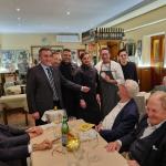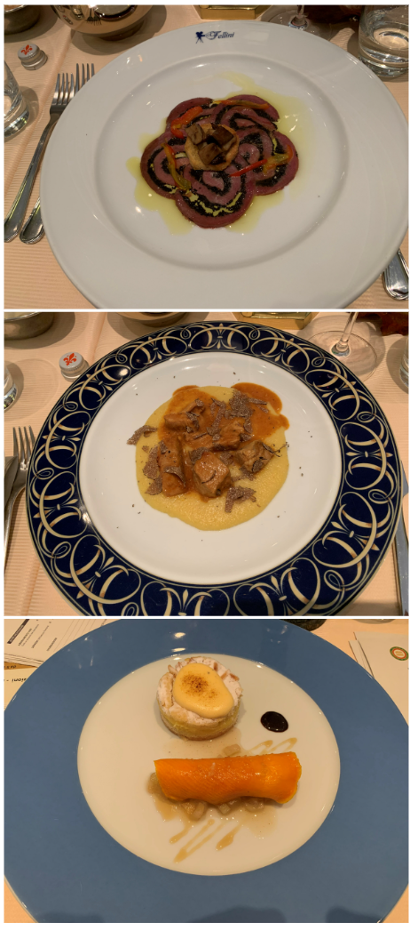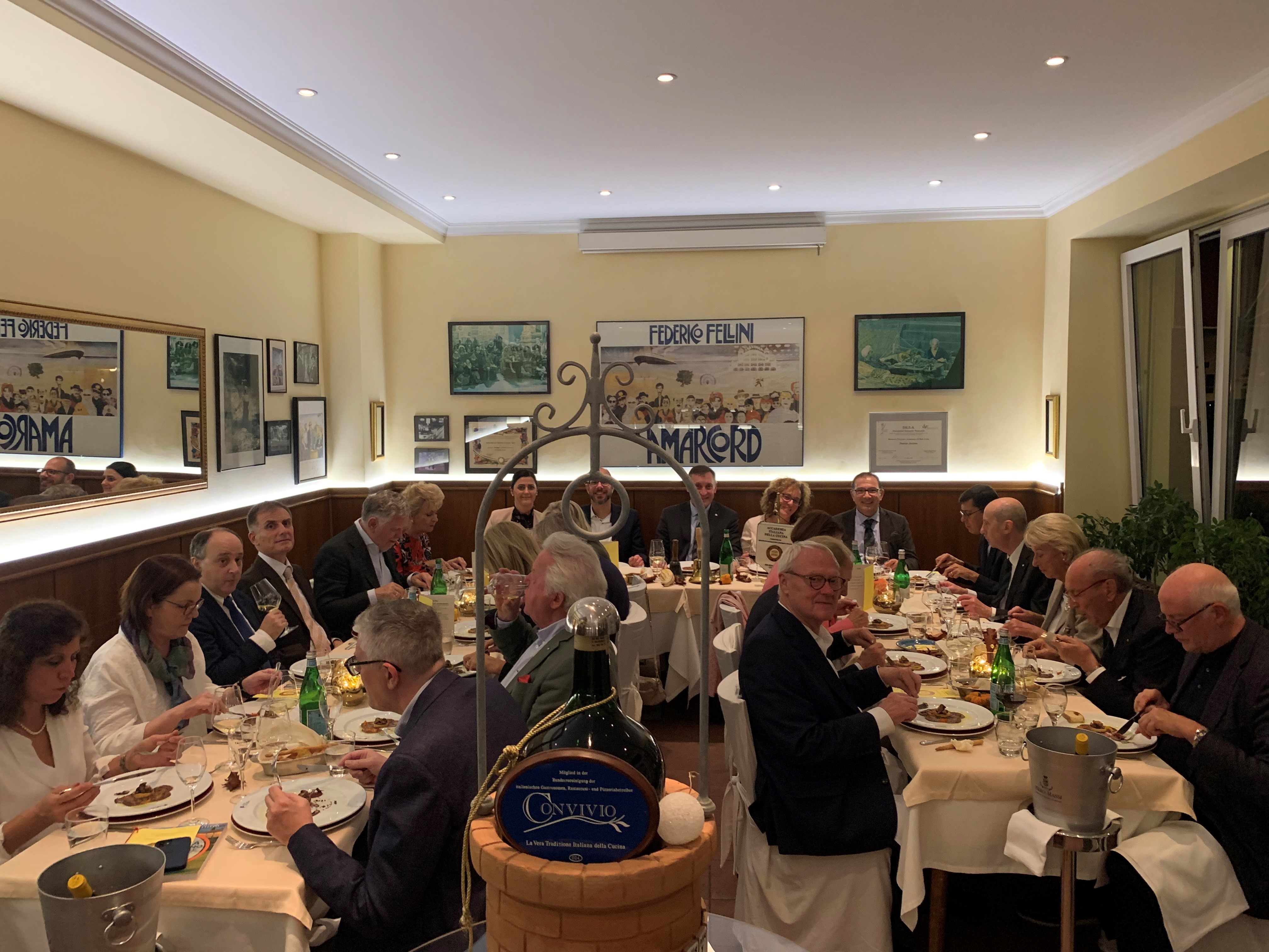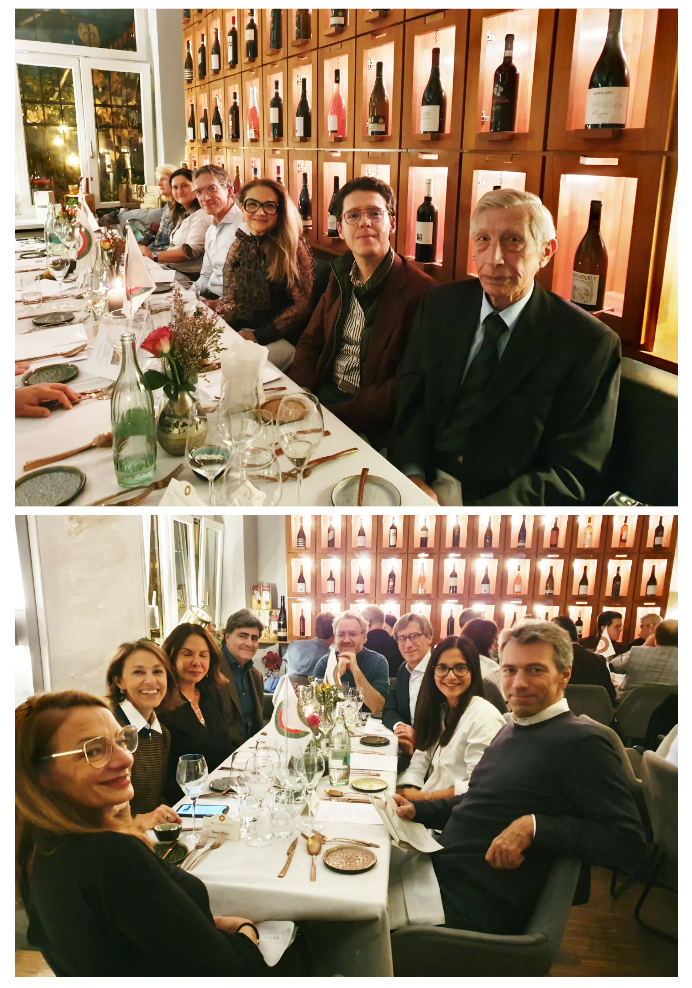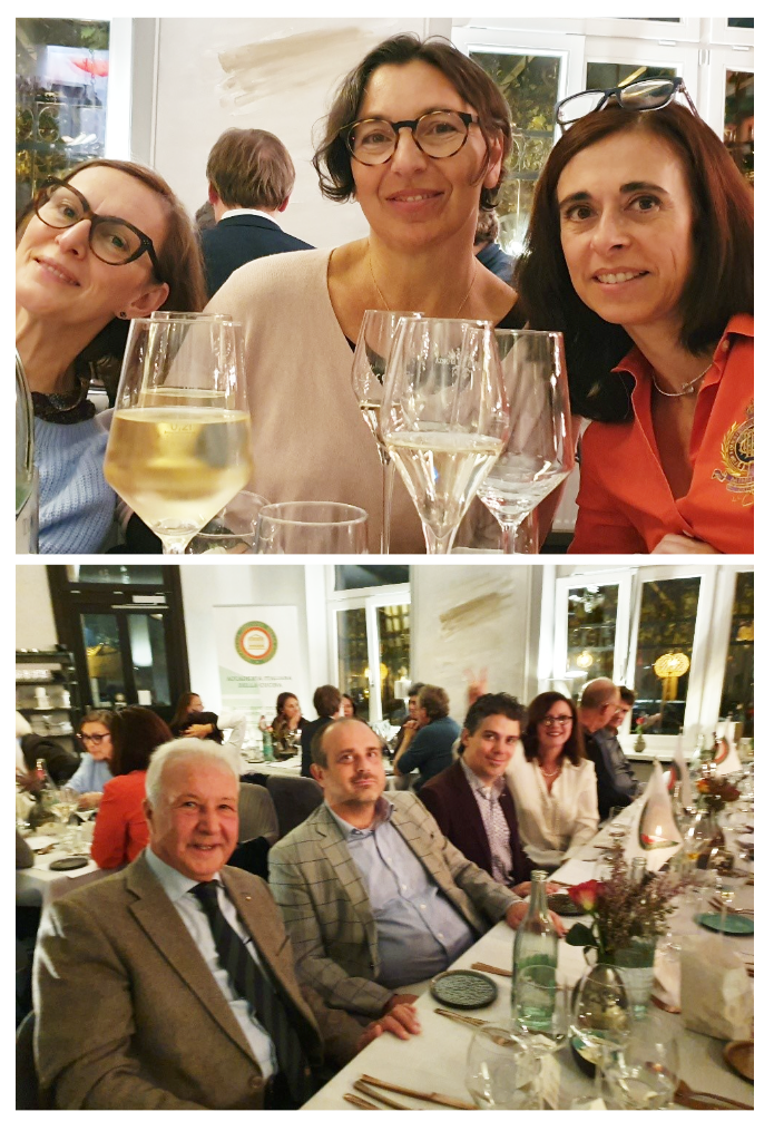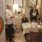 Ecumenica della Delegazione di Colonia presso il ristorante “Fellini”, dove lo chef Nunzio Ascione ha preparato un gustosissimo menu che ha magnificamente rispecchiato il tema di questo anno. Dopo un breve discorso del Delegato cha ha evidenziato il significato e l’importanza della Cena Ecumenica nell’ambito delle attività della Delegazione ed un caloroso saluto a tre nuovi Accademici, tra cui il Console Generale a Colonia Luis Cavalieri, si è passati a degustare il menu ispirato alla tradizione contadina della Toscana. Ogni piatto è stato preceduto da una descrizione delle sue origini e della preparazione. Una serata resa memorabile anche dall’accoglienza e cortesia del personale del ristorante. Le valutazioni date dagli Accademici sono state molto soddisfacenti e si è pertanto consegnata la vetrofania dell’Accademia al ristorante. Foto 1. Accademici a tavola. Foto 2. Da sinistra: il Console Generale Luis Cavalieri, al centro in piedi il Delegato Vincenzo Pennetta e il nuovo Accademico Fabrizio Picchioni. Foto 3. La consegna della vetrofania. Foto 4. Dal menu: Carpaccio di anatra di cortile con peperoni brasati in padella e profumato con tartufo di San Miniato; spezzatino di Cinta senese con polenta; cannolo di zucca con ripieno di ricotta di bufala e torta della nonna.