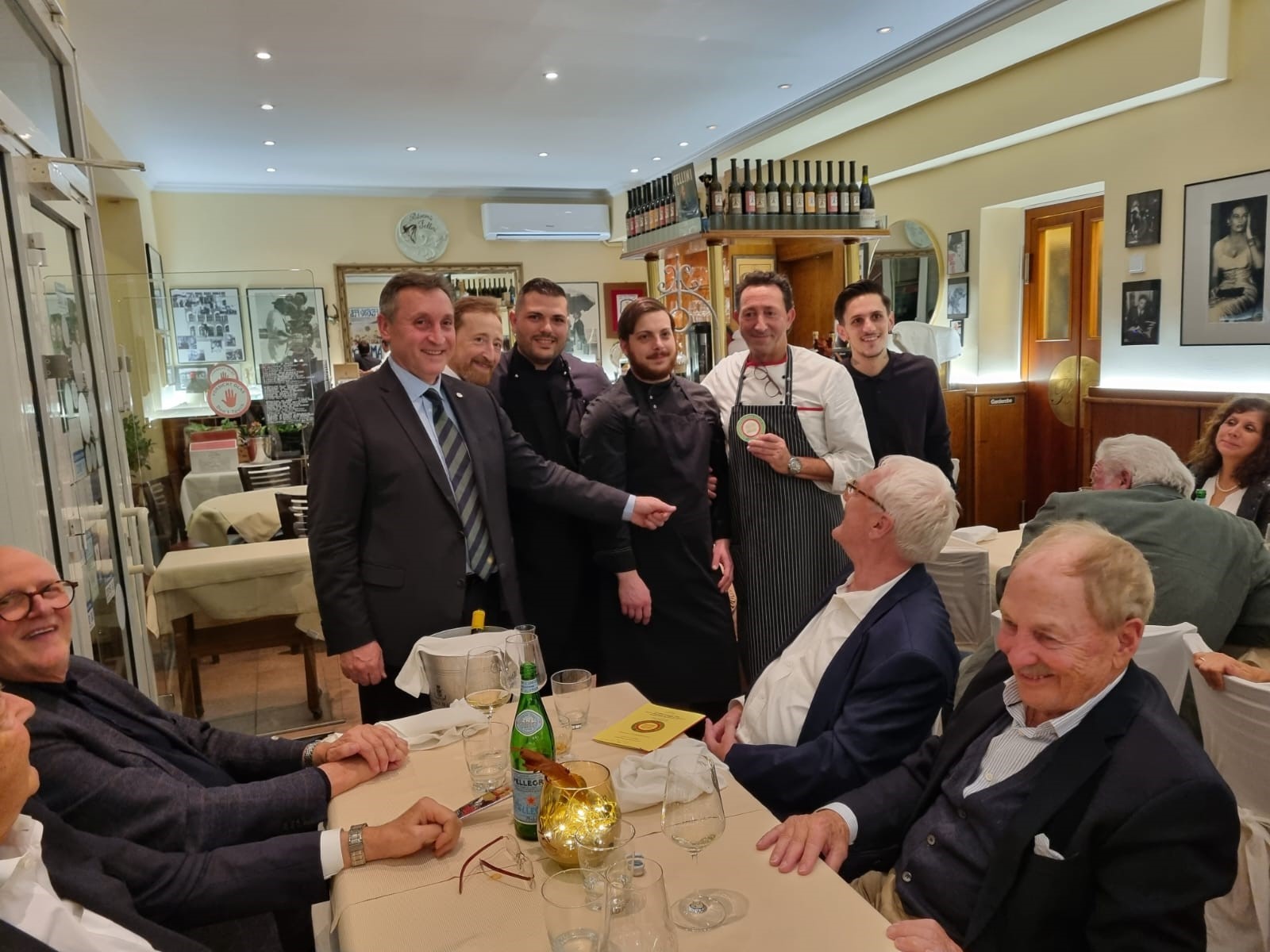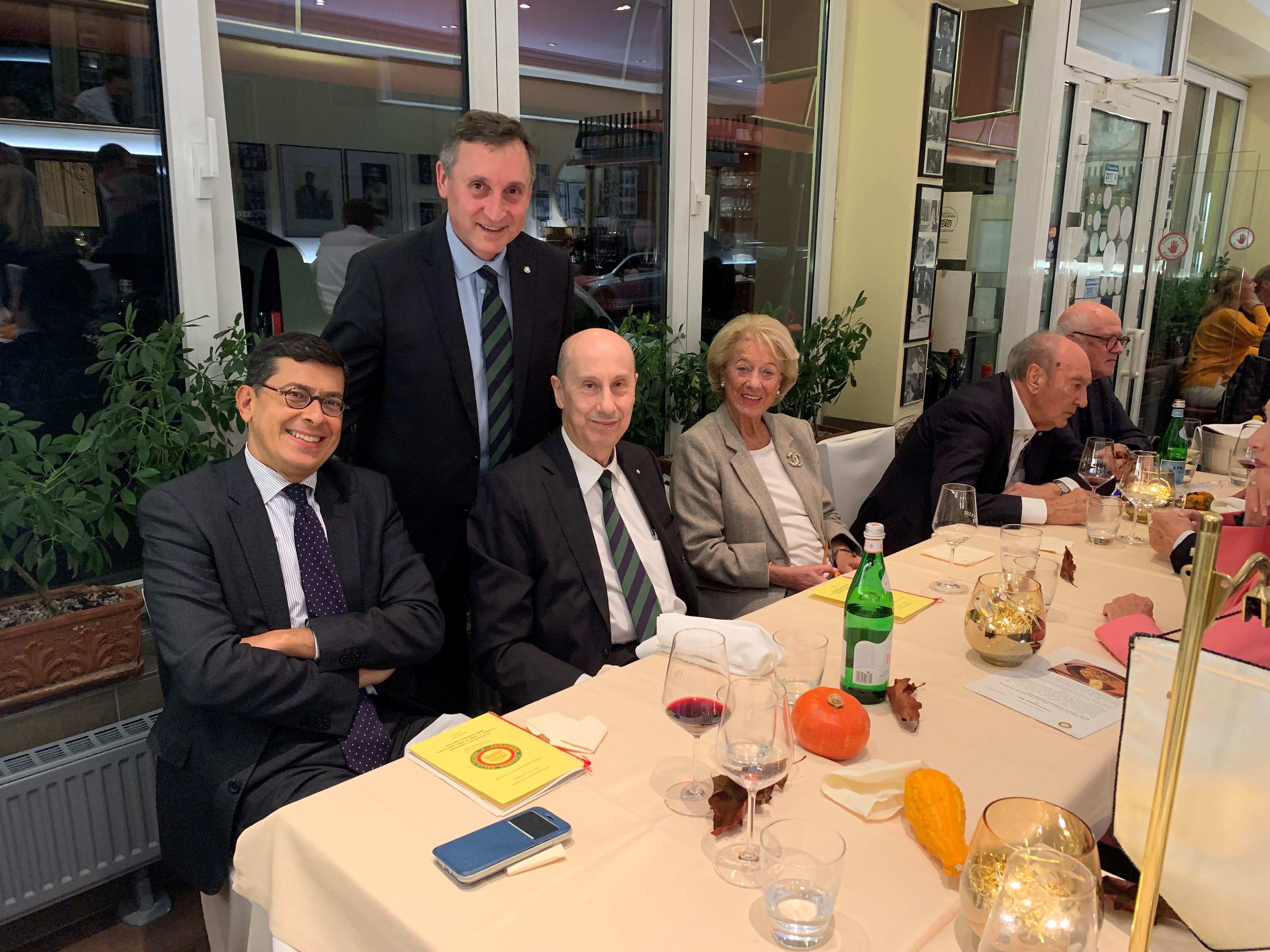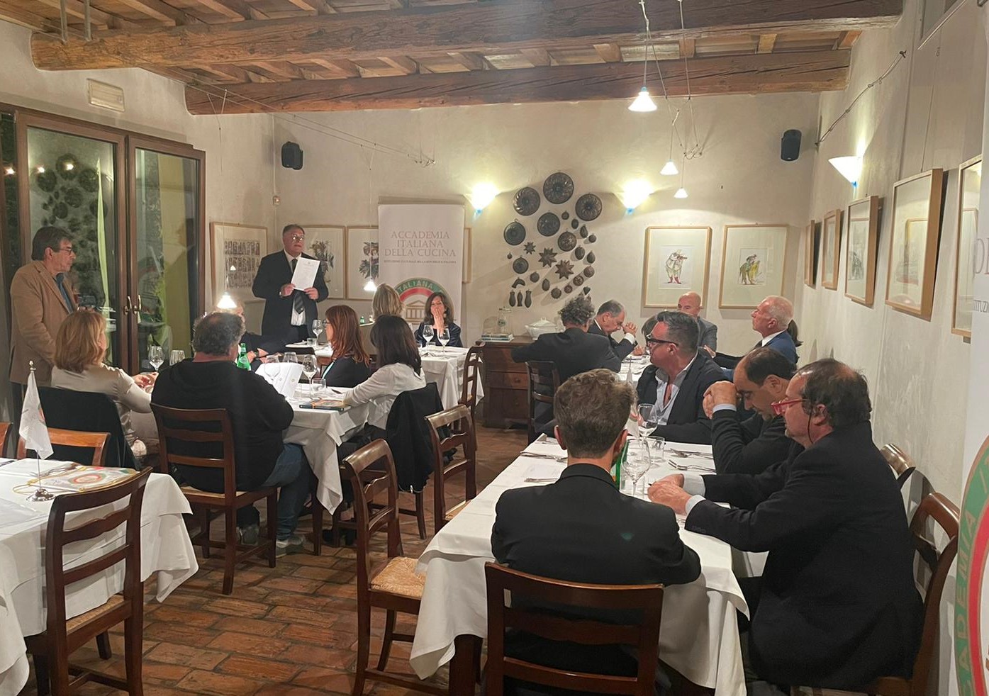Una magnifica serata al ristorante “Quintino” con numerosi ospiti - tra i quali Piero e Zena Marchettini-Jeanbart Delegata della Suisse Romande, artisti, docenti universitari, professionisti - entusiasti dell’accoglienza, del servizio a tavola e della bontà di quanto servito in quantità misurate ma da soddisfare ogni appetito. La relazione d'introduzione al tema è stata fatta dal Delegato Alessandro Caponi. I Simposiarchi, Vice Delegato Renzo Baldino e Delegato Caponi, hanno voluto proporre un insieme di ricette che rappresentassero armoniosamente la Tavola del Contadino, spigolandole dalle culture di diverse regioni d’Italia. Il menu è stato realizzato dai due chef Guido Quintino e Domenico Gurnari che fanno onore alla migliore cucina italiana. È stata sottolineata la corrispondenza alle ricette originali. Di gradimento generale il ragù di carne di maiale e l’equilibrio delle forze della salsa del pollo alla cacciatora con quella agro-dolce della caponata. Anche gli abbinamenti dei vini sono stati da tutti graditi. Dulcis in fundo, la torta di frutta di stagione in cui sono stati utilizzati anche frutti esotici provenienti da culture siciliane.