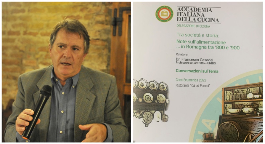 La cena ecumenica della Delegazione di Cesena si è svolta presso il Ristorante “Ca’ ad Pancot”, accogliente locale della campagna cesenate, che da sempre propone piatti della cucina romagnola tradizionale. Il Simposiarca Francesco Capozzi ha interpretato il tema ecumenico proponendo una apprezzata sequenza di piatti ispirati alla tavola contadina, serviti per la speciale occasione nella suggestiva antica stalla del ristorante (Foto 1, 2). Nel corso della conviviale il relatore Francesco Casadei, professore a contratto di Storia dell’alimentazione presso il Campus di Cesena dell’Università di Bologna, ha intrattenuto i presenti con una brillante conversazione sul tema “Tra società e storia: note sull’alimentazione in Romagna tra ‘800 e ‘900”, a cui ha fatto seguito un interessante dibattito sulle condizioni di vita delle classi agricole del passato (Foto 3). La serata si è svolta in un’atmosfera allegra e festosa. Al termine, il Delegato ha consegnato al titolare Christian Montevecchi e alla brigata di cucina il guidoncino della Delegazione e il volume dell’Accademia dedicato alla “Tavola del contadino” (foto 4).